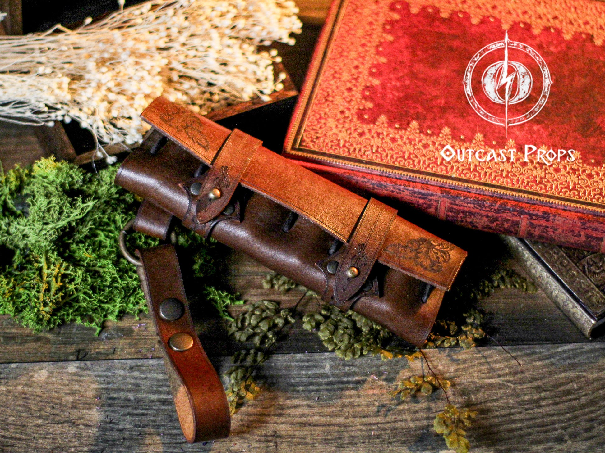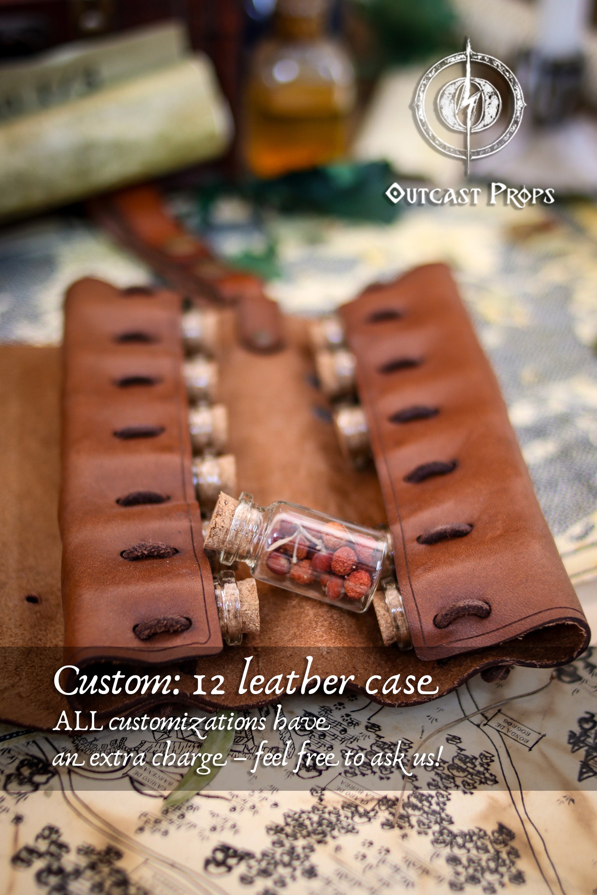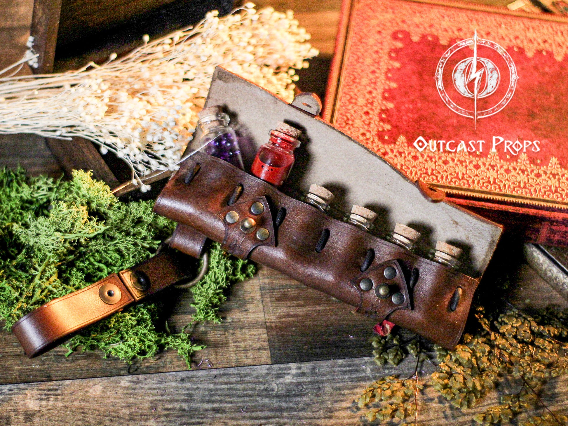 Made out of 100% veg tanned leather, hand worked and dyed in our workshop. Vials are safely secured in place thanks to our tight pattern so they do not fall down when you run or pass acrobatic checks with them, but the bottles will come out swiftly at your fingers' command.