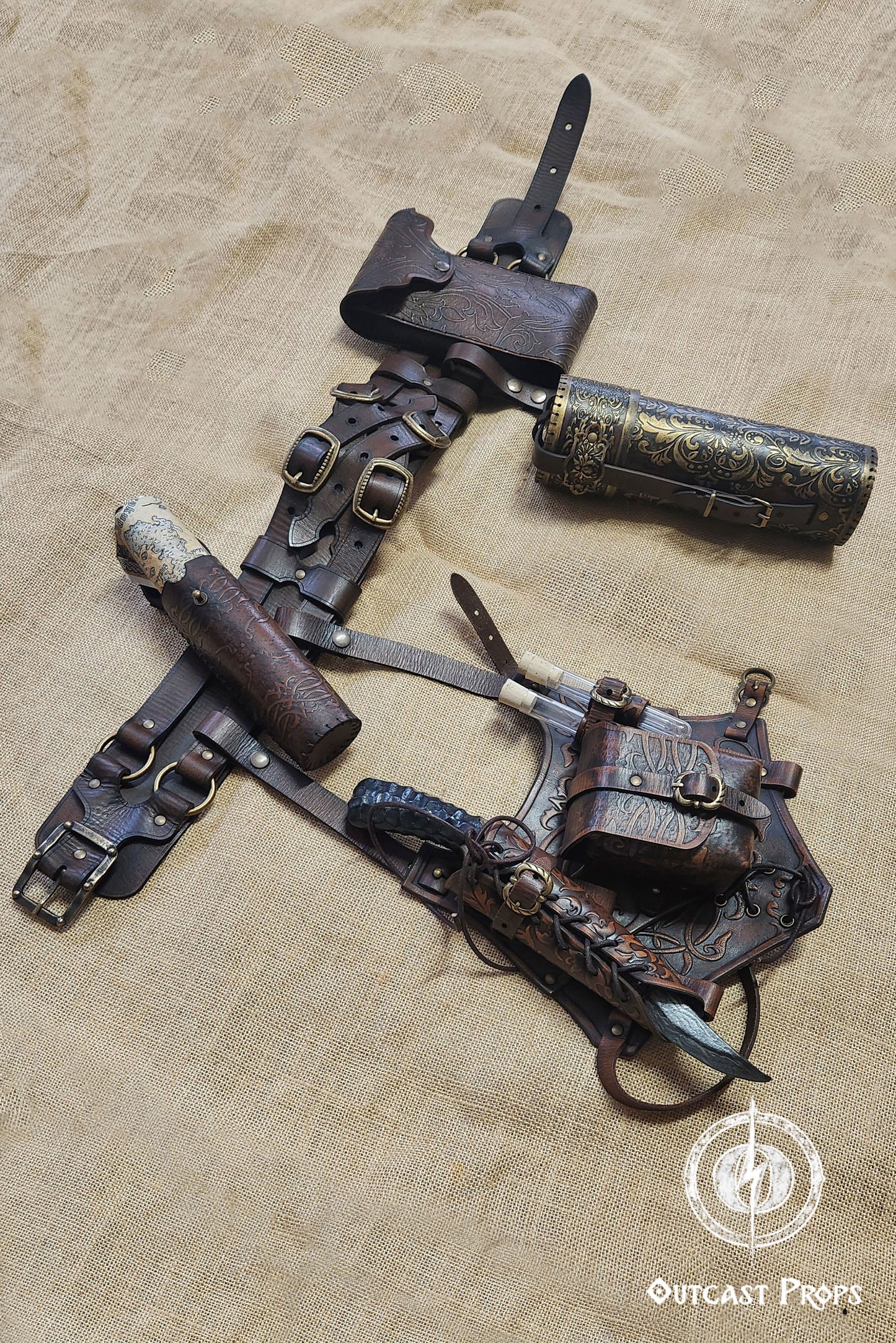 Designed for warriors, rogues, and alchemists alike, this modular thigh harness allows you to carry essential accessories in style. Whether you need a potion holder, scroll case, dagger sheath, or belt pouch, this system adapts to your needs, making it a must-have for LARP, cosplay, and medieval fairs.