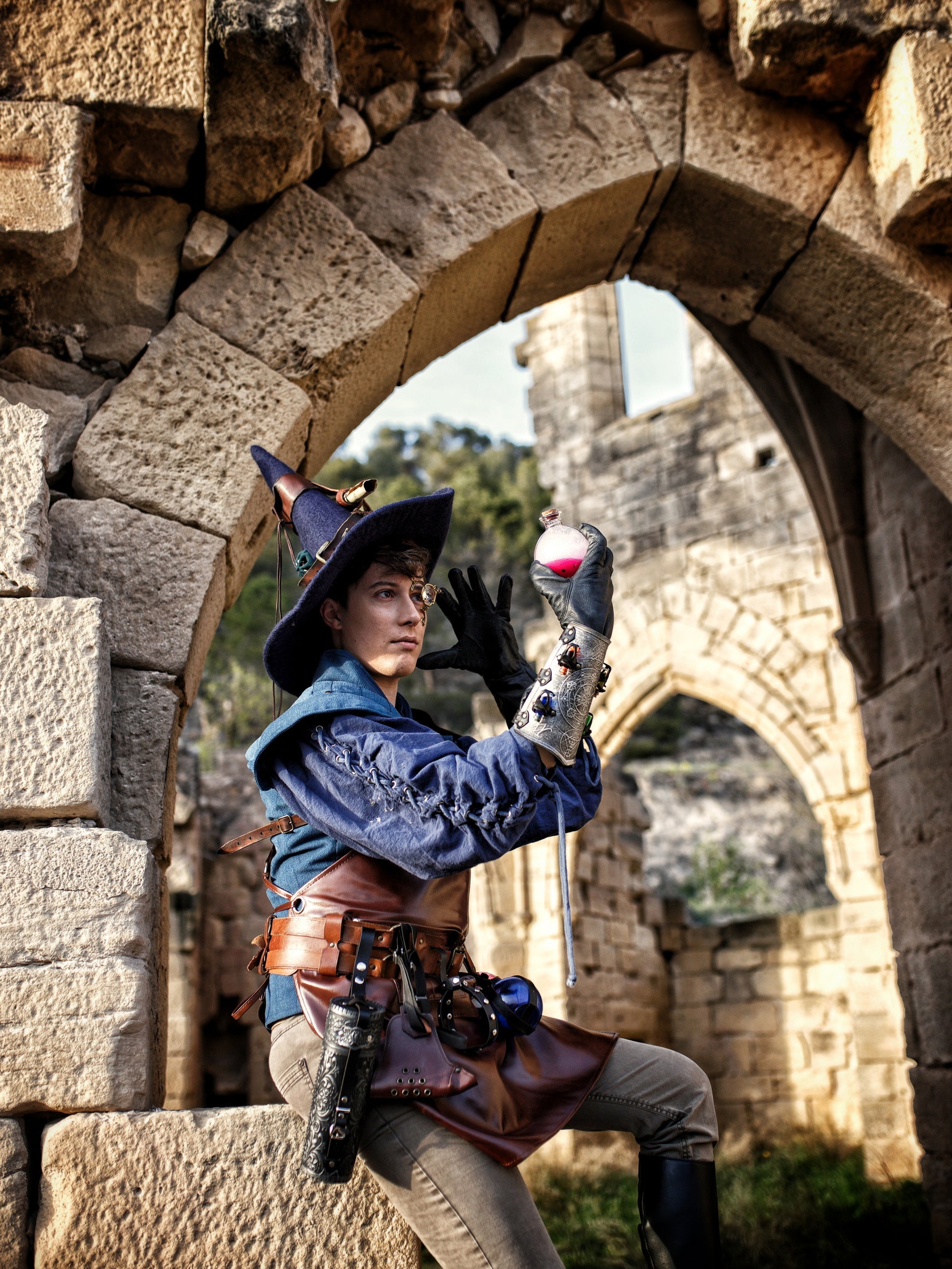 The Alchemist Bracers, crafted from premium leather and meticulously dyed by hand using natural vegetable dyes. Each bracer is adorned with sturdy metal rivets and leather straps, ensuring a secure fit around the forearm.