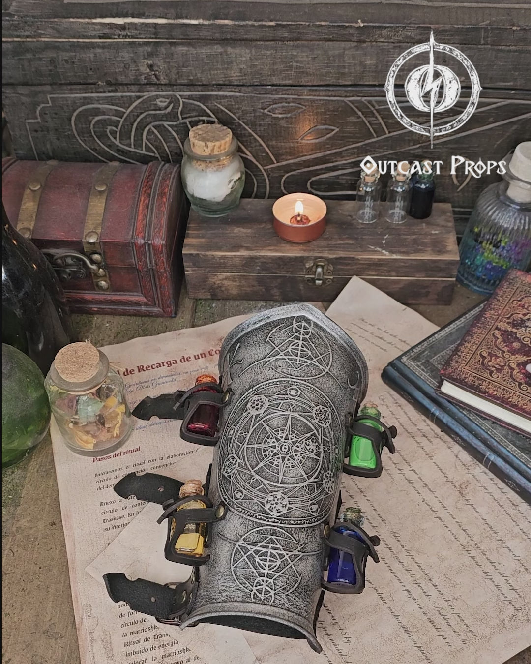While most bracers on the market cater to warriors, we believe that magicians and alchemists deserve accessories that reflect their mystical craft. That's why we've designed these bracers with protective elements and intricate alchemical circles, complete with four small glass vials to house your favorite potions, poisons, and elixirs.