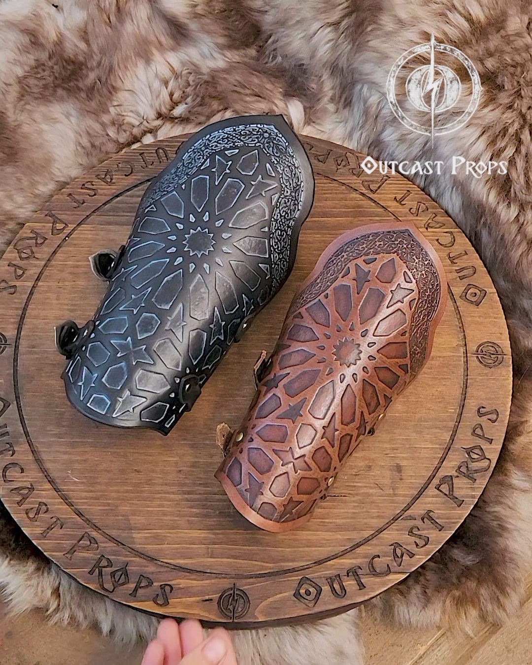 Each pair is crafted from high-quality Spanish full-grain vegetable-tanned leather, and carefully tooled, dyed, and painted by hand. The engraved geometric patterns are inspired by the architectural beauty of the Alhambra mosaics. Their surface is finished using Outcast Props’ signature ageing and epic painting techniques, making each pair one of a kind.