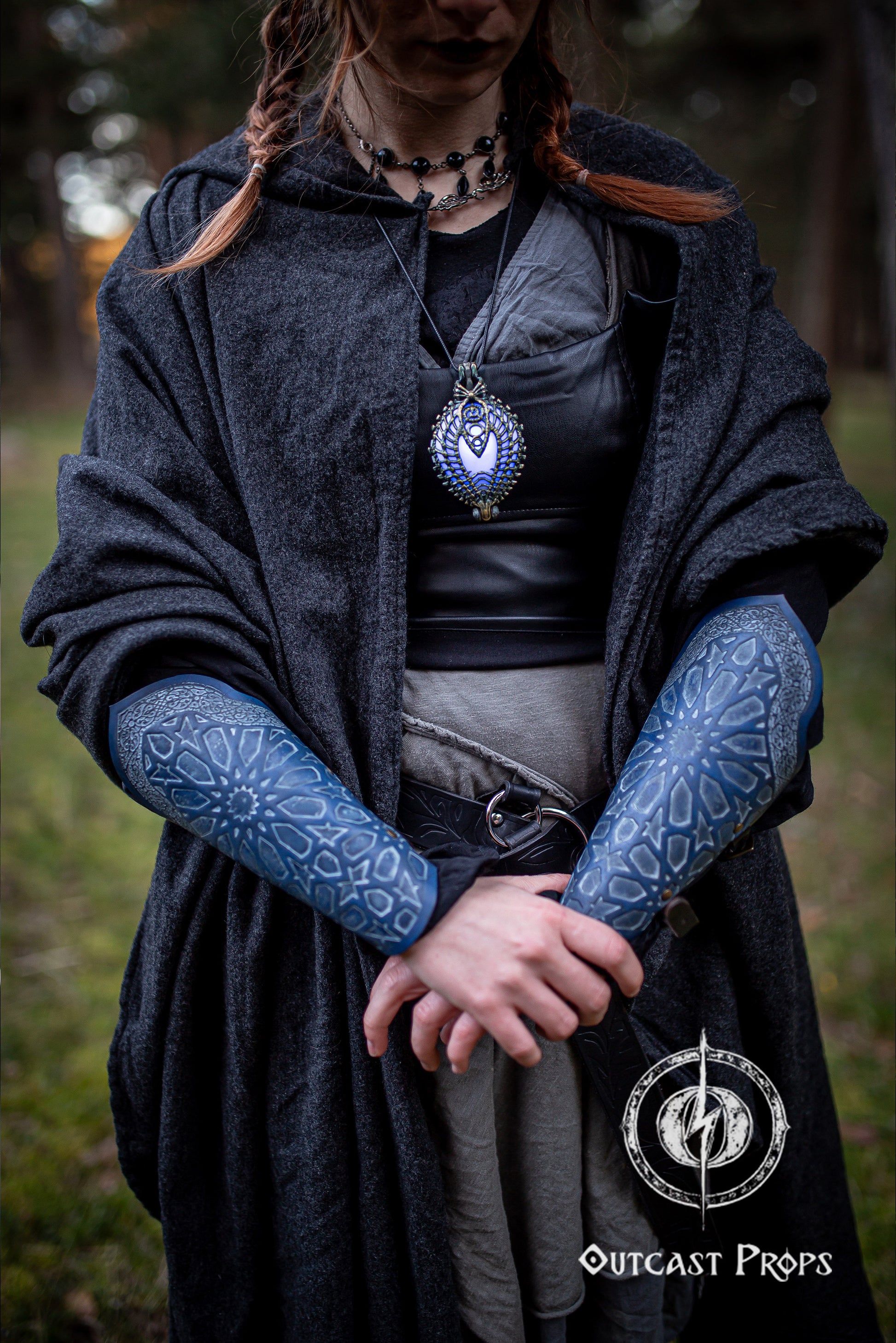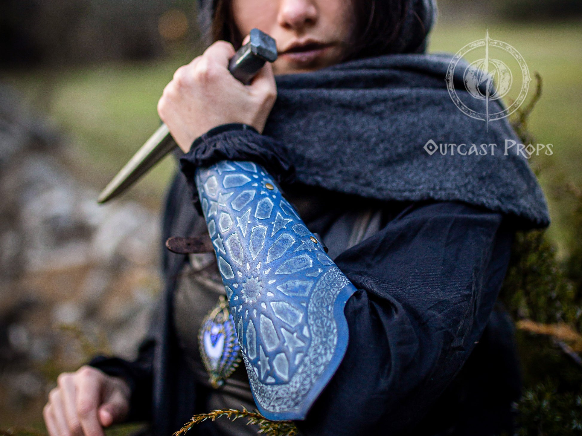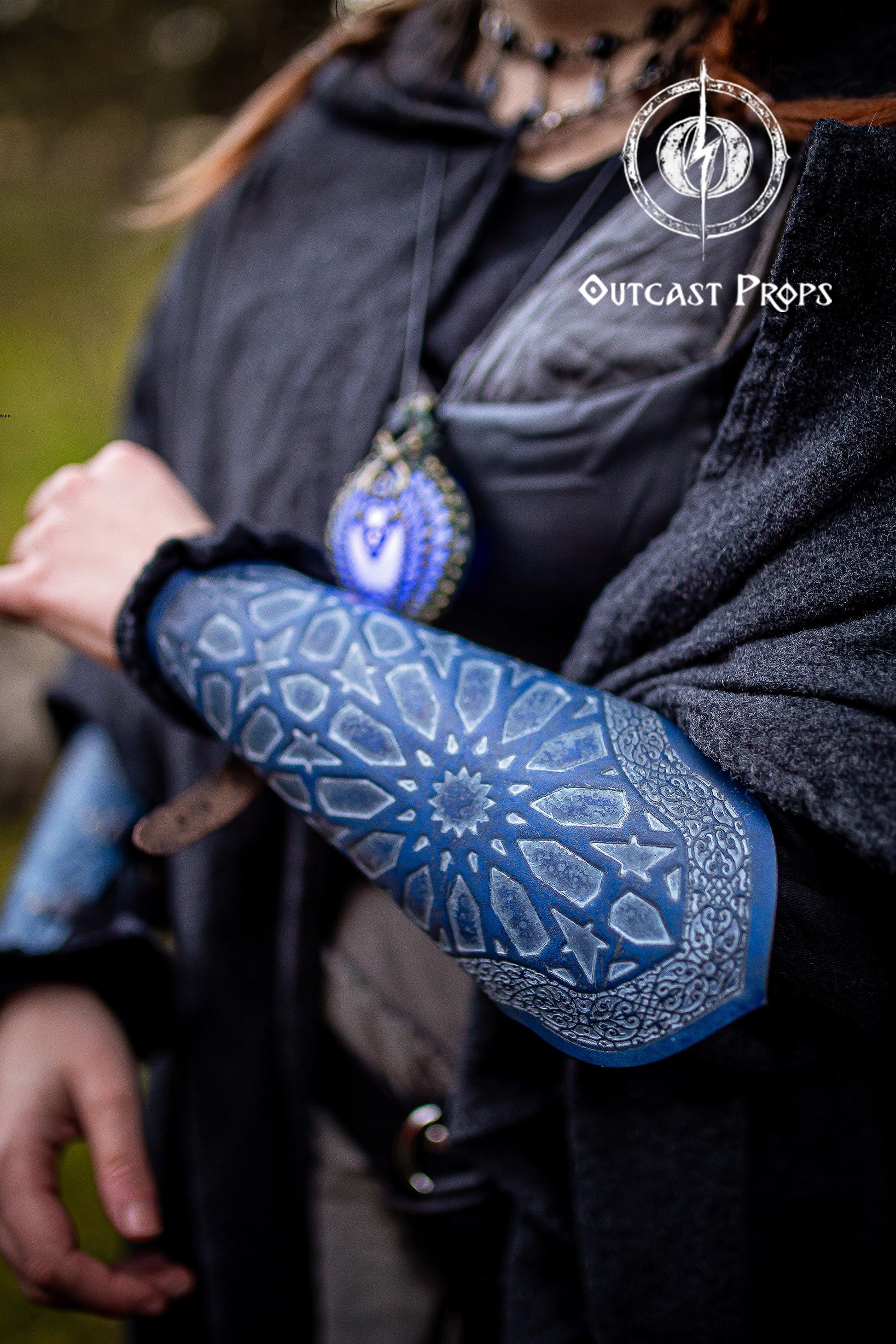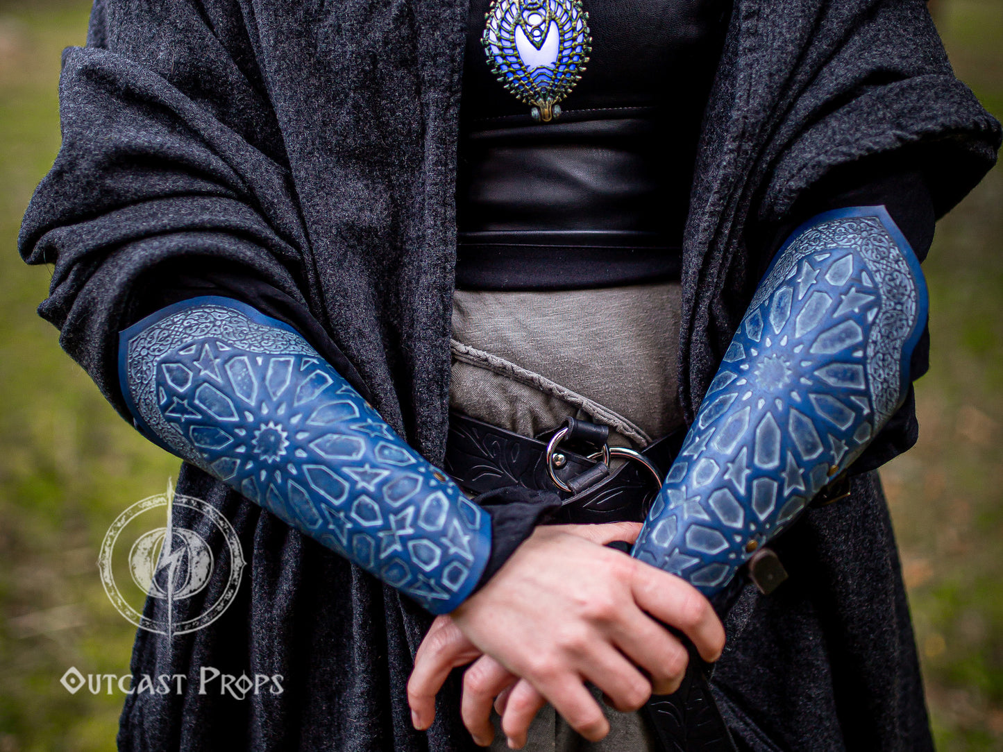 Strike from the shadows with these Assassin Leather Bracers, designed for stealthy characters and deadly elegance. Inspired by Arabic geometric patterns and dyed in deep midnight blue, these handcrafted bracers are made for rogues, spies, killers and vigilantes in LARP, tabletop games, or fantasy cosplay.