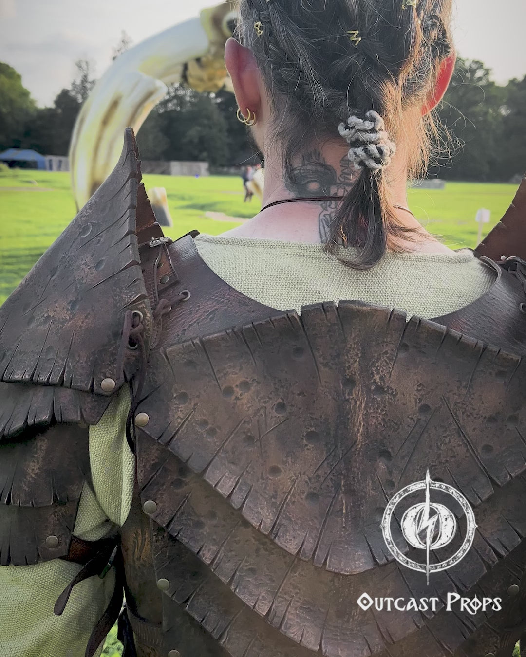 Crafted from thick 5 mm (0.2 in) full-grain, premium vegetable-tanned leather, this pauldron features a flexible structure for comfort and endurance. Each scale is aged and hand-dyed using Outcast Props’ unique aging techniques and epic painting, achieving a weathered, battle-worn finish worthy of legendary warriors. The pauldrons attach to the harness with leather cords, ensuring secure fit and natural shoulder movement.