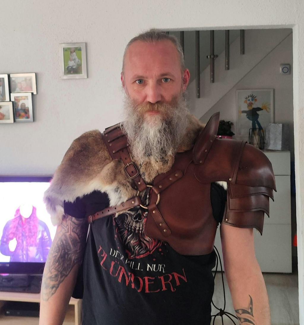 The set is fully modular and adjustable by straps. You can wear just the harness, add the shoulder armor, attach the fur mantle for a wilder look, or include the sword sheath for a complete warrior setup. The fur piece can also be used separately for other costumes or characters.