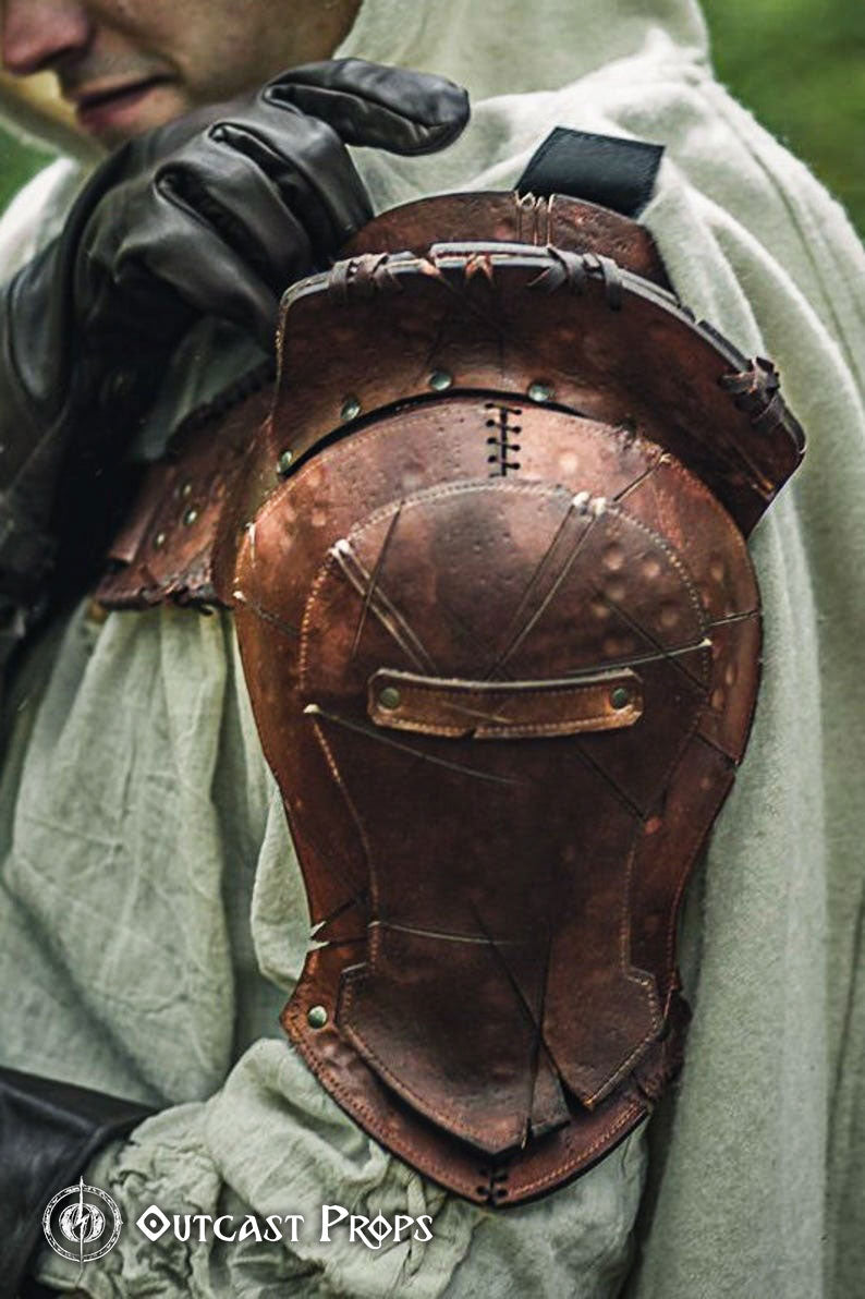 The pauldron is one-size-fits-all thanks to an adjustable leather harness. It’s designed to sit comfortably over the shoulder and upper arm, and is secured around the chest and bicep with buckled straps.