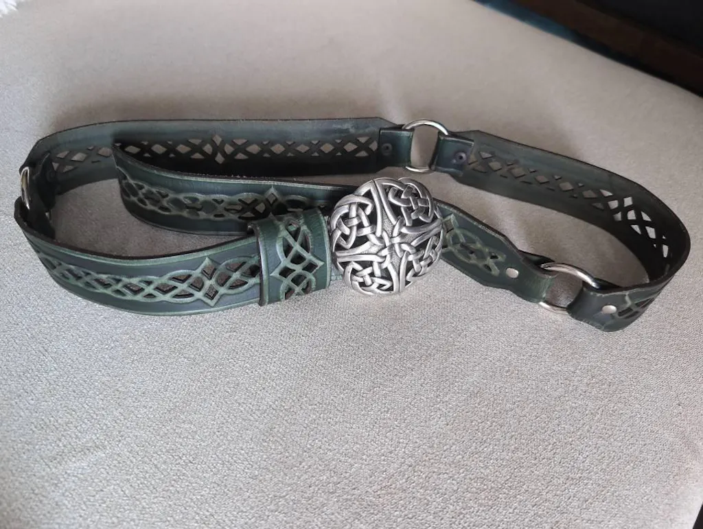 Embrace the legacy of the ancients with this handcrafted Celtic leather belt, featuring intricate knotwork designs and a solid metal buckle inspired by ancient symbology. Available in weathered brown or forest green, this belt brings the mystique of the old world to any character.