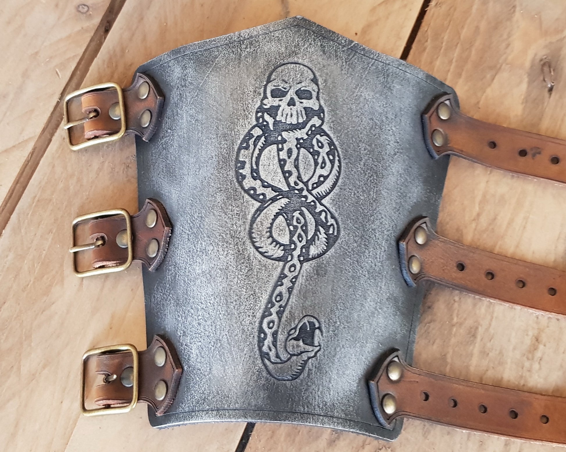 Nothing like a Death Eaters vambrace to show your affiliation with the Voldemort fan club. We already know that you have the tattoo on your forearm, but sometimes weather is cool and no one wants to lift his sleeve. And someones kind of they don't like this tattoo that moves, it's weird. In addition, having an aspect of martial uniform is cool, everyone likes Sith uniforms, I mean Death Eaters uniforms...