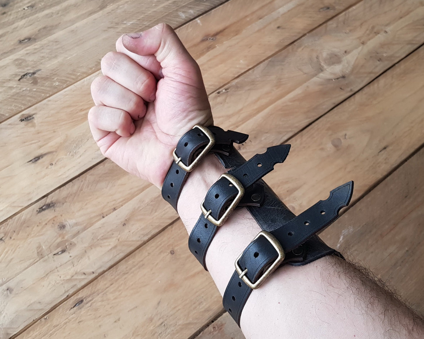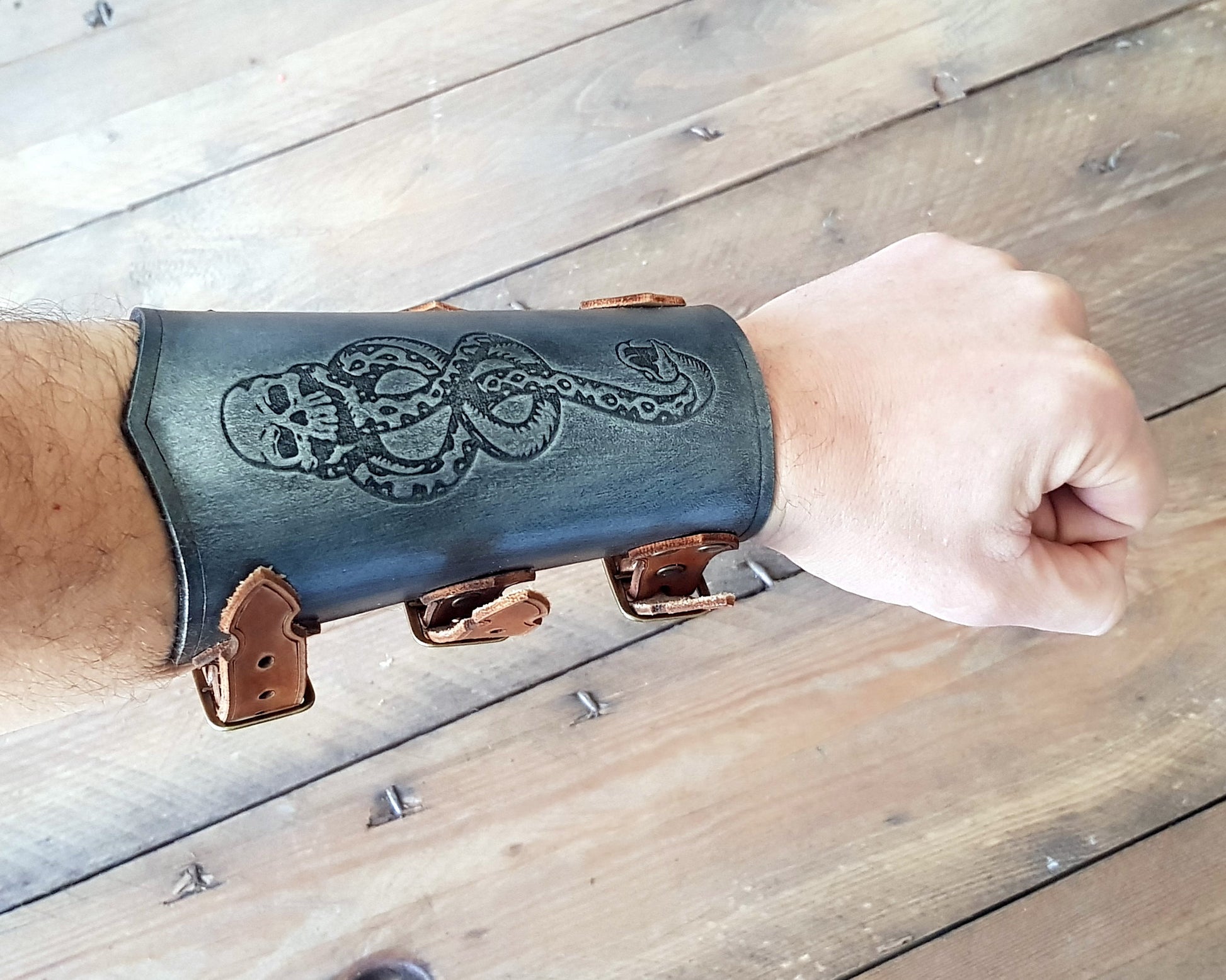 Our bracers are made of vegetable tanned cow leather. Each piece is dyed and hand-mounted accurately and carefully. Finally, we add our touches of cinematographic aging, so that your bracers look like they come out of a movie.