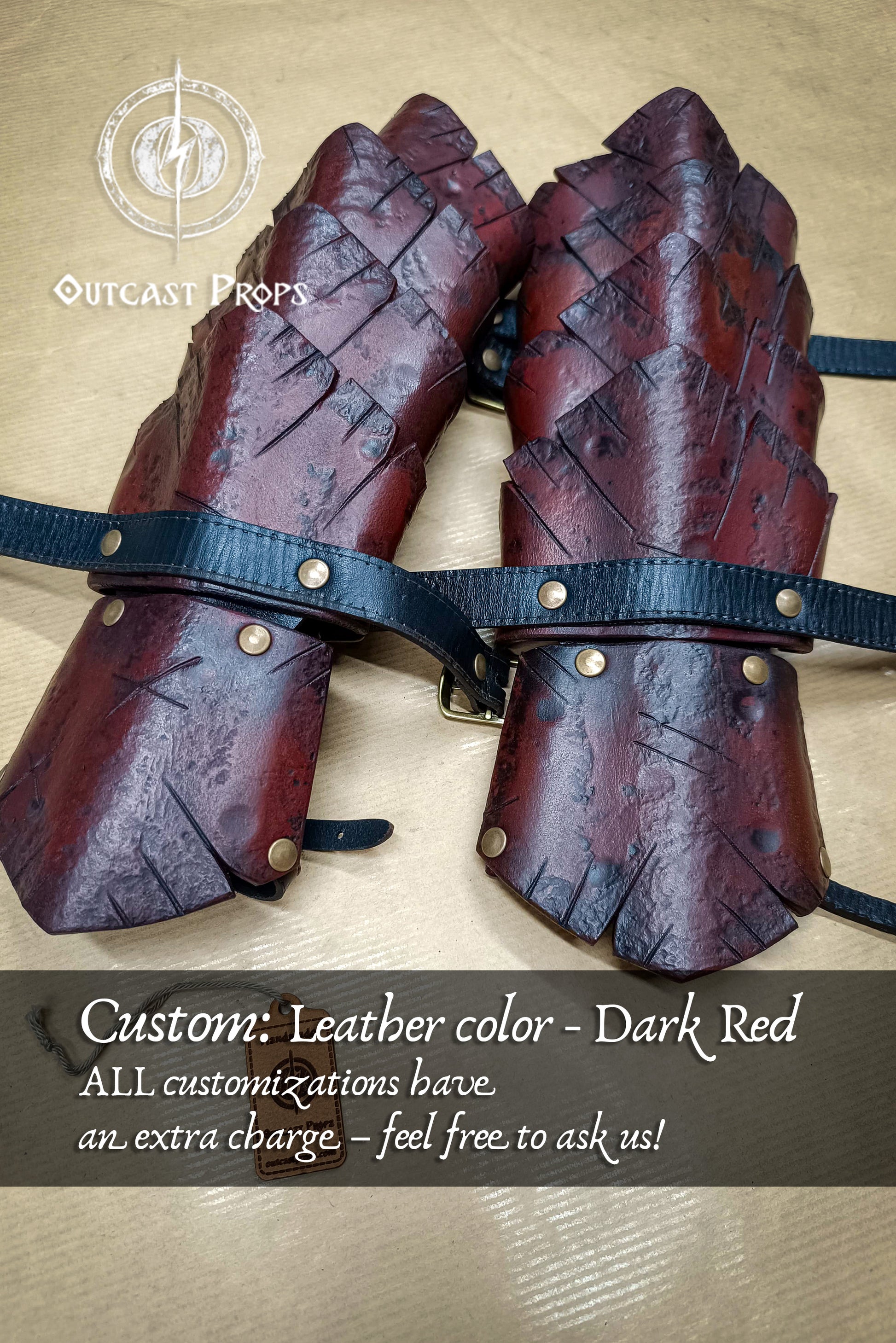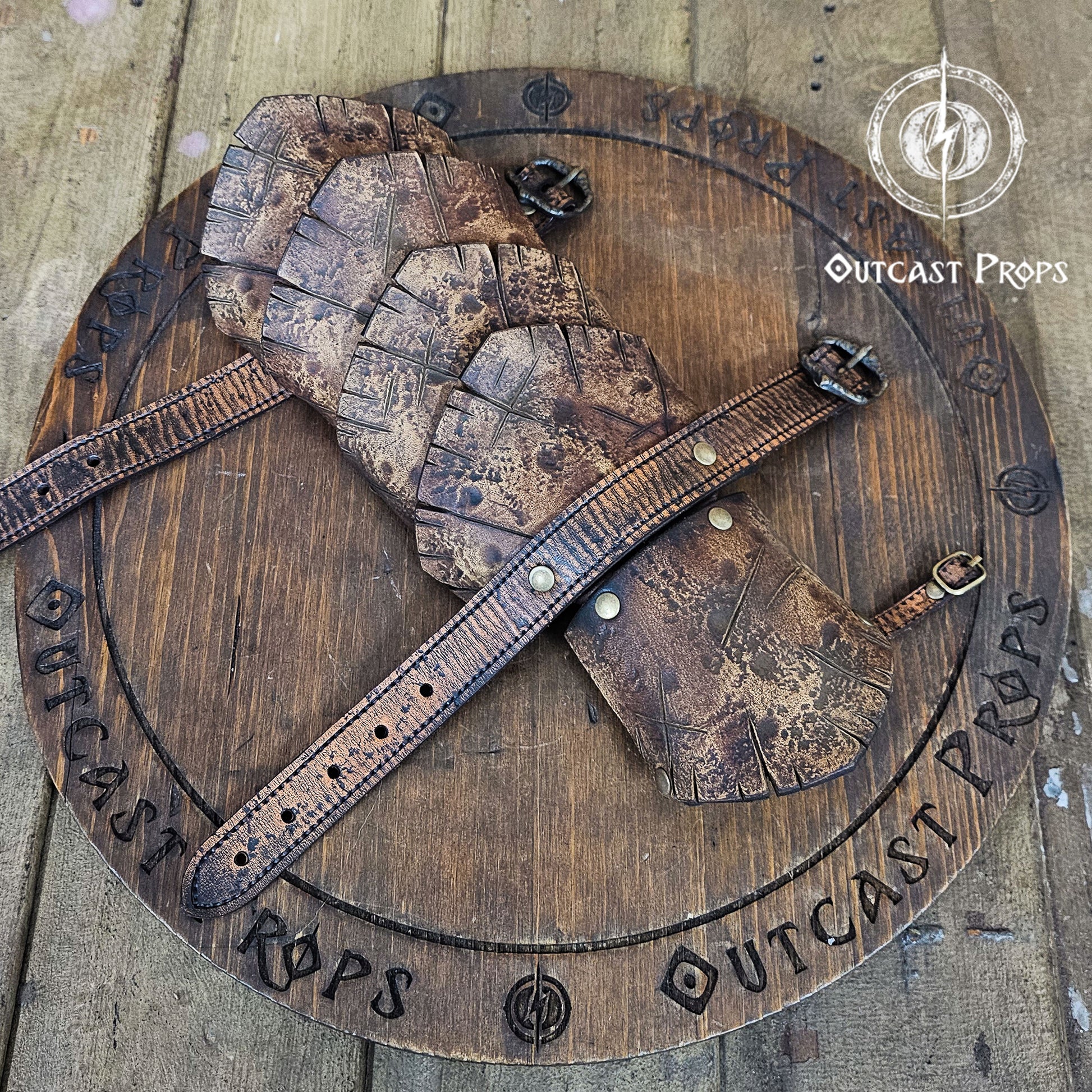 Each bracer is handcrafted from thick, durable leather, embossed with a dragon scale pattern that gives it a strong, medieval fantasy appearance. The unique design enhances its look with a rustic and powerful presence, perfect for LARP, cosplay, and fantasy fairs.