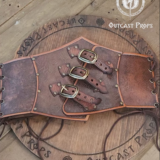 Crafted from full grain, premium vegetable-tanned leather, this corset combines strength with elegance. Each piece is hand-dyed with natural pigments, embossed with intricate floral designs, and finished with Outcast Props’ unique aging techniques and epic painting. The front buckles allow for decorative adjustment, while the side lacing ensures a secure, tailored fit.