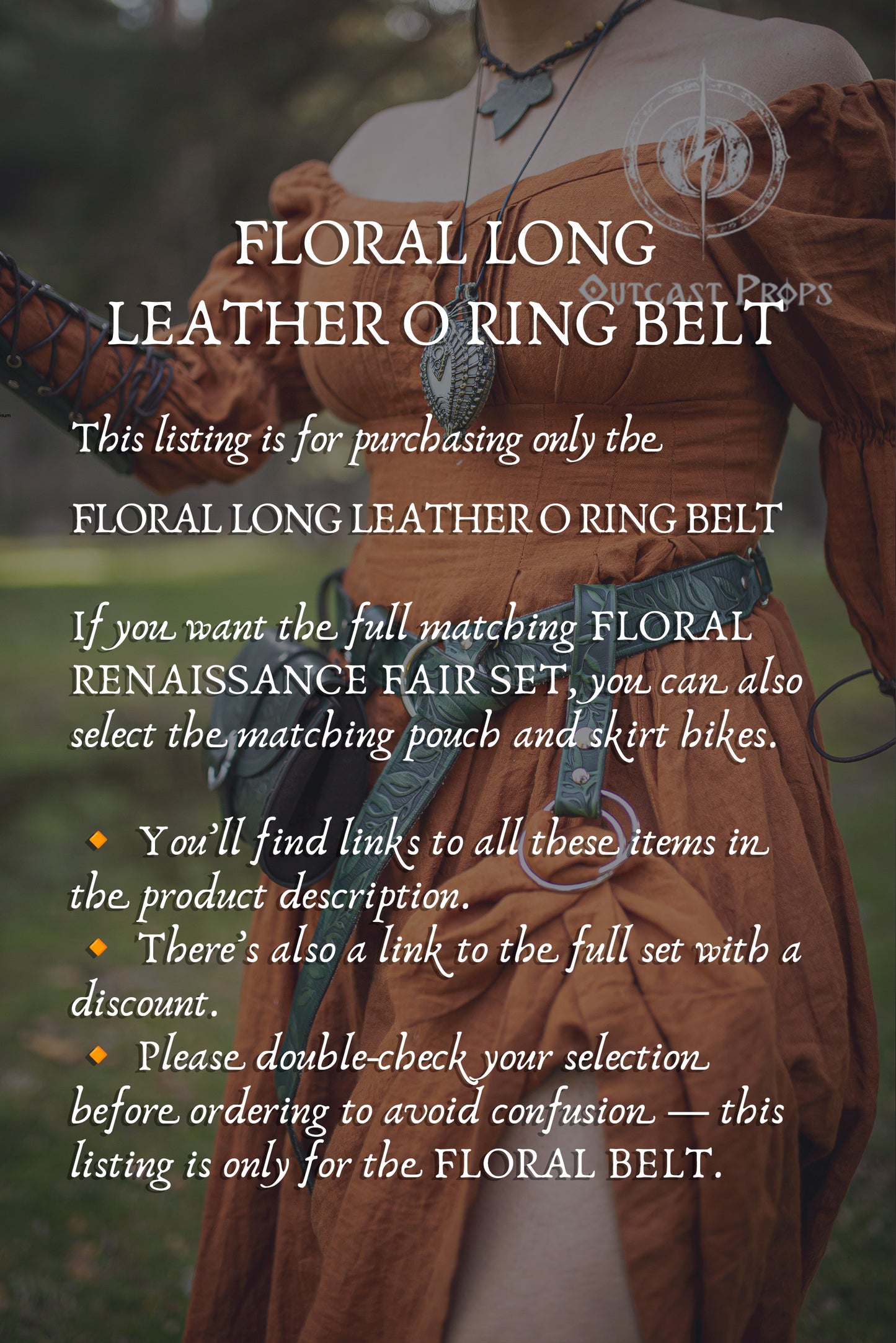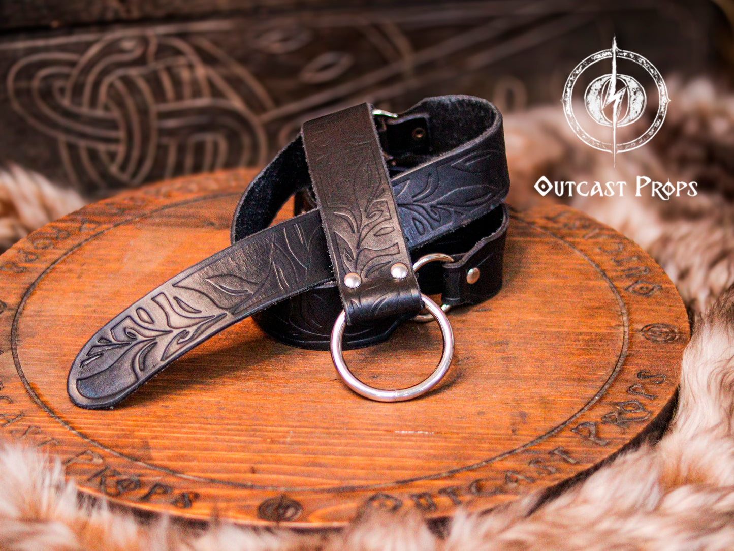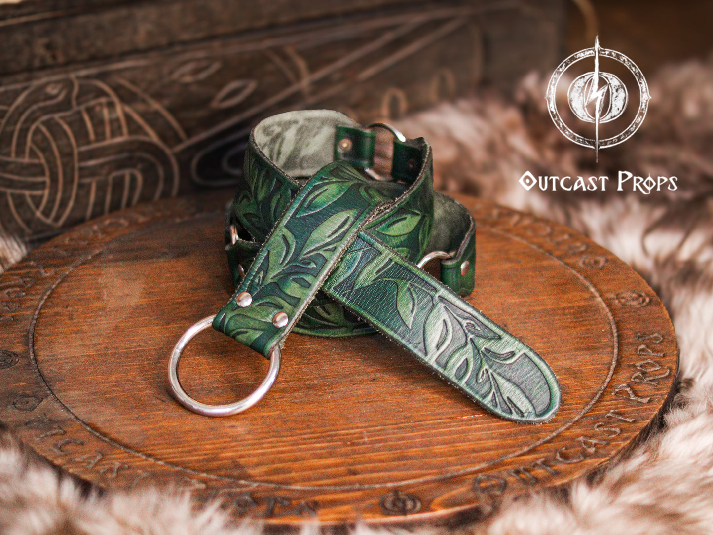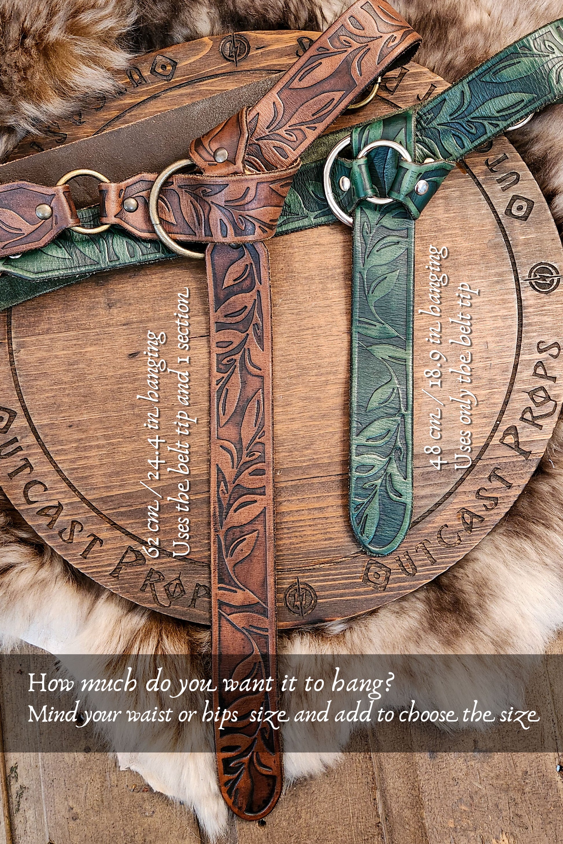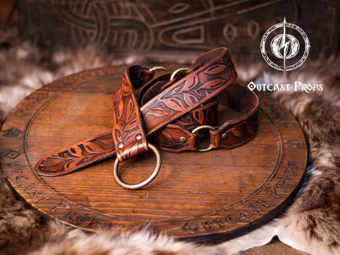 Add a touch of fantasy elegance to your outfit with this handcrafted floral leather belt, perfect for LARP, cosplay, Renaissance faires, or just to spice up your daily wardrobe. Decorated with tooled leaf patterns and finished with sturdy steel O-rings, this piece blends style, utility, and a strong dose of character flair.