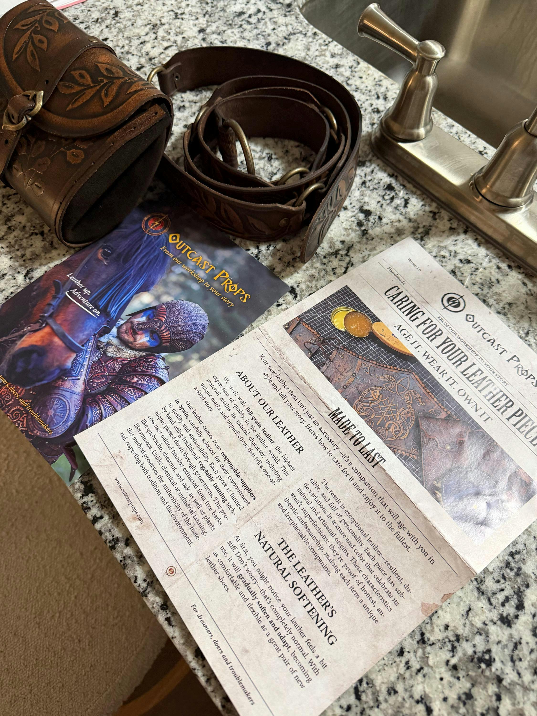 Each belt is a unique creation, with slight variations in tone and tooling that make every item one of a kind—just like the characters who wear them.