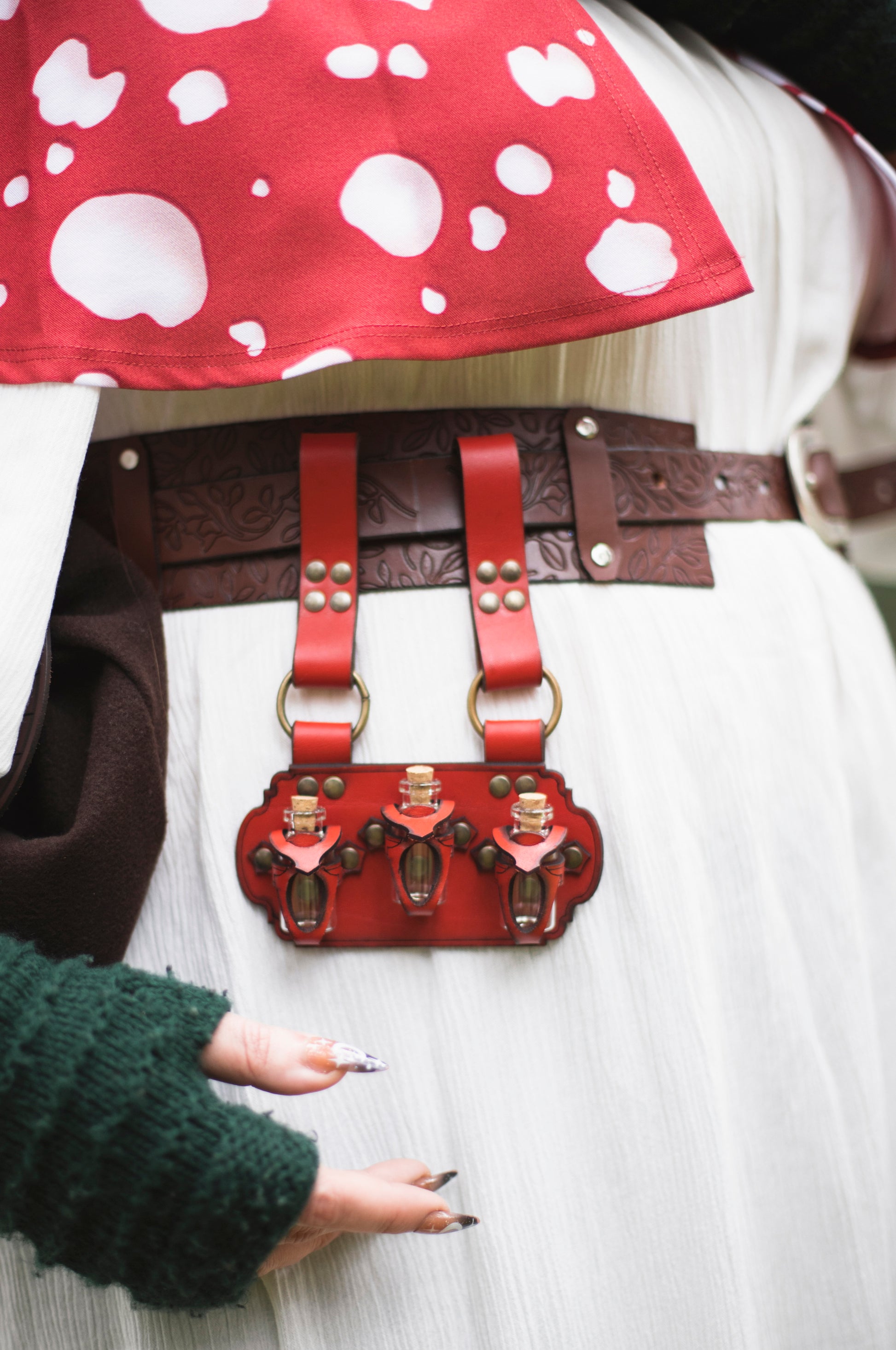 Belt potion holder for alchemists, medics, doctors or assassins. These pieces are quite versatile , so it is easy to keep using it on any character you take it with.