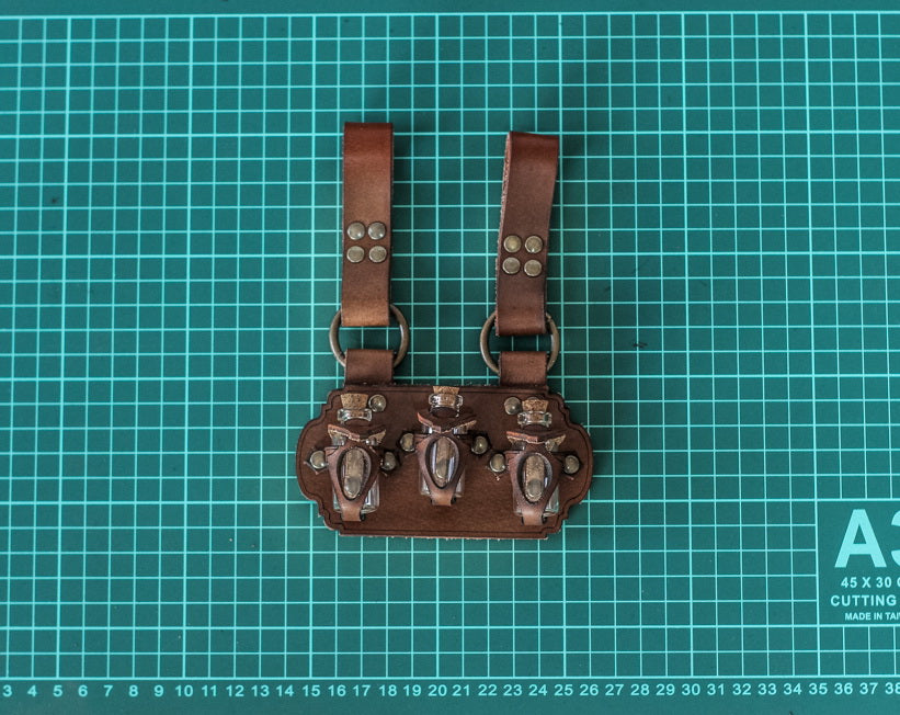Our potion leather holder for belts and baldrics with 3 different potions can be used in complex situations where you might need to do some fast mixes to get the right potion or antidote.