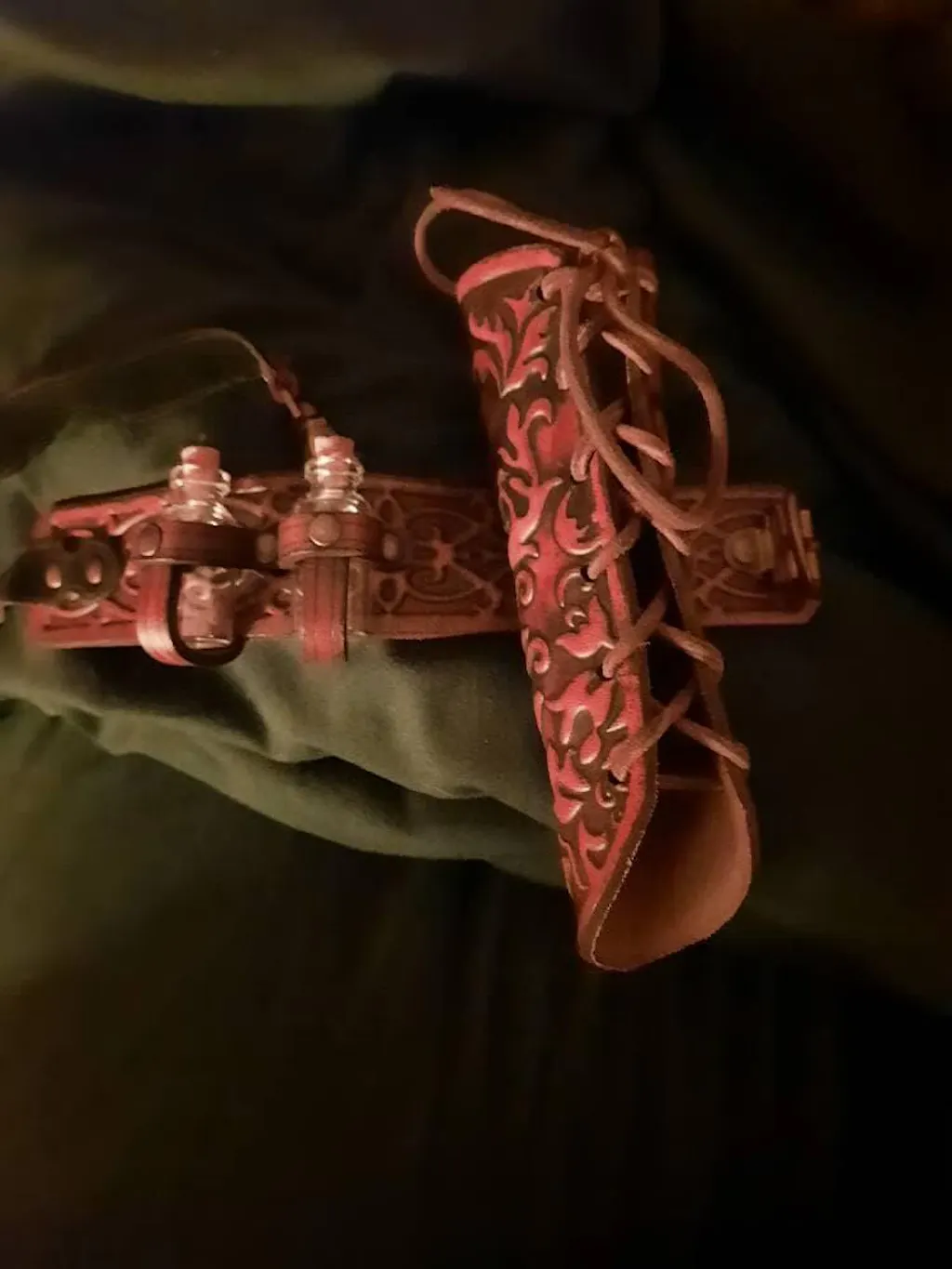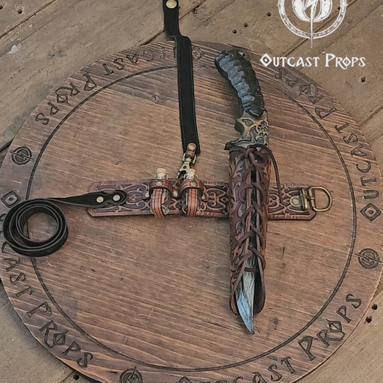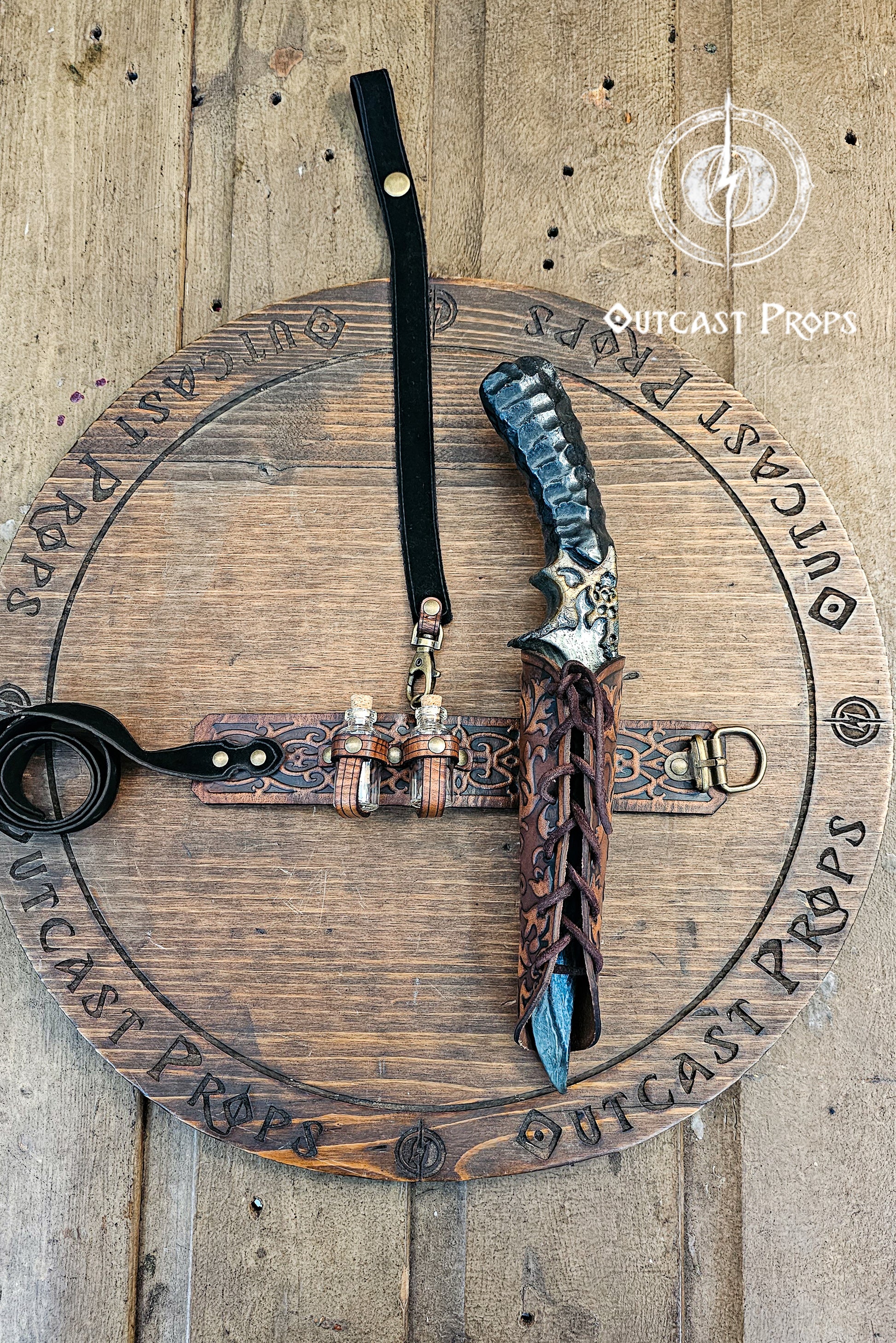 Crafted for warriors, rogues, and spellcasters alike, this ornate leather garter holster transforms your thigh into a functional and cinematic centerpiece. Built to hold a standard LARP dagger securely while carrying two crystal potion bottles, it merges practicality with immersive design. The embossed leather, hand-dyed and aged with Outcast Props’ unique techniques and epic painting, gives it the look of a relic from another age. Whether you stride into battle, attend a Ren Faire, or step onto the cosplay stage, this sheath is more than gear—it is a story you wear.