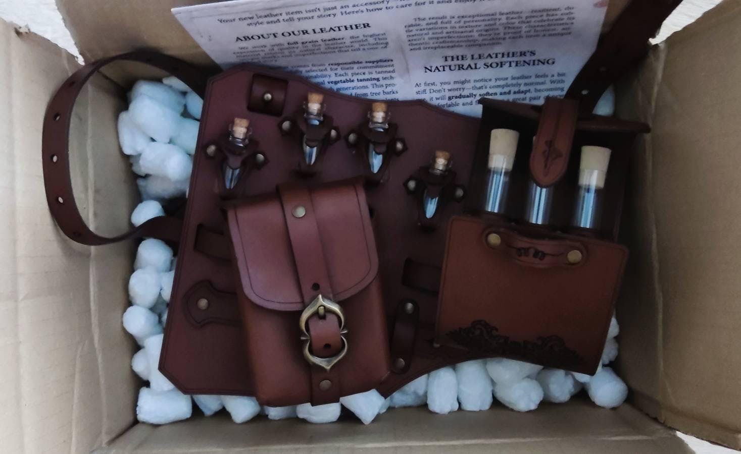 Crafted from full-grain, premium vegetable-tanned leather, this harness is hand-dyed and finished with Outcast Props’ unique aging techniques and epic painting. The kit includes five small glass potions, three clear vials (plastic for safety) sealed with natural cork, and a removable multipurpose pouch. Every detail is handcrafted, ensuring durability and a cinematic aesthetic.