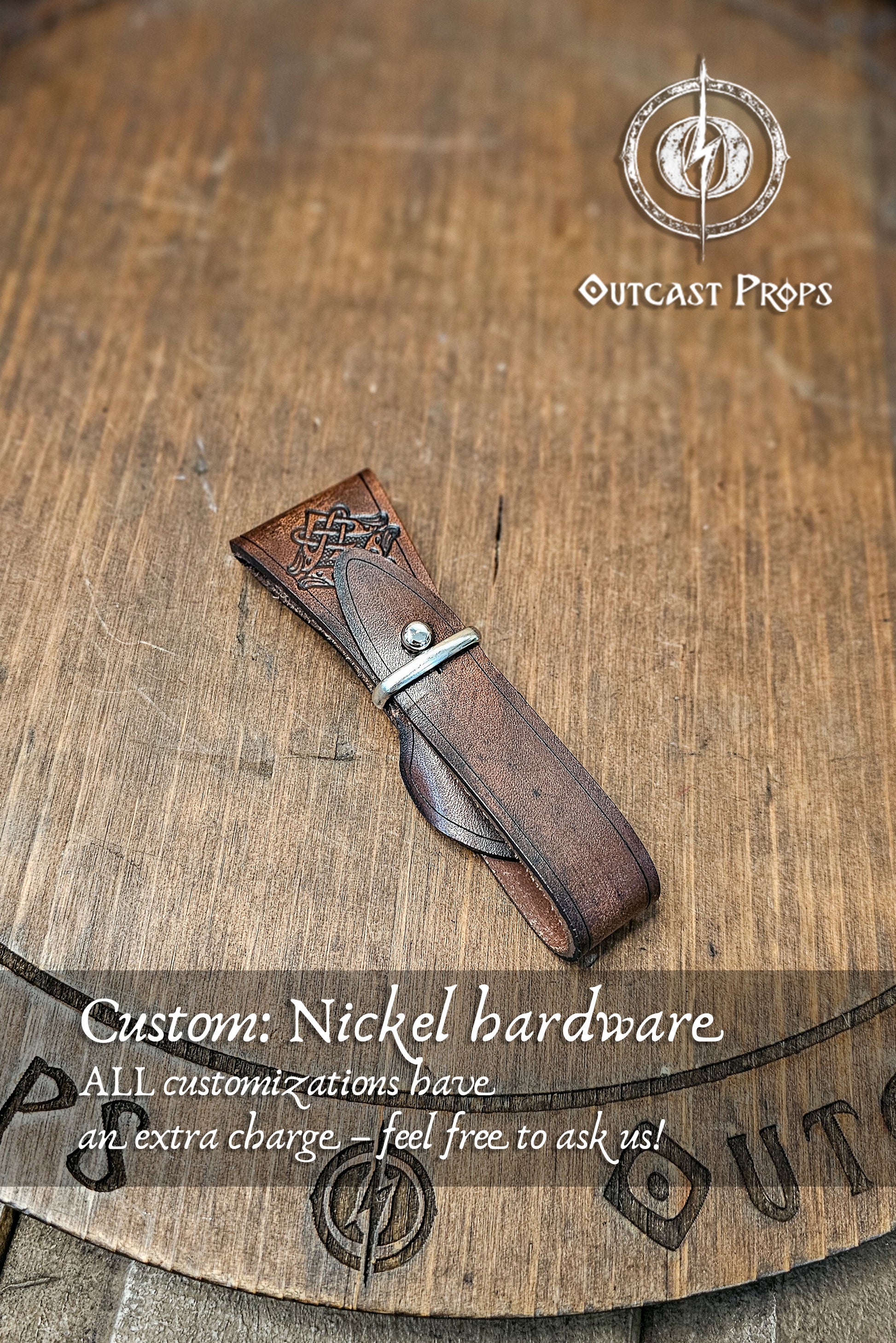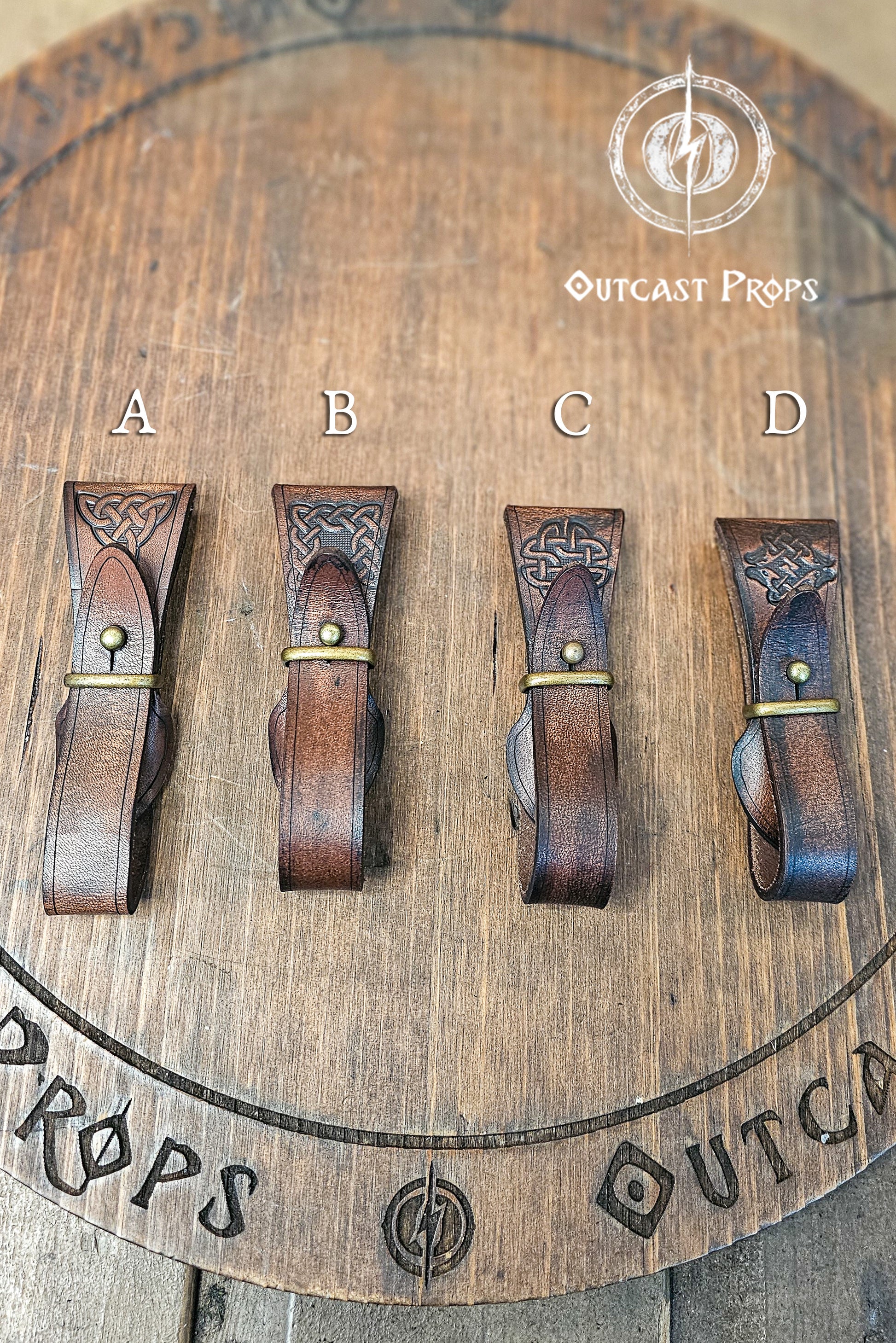 Every adventurer knows the value of being prepared. This leather mug holder keeps your tankard or accessories at hand, whether you are feasting at a Renaissance faire, marching through a Viking camp, or roaming a Celtic battlefield. It can be used to hang keys, a cord, or other items from the belt or straps.