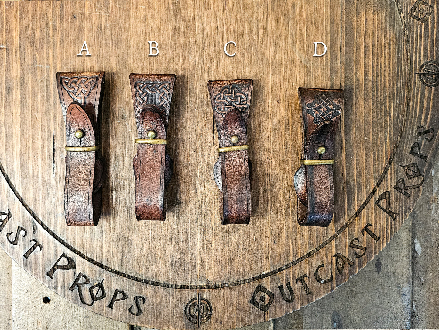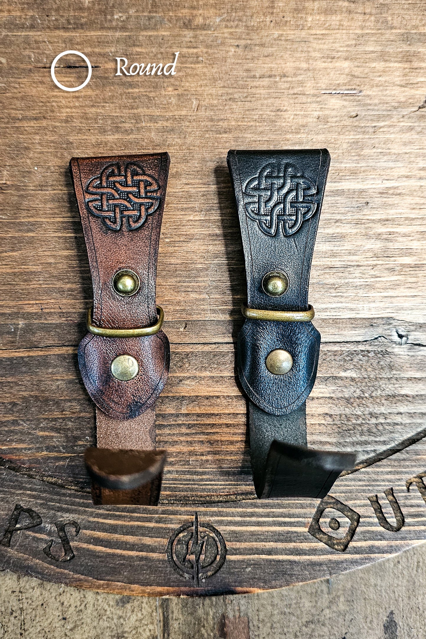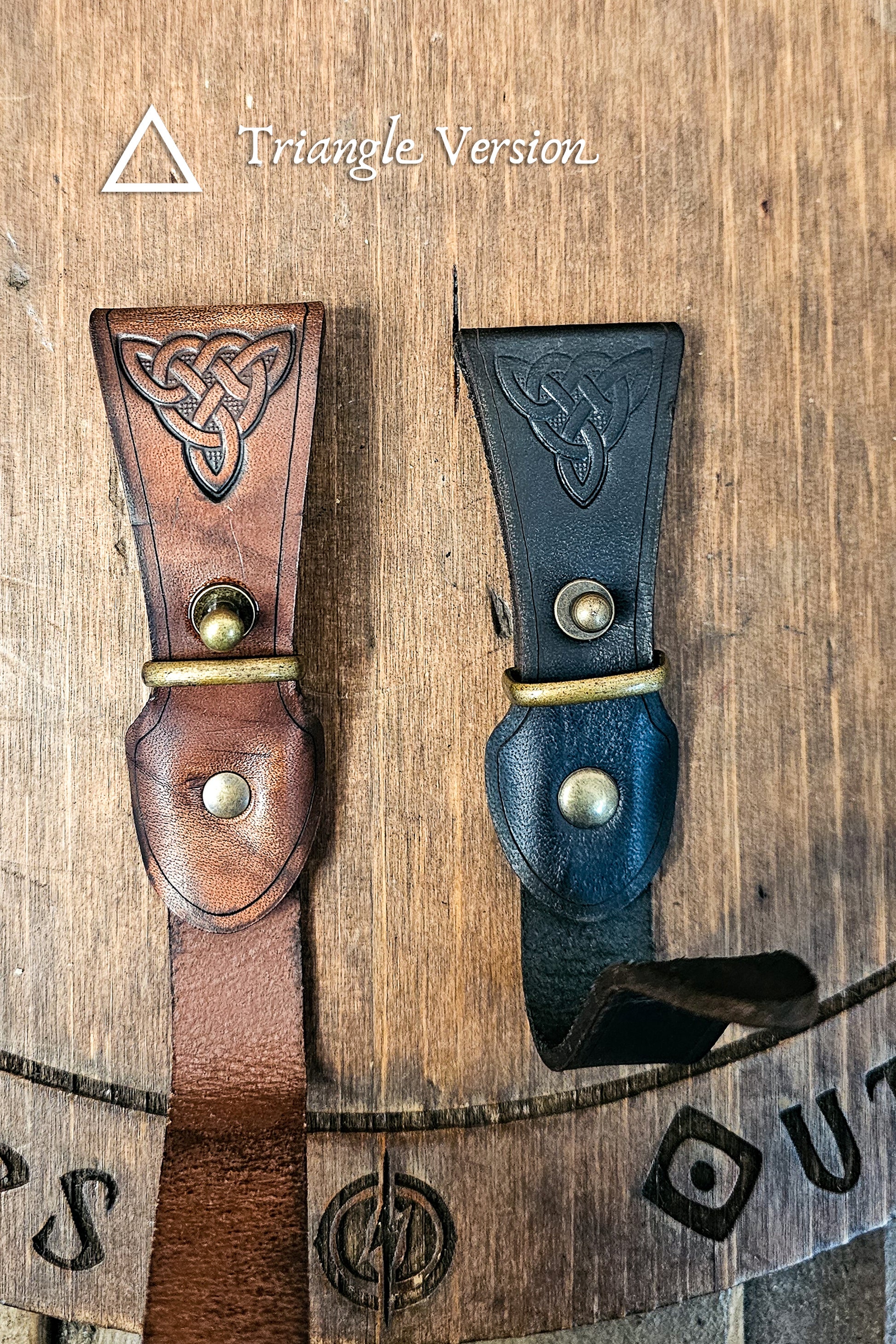Each piece is hand-dyed with natural pigments, embossed with traditional knotwork patterns, and riveted for strength. The quick-release system is faster and sturdier than laces or buckles, keeping your mug secure while still easy to access when the call for ale arrives.
