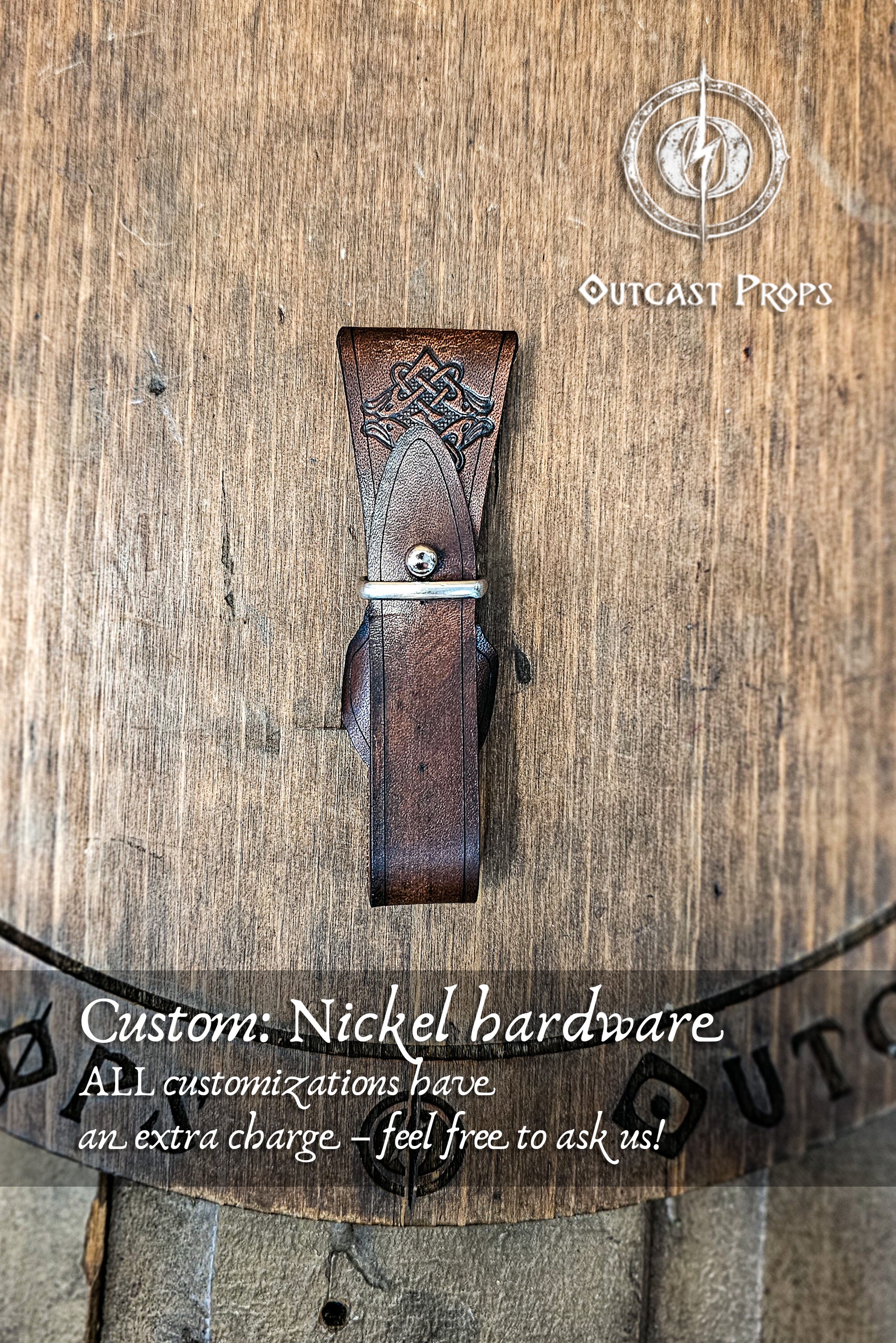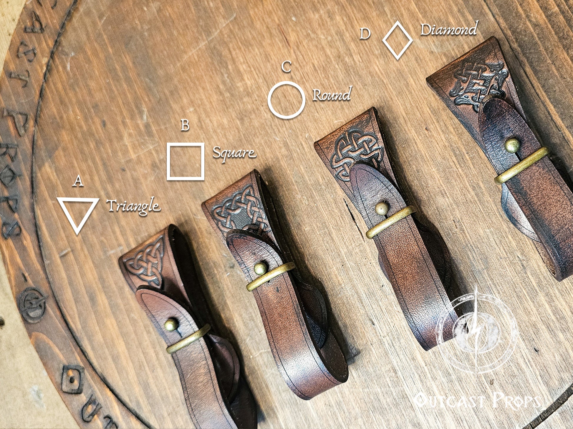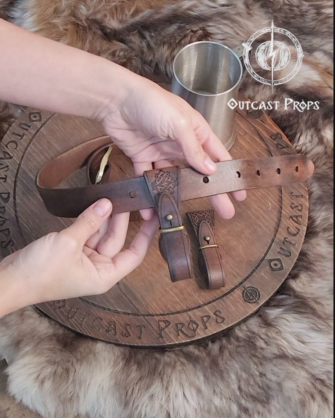 Each piece is hand-dyed with natural pigments, embossed with traditional knotwork patterns, and riveted for strength. The quick-release system is faster and sturdier than laces or buckles, keeping your mug secure while still easy to access when the call for ale arrives.