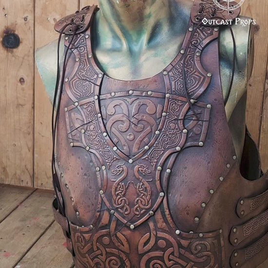 Immerse yourself in the raw elegance of Celtic tradition and Viking strength with this handcrafted leather torso armor, a centerpiece designed to elevate any warrior persona for LARP, Renaissance Fairs, historical cosplay, and fantasy realms. Built for durability and heroic presence, it blends intricate Celtic knotwork, Viking-inspired motifs, and deep aged tones that give the piece a noble, timeworn character. The artisan distressing and unique aging techniques create a cinematic finish worthy of battle-hardened legends, while maintaining comfort and mobility for long events and immersive adventures.