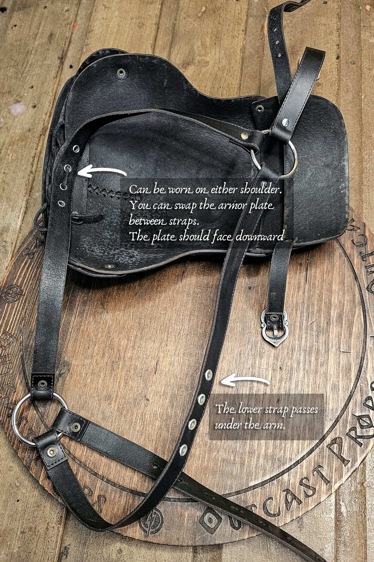 1. The upper strap is the one that supports the embossed armor plate. Use the leather cord to tie the plate securely to this strap through the holes.