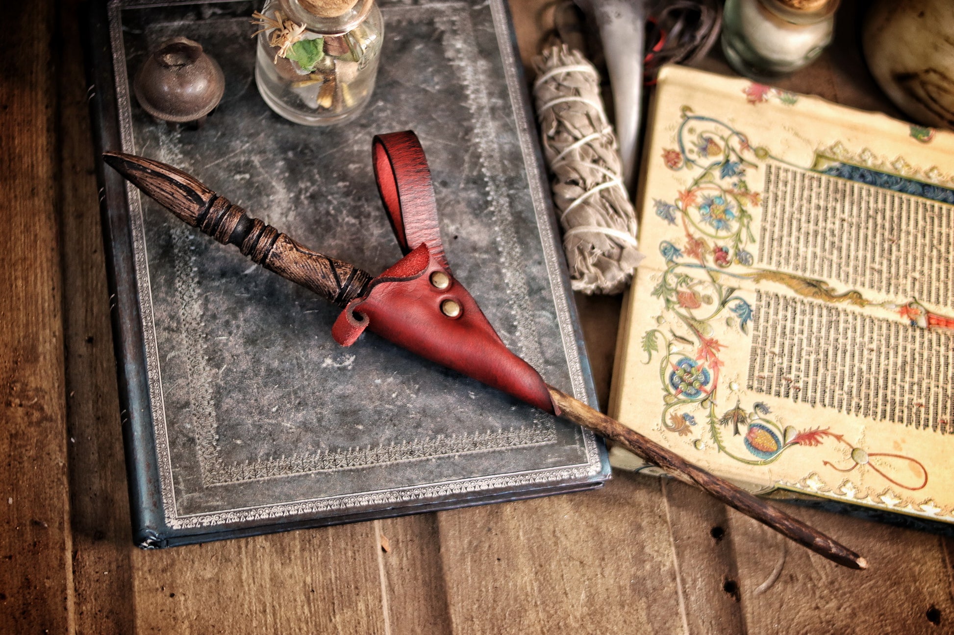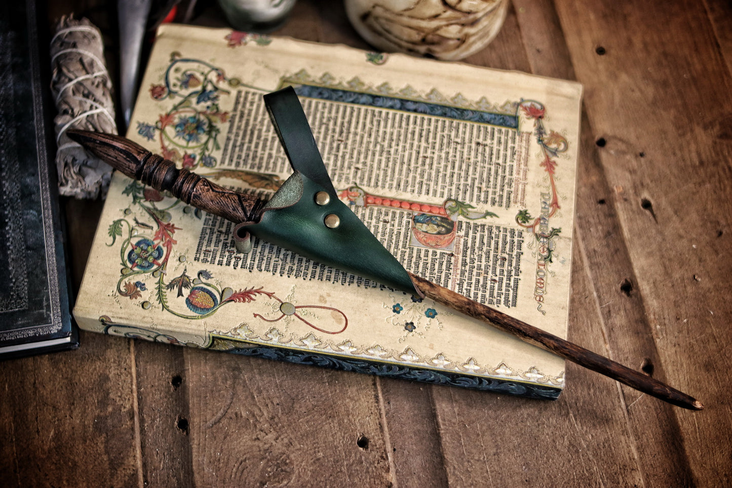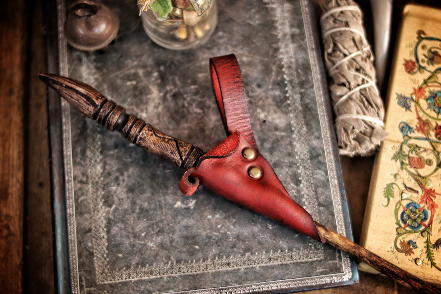 Made of high quality natural leather, hand dyed with vegetable dyes. Available in several colors. The wand's not included, but you can buy it in our store.