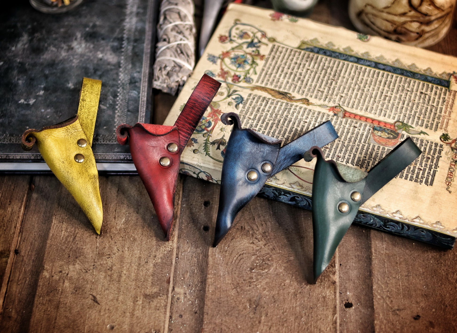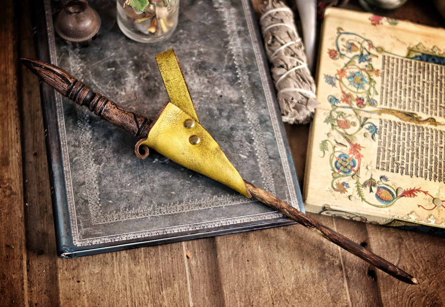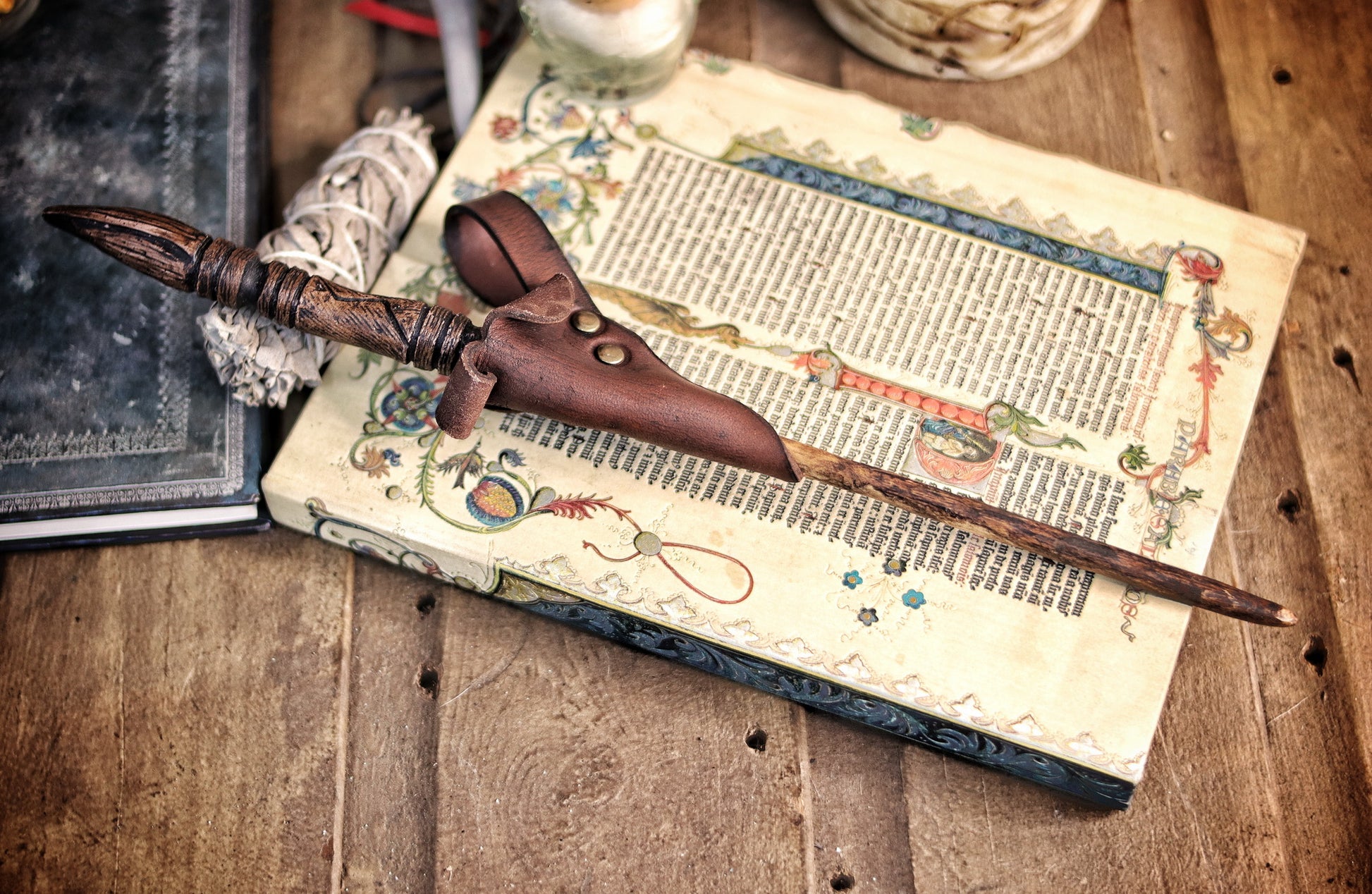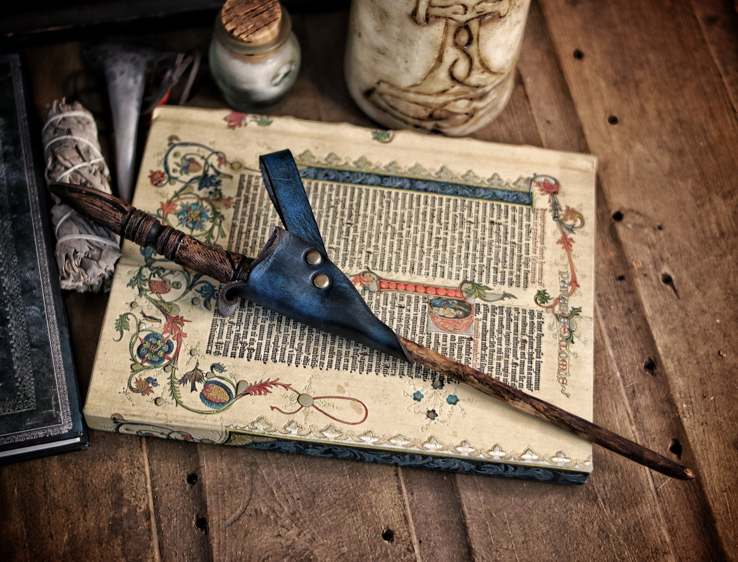 Made of high quality natural leather, hand dyed with vegetable dyes. Available in several colors. The wand's not included, but you can buy it in our store.