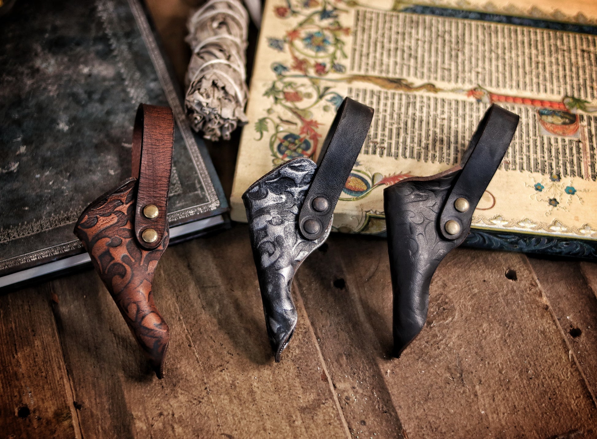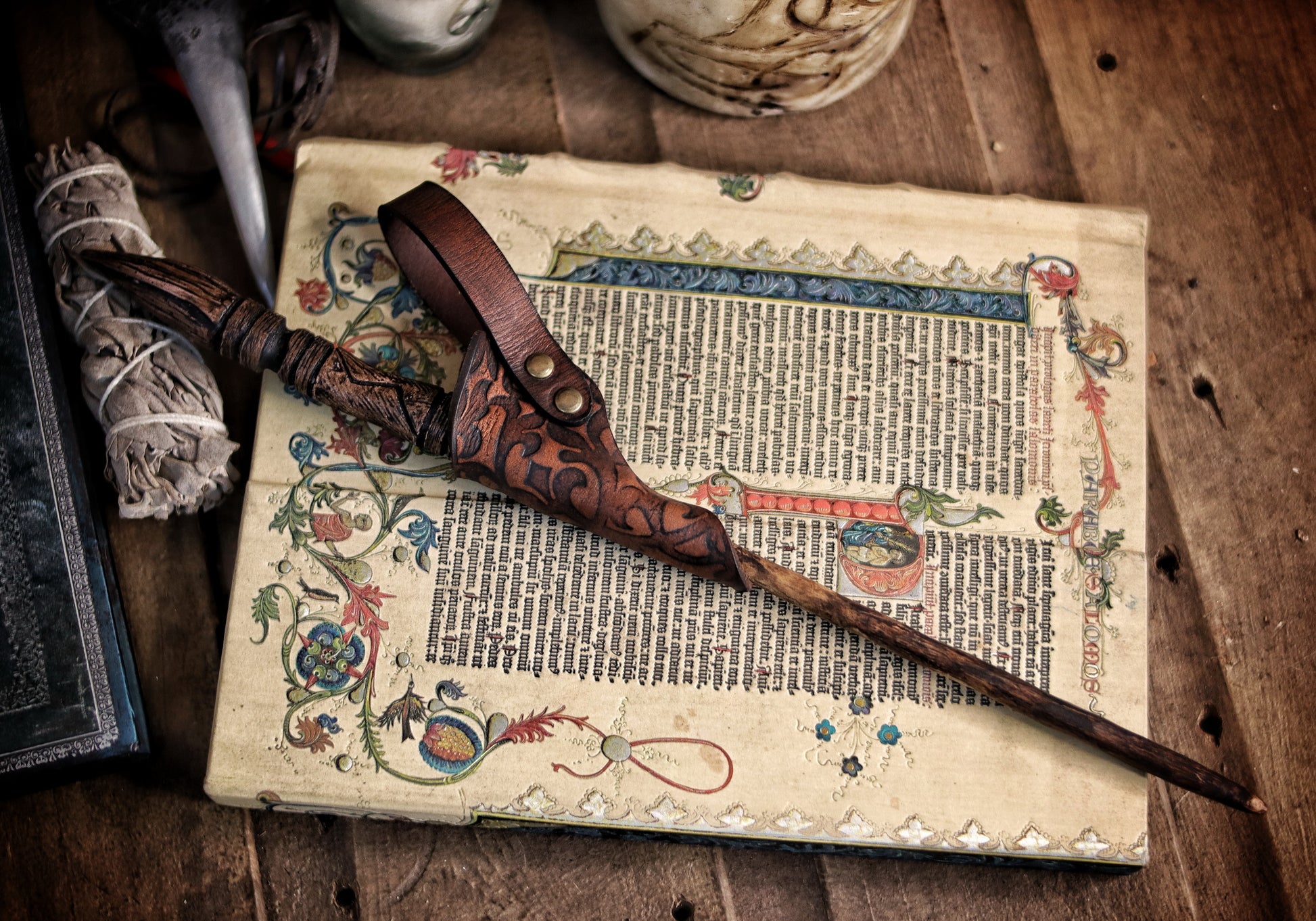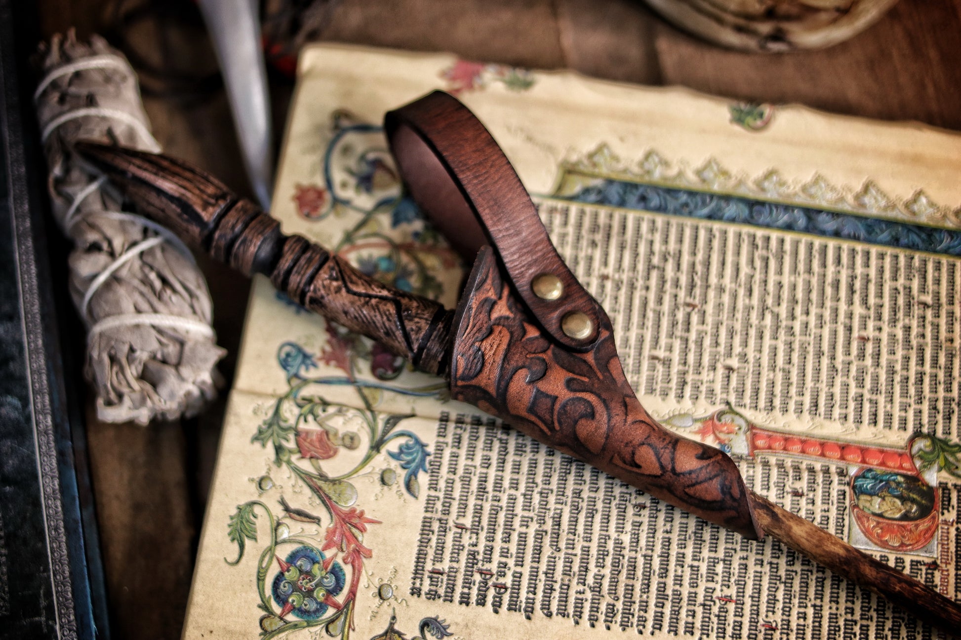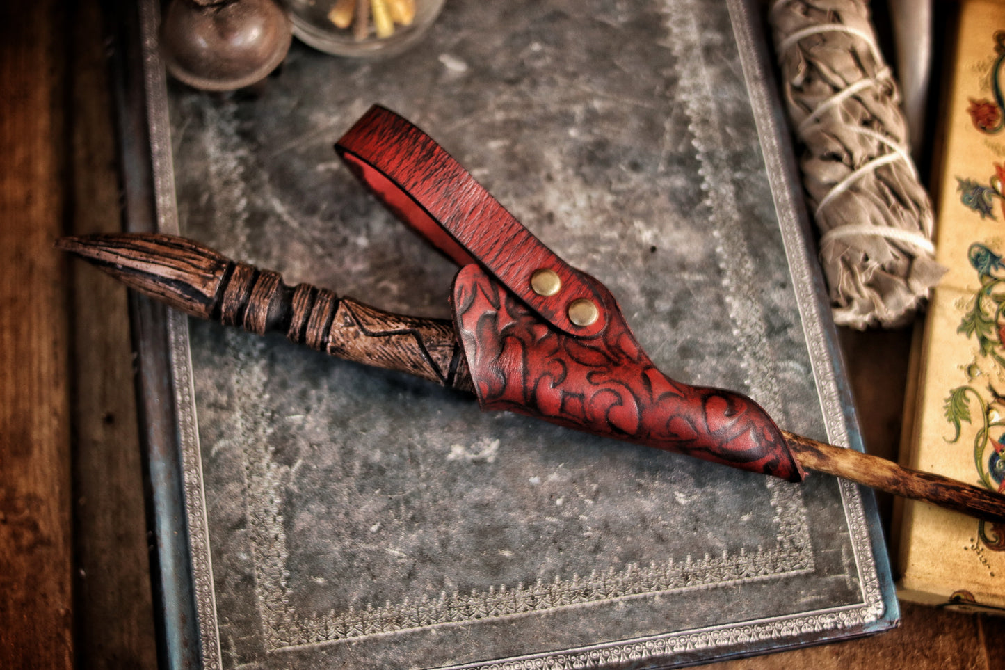Magic Wand leather frog Ornated Holster to hang from your belt, perfect for wizard cosplay.
