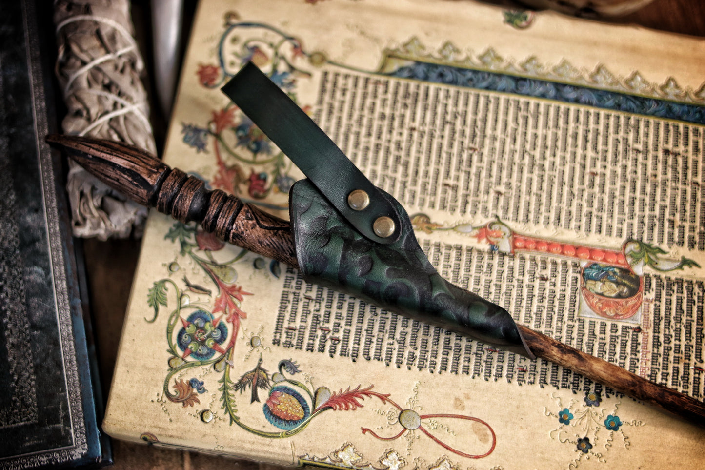 Made of high quality natural leather, hand dyed with vegetable dyes. Available in several colors. The wand's not included, but you can buy it in our store.