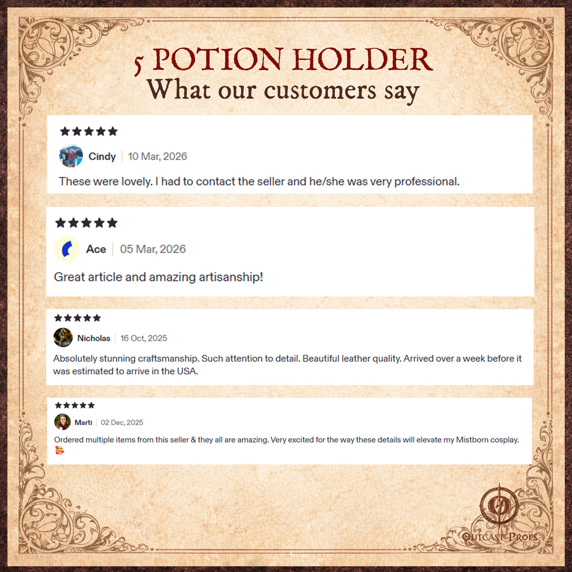 At Outcast Props, we believe your gear should tell a story. Every piece we make is forged with passion, authentic materials, and a dedication to elite craftsmanship, ensuring you stand out in every realm you explore.