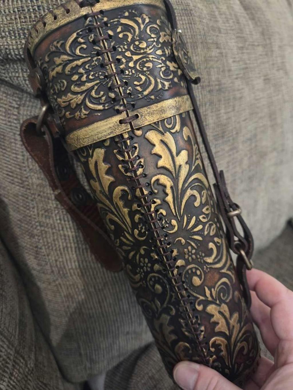 This ornate leather scroll holder is a handcrafted cylindrical case created for those who appreciate refined craftsmanship, timeless fantasy aesthetics, and functional beauty. More than a simple container, it is a statement piece that elevates desks, libraries, studios, and costumes alike.