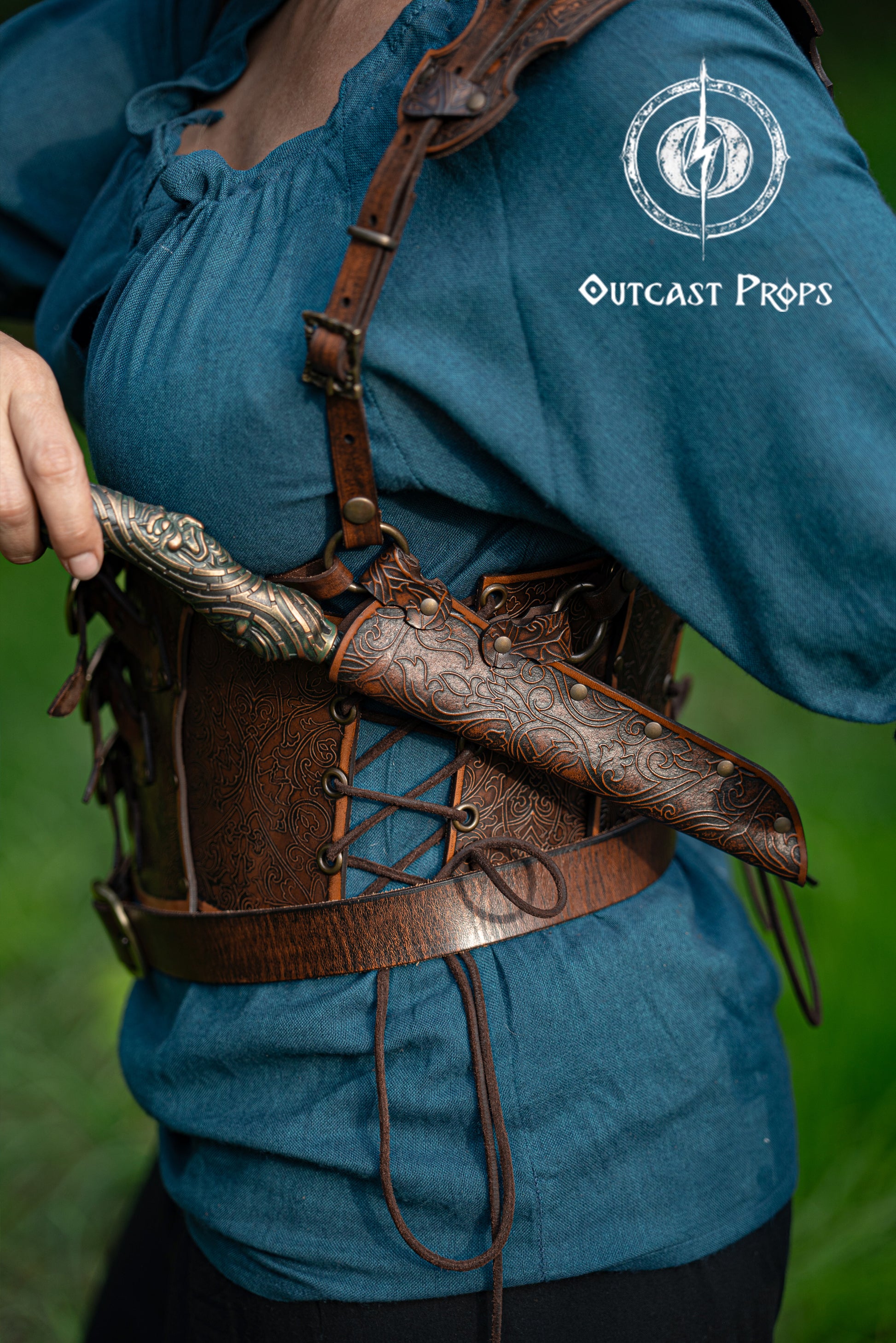 Crafted from full-grain, premium vegetable-tanned leather, this holster balances durability with refined style. Hand-dyed with natural pigments and finished with Outcast Props’ unique aging techniques and epic painting, it features intricate ornamental embossing that makes every piece unique. Adjustable straps and a secure closure ensure comfort and reliability from XS to XXL.