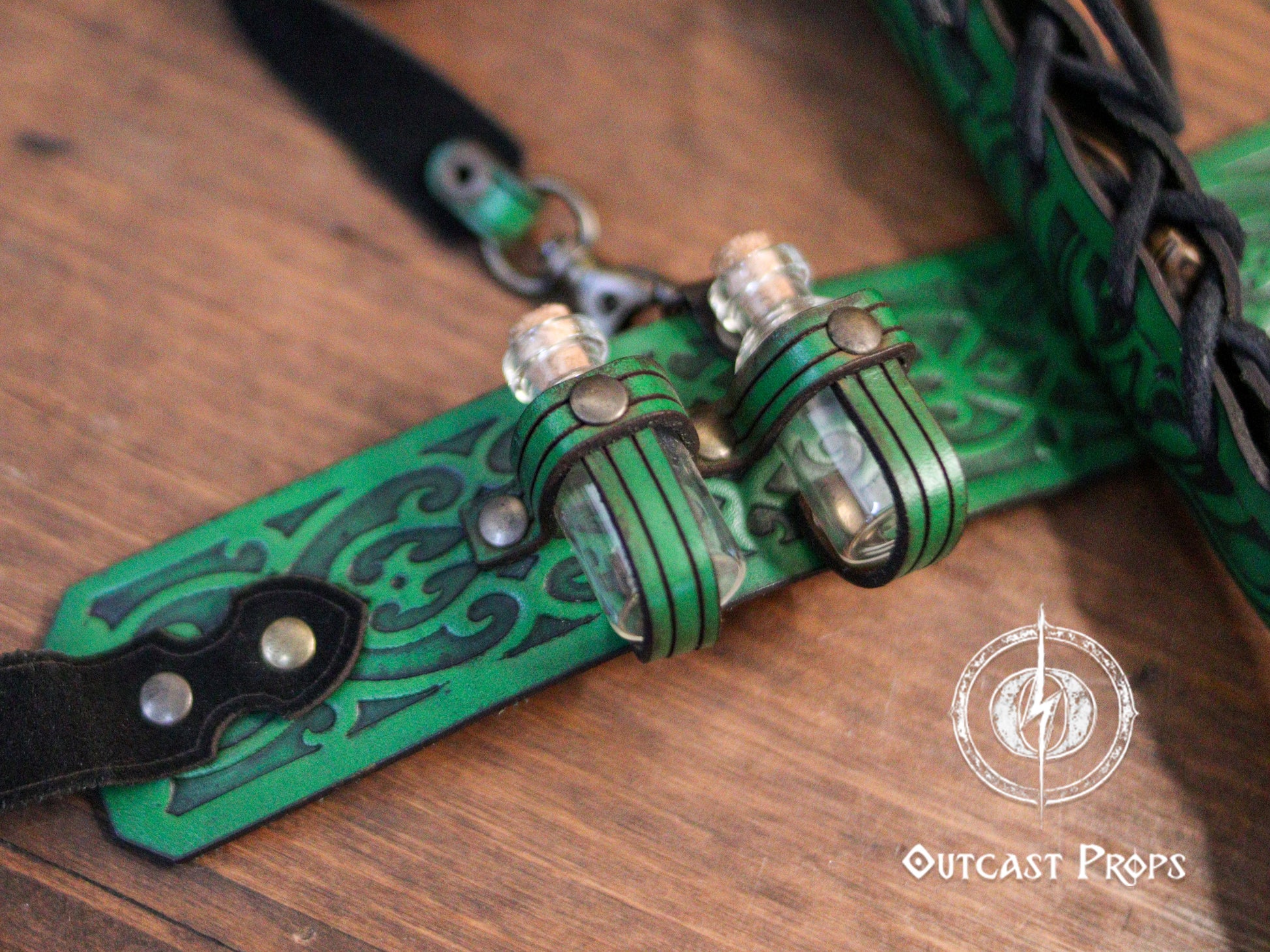 Crafted from full grain, premium vegetable-tanned leather, this piece balances durability with artisan refinement. Hand-dyed with natural pigments and finished with Outcast Props’ unique aging techniques and epic painting, it carries a historical and cinematic aesthetic. Each potion bottle is made of glass with a cork stopper, and the holster is designed to fit most wand sizes.