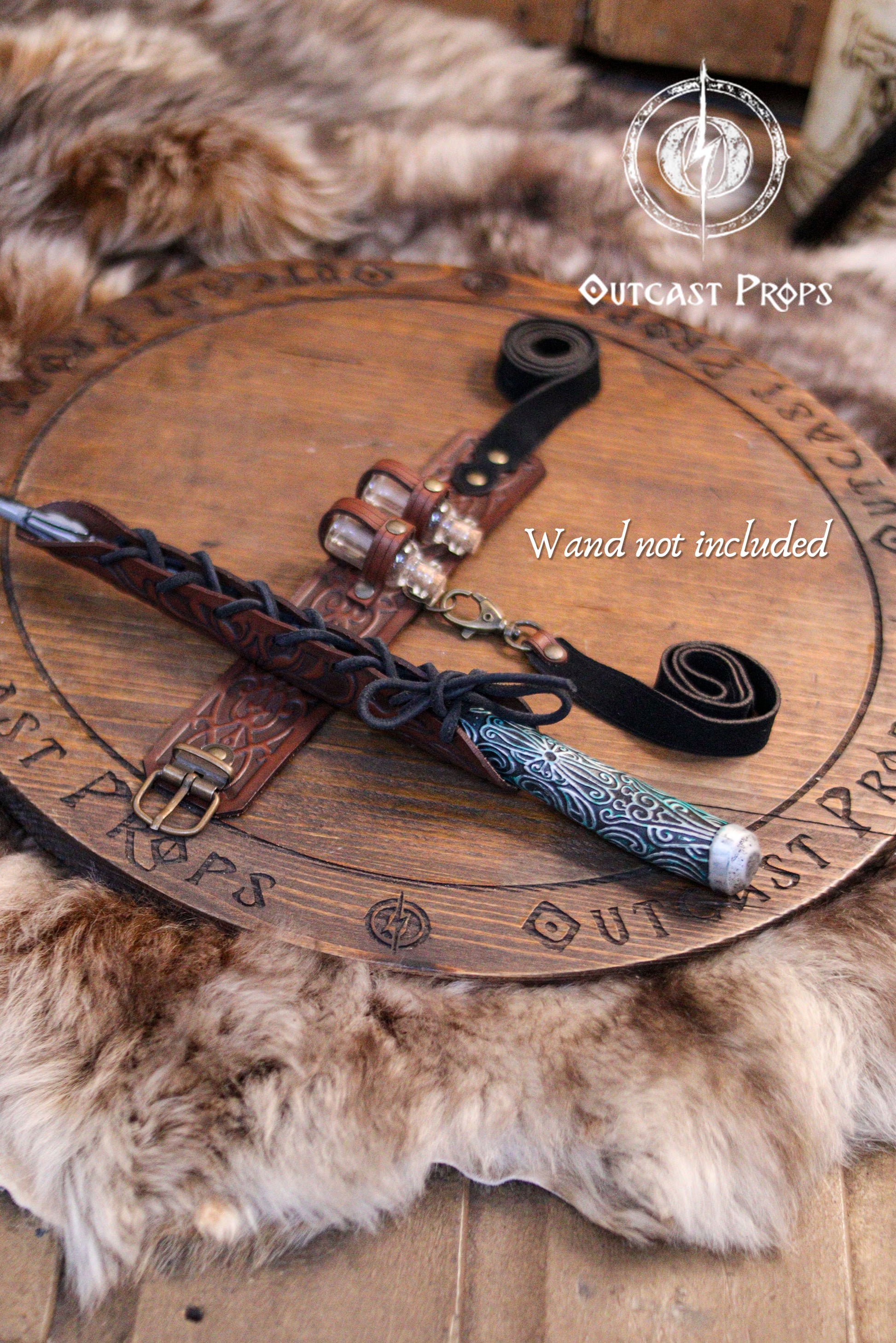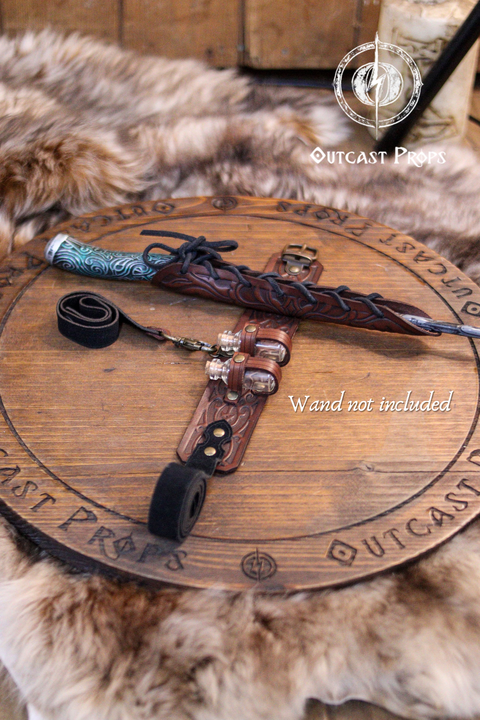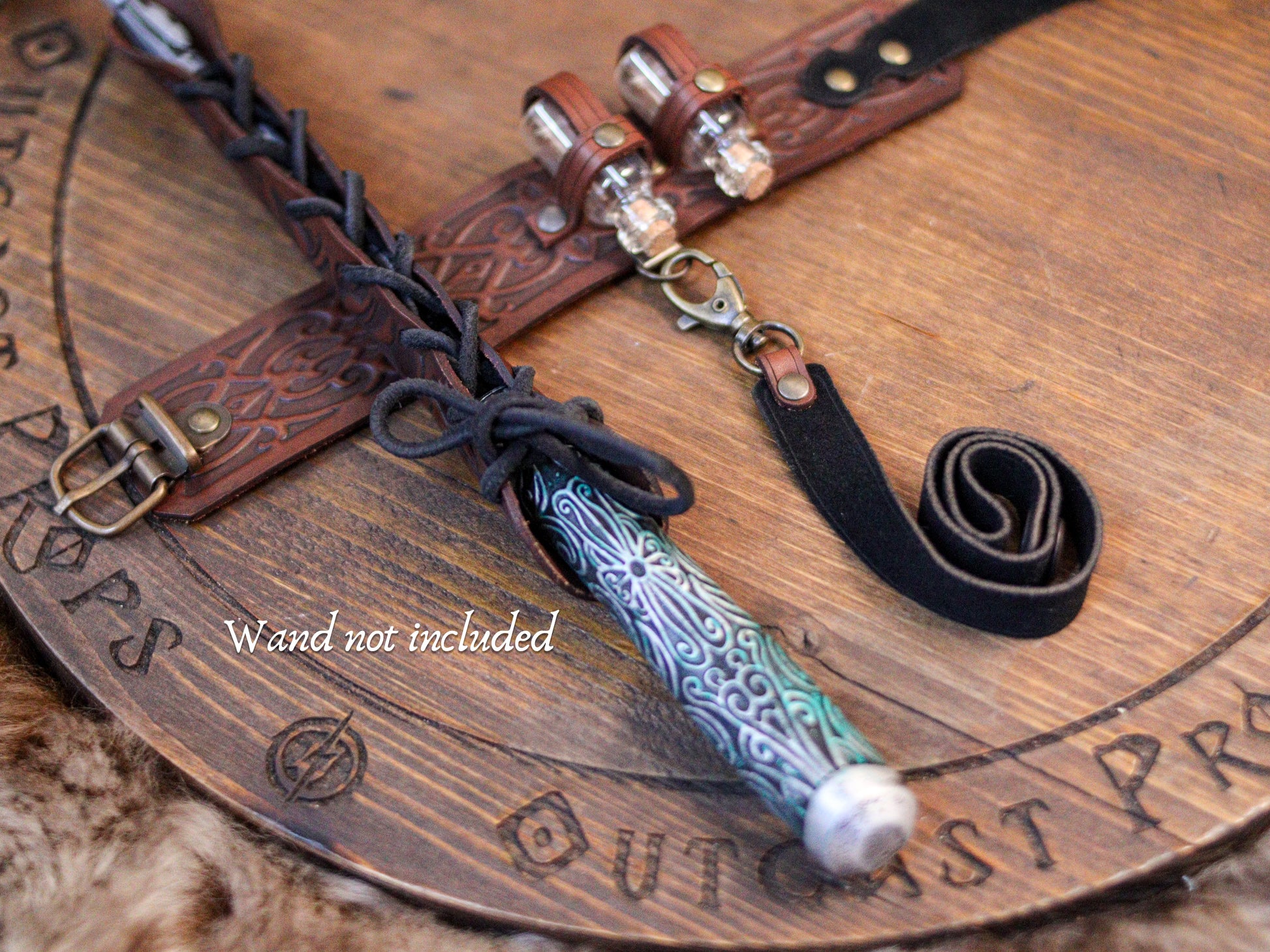 Includes 1 leather wand holster with two glass potion bottles. Wand not included.