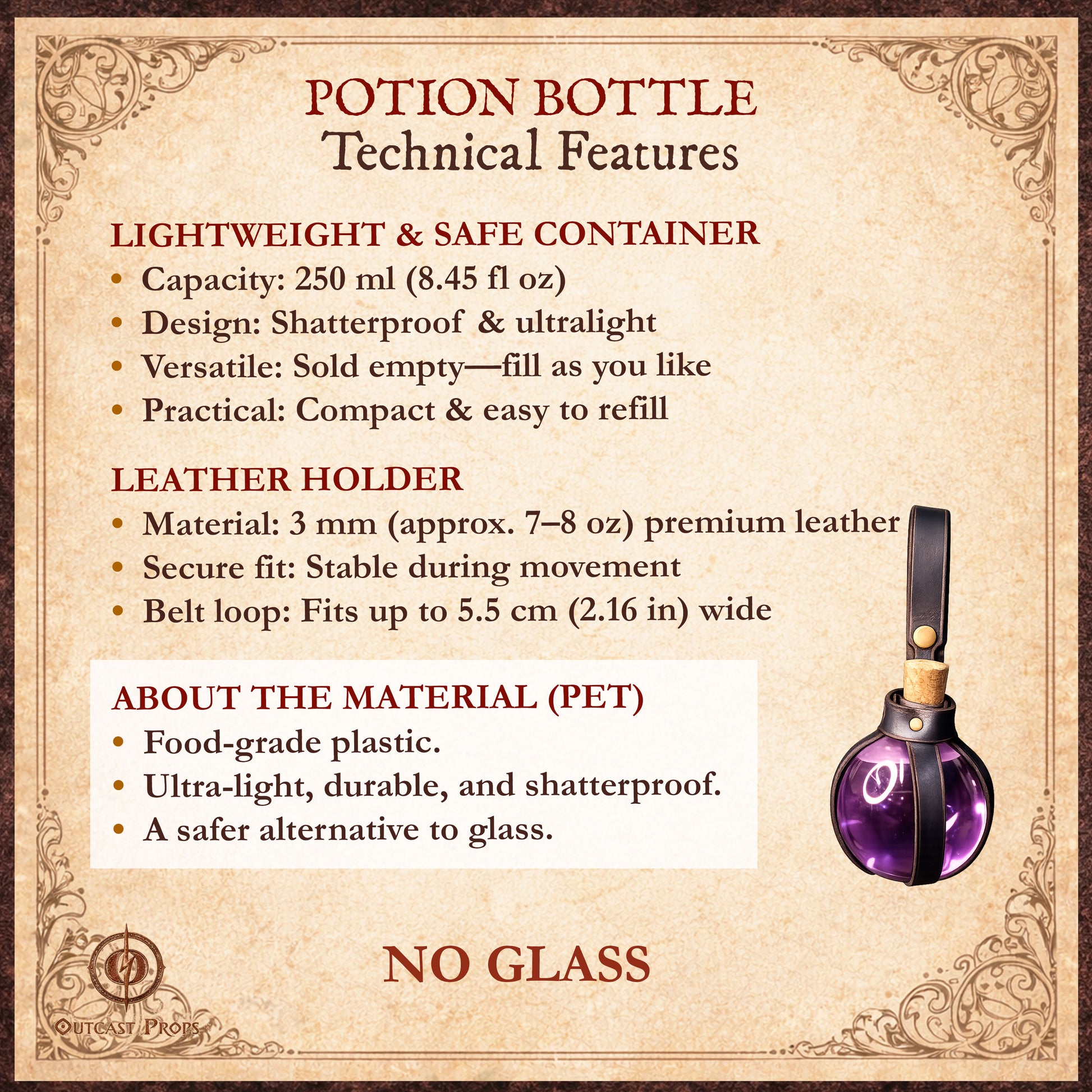 ✨ Lightweight fantasy bottle with leather holder designed for everyday use, decoration and costume accessories.