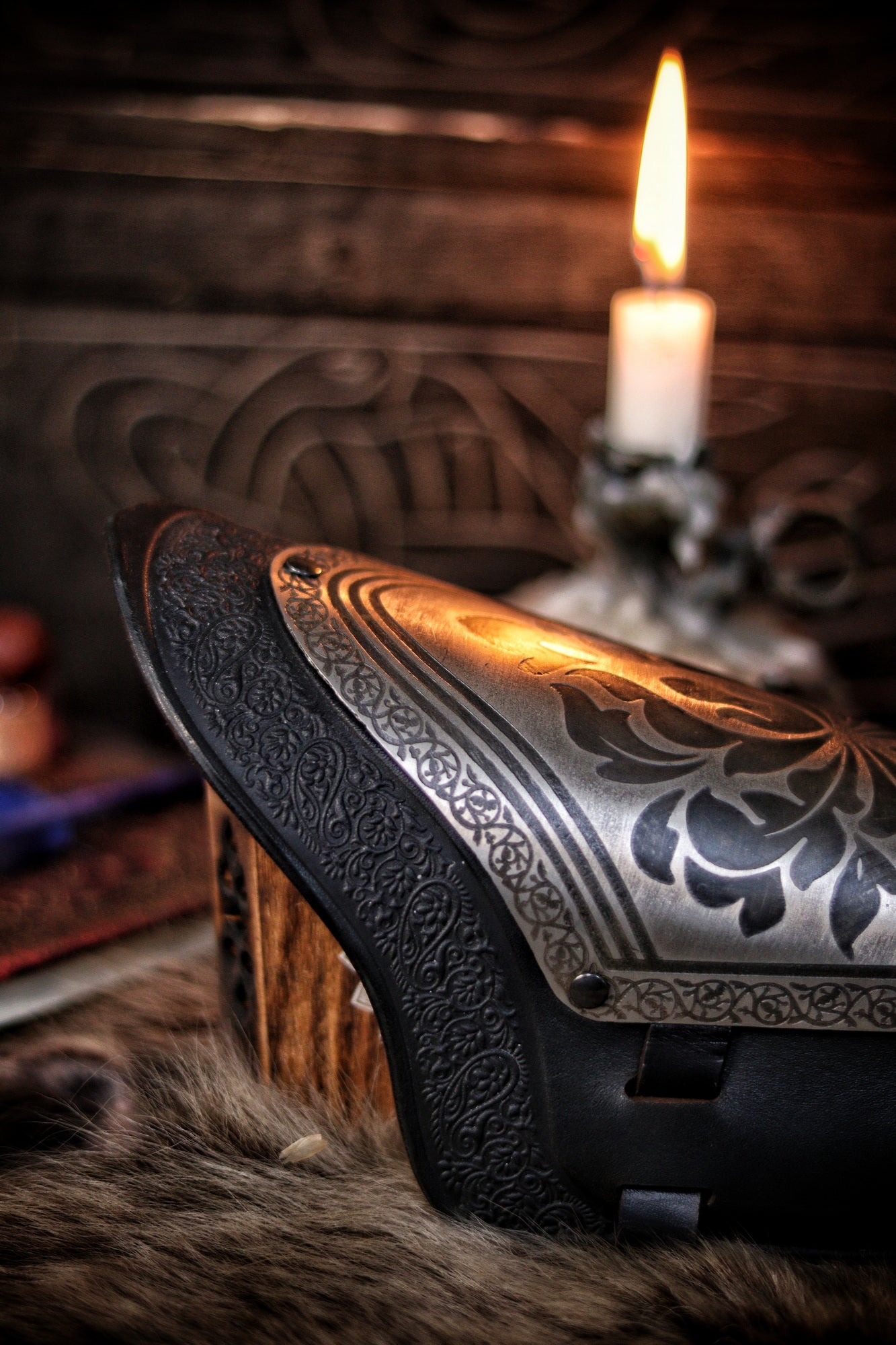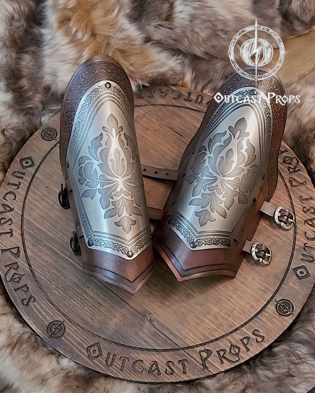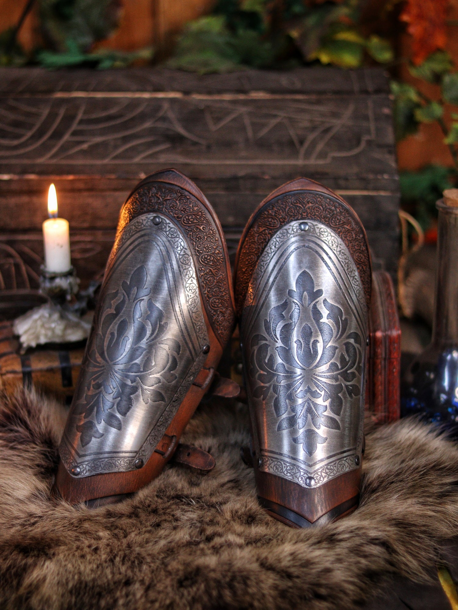 Leather bracers medieval knight costume larp armor noble cosplay accessory fantasy vambraces warrior gear engraved metal plate bracer