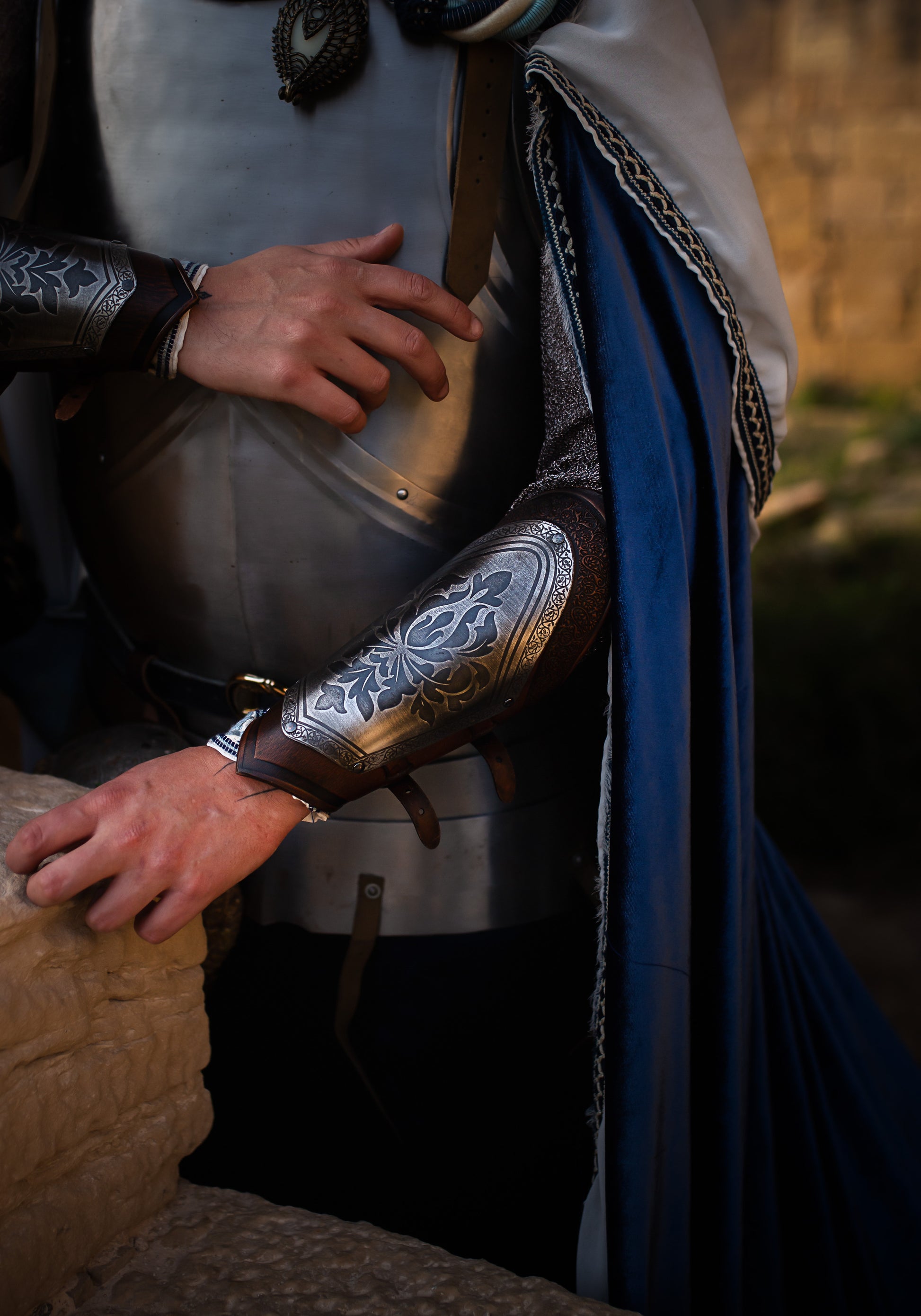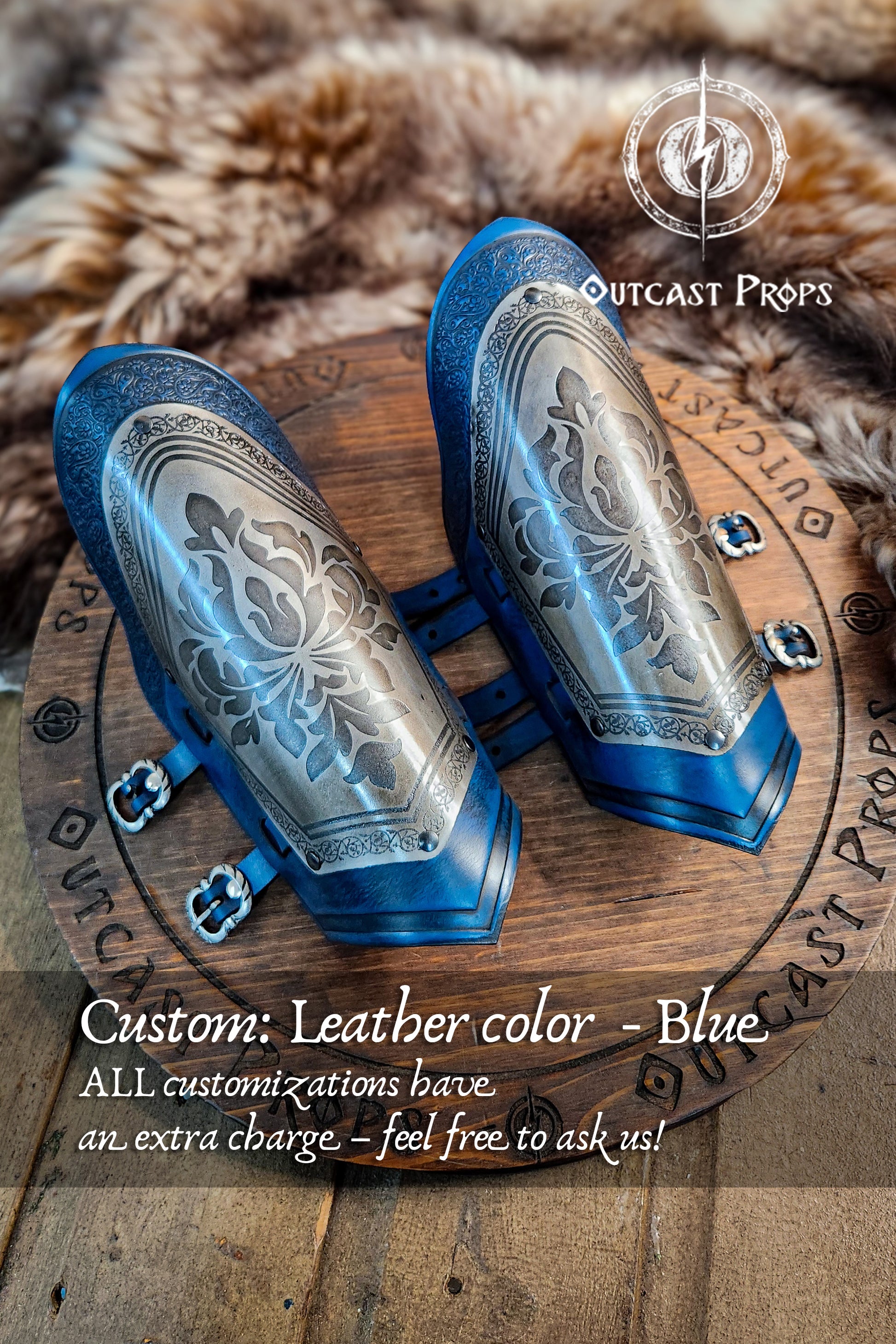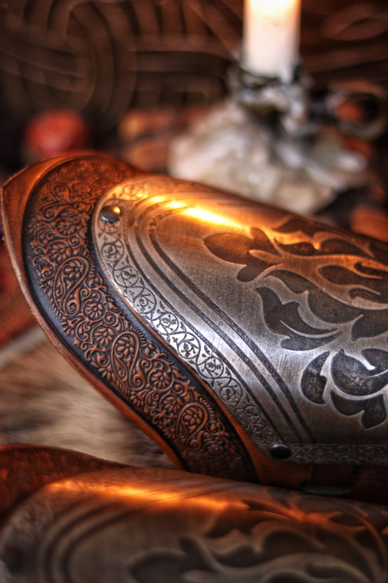 Leather bracers medieval knight costume larp armor noble cosplay accessory fantasy vambraces warrior gear engraved metal plate bracer