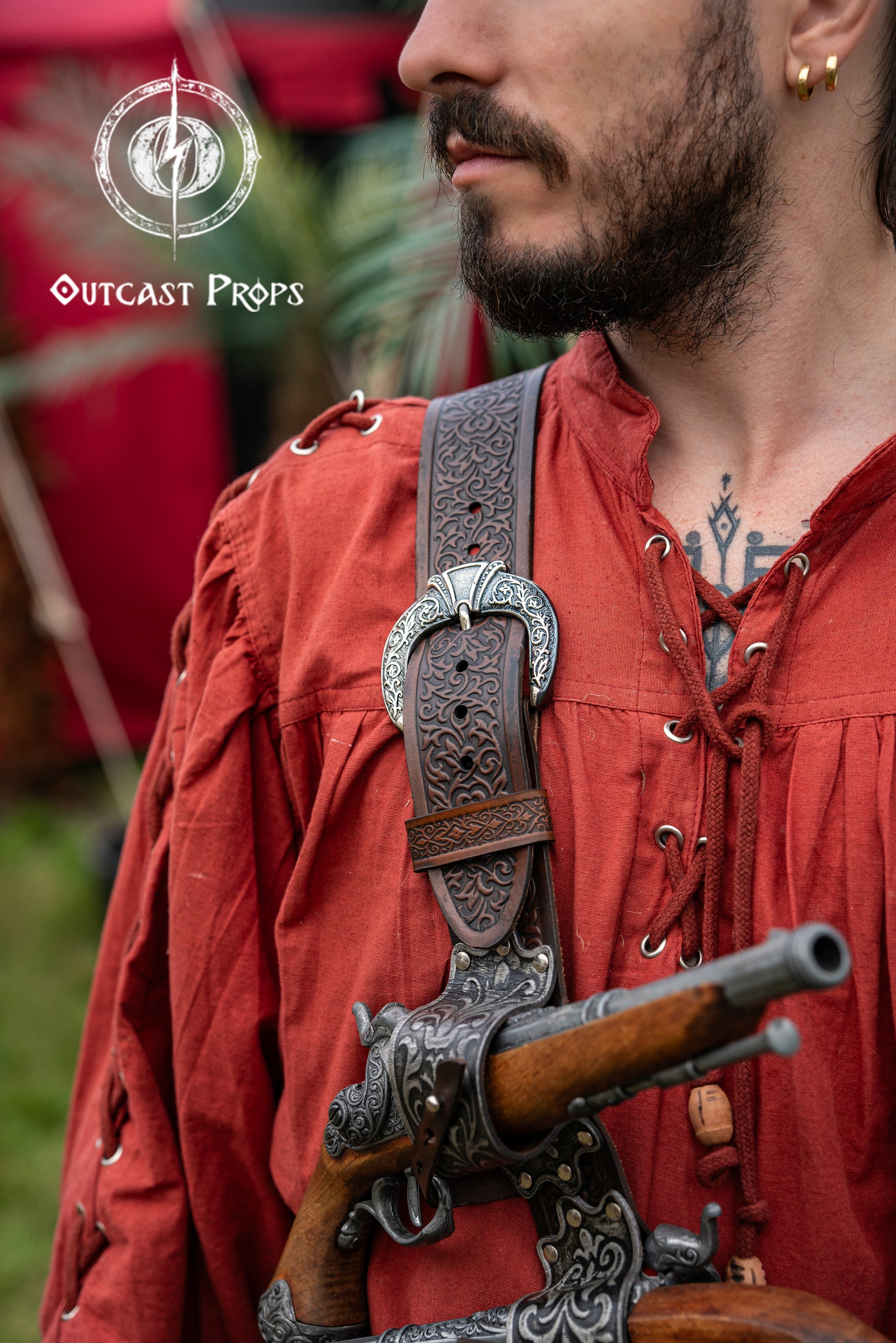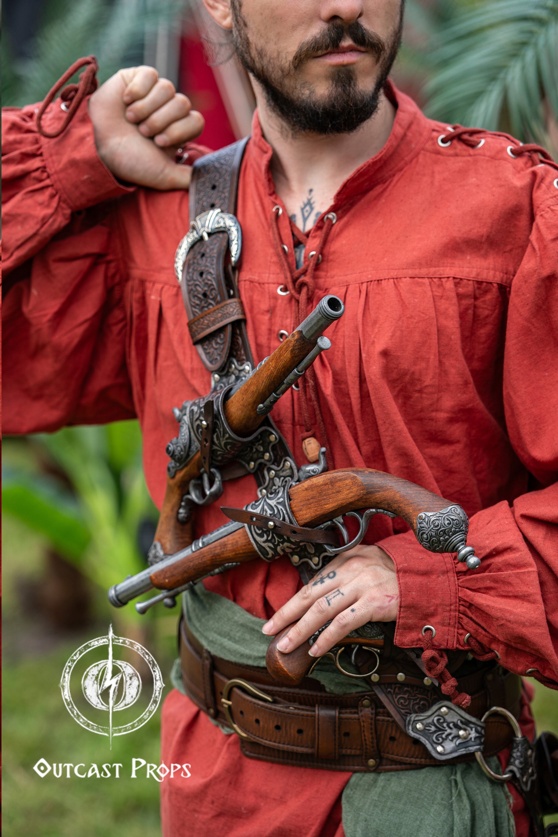 Inspired by legendary buccaneers, this richly embossed leather baldric lets you carry up to 4 flintlock pistols and a side sword with swagger and deadly efficiency. Designed not just as a costume piece but as a fully functional gear system, it follows the logic of real historical use: pirates would fire their single-shot pistols at range, then discard them quickly to avoid excess weight. The two upper holsters allow you to draw a pistol in each hand at the start of the fight. Another little one in the baldric. The last pistol is kept near your left hip, ready for a final close-range shot while you draw your sword with your dominant hand. The back ring is meant to attach to your belt for stability during movement and combat.