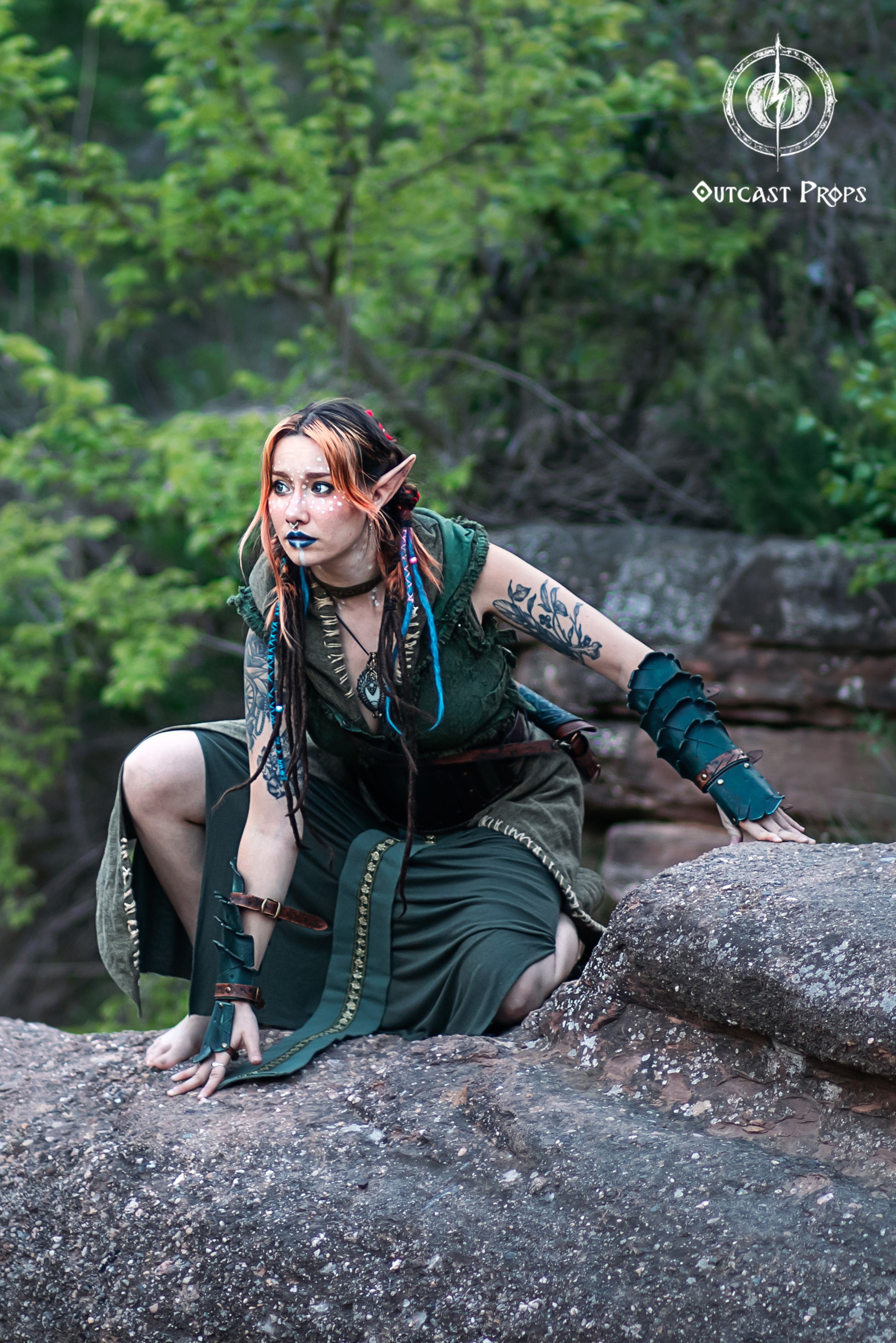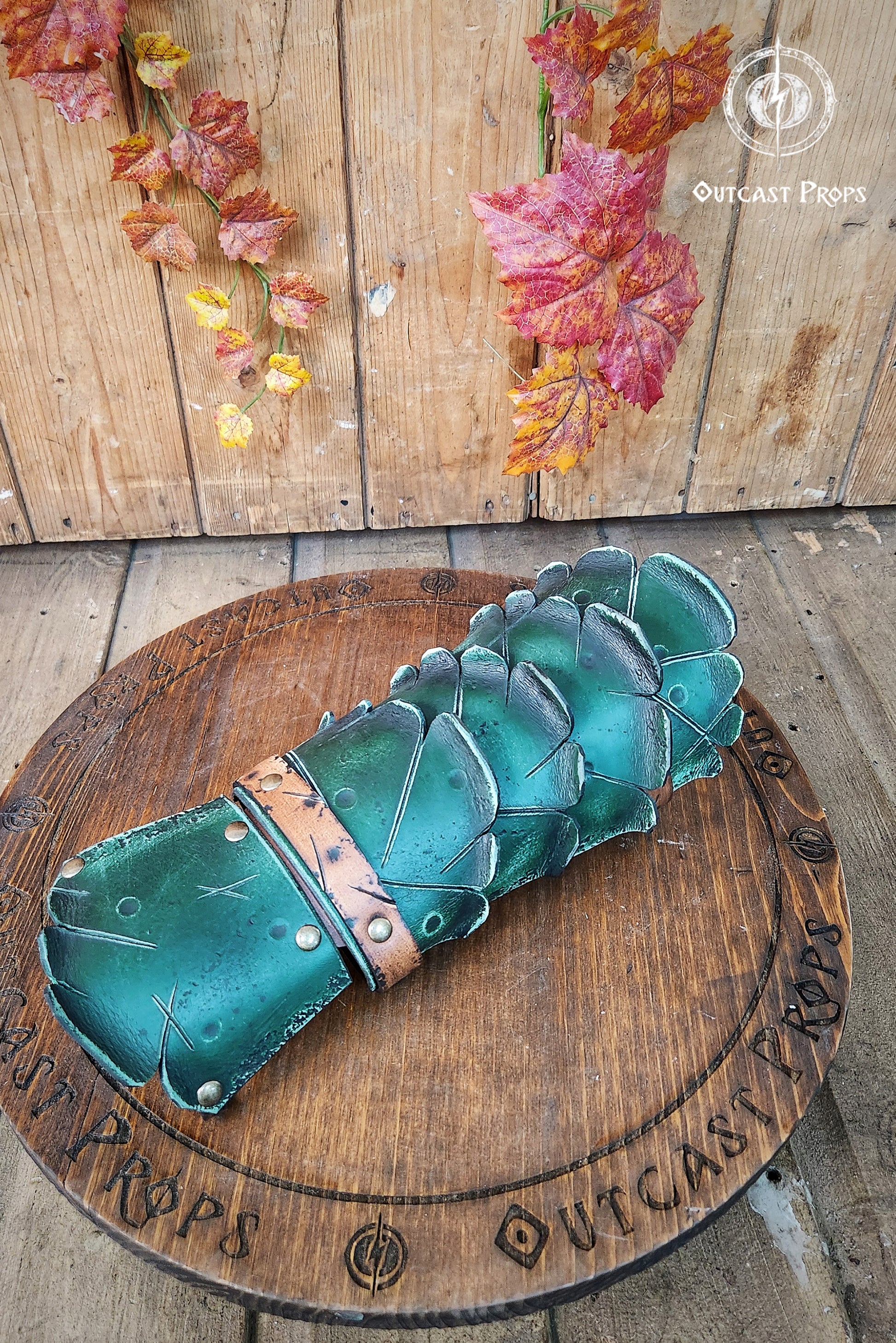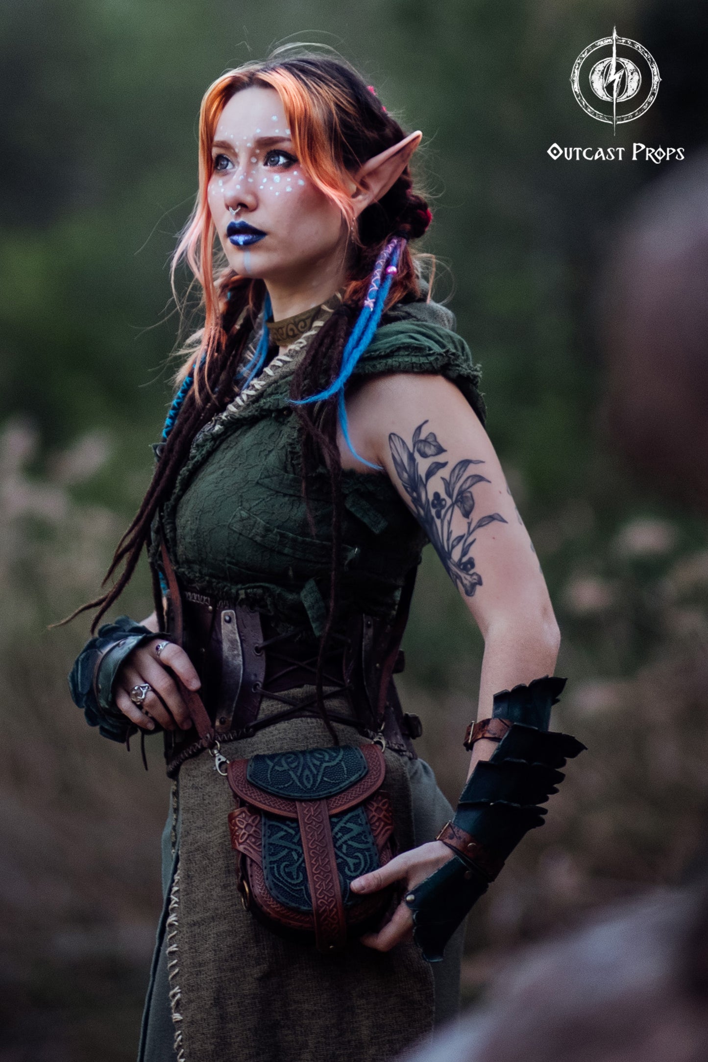 This vambrace has a great personality and will undoubtedly be an essential piece to customize your equipment. This is dyed in green colour, but we can also make autumn rangers (brown, red and yellow colours)