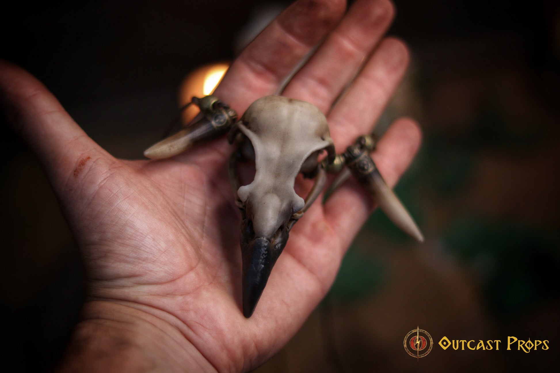 An impressive necklace that blends the macabre with the elegant, the Raven Skull Bone Necklace with Gold-Capped Fangs is a resin artwork that captures the essence of mystery and the ancient. This unique necklace features a meticulously detailed raven skull, whose shadows and textures evoke a sense of enigma and power. The large fangs, adorned with gold caps, add an elegant touch, making this accessory a bold statement of style.