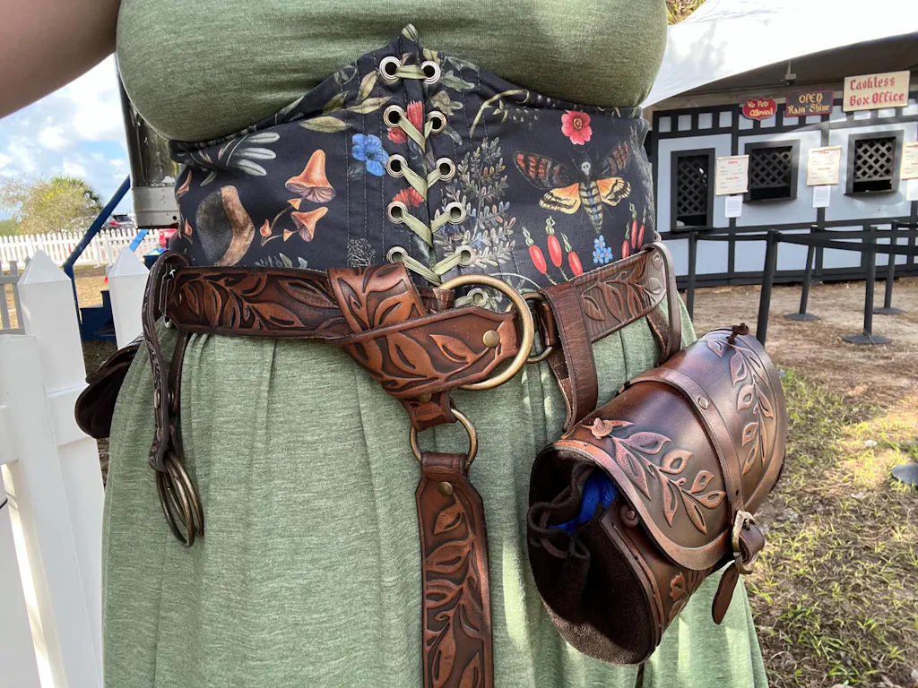 Add a touch of elegance and utility to your Ren Faire or fantasy outfit with this handcrafted three-piece leather set. Featuring a long belt with O-rings, a matching leather pouch, and two skirt hikes, all decorated with our signature floral tooling. Designed for Ren fair lovers, LARPers, and fantasy fans who want to look epic and stay practical — whether you're roaming the woods, working a booth, or dancing by torchlight.
