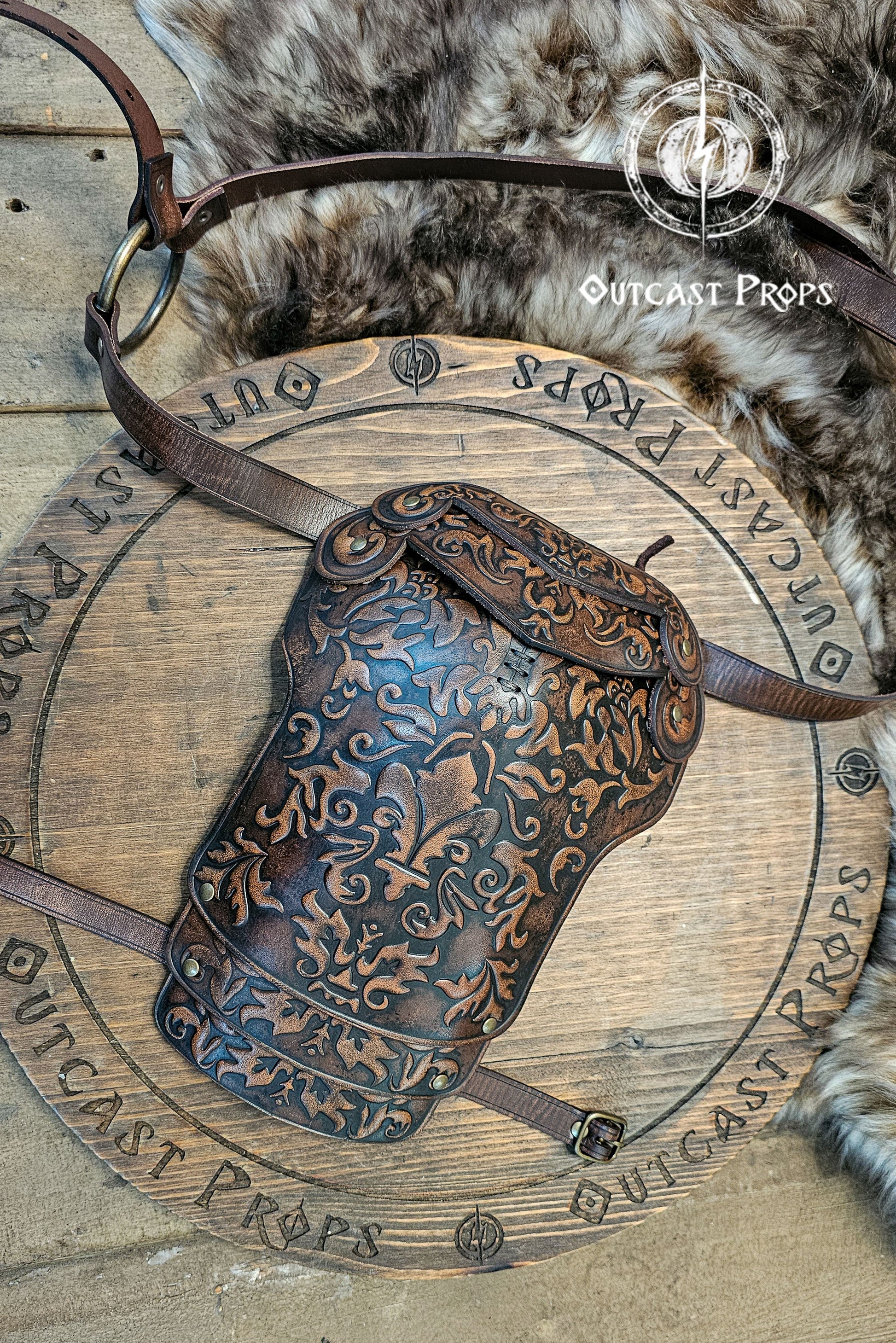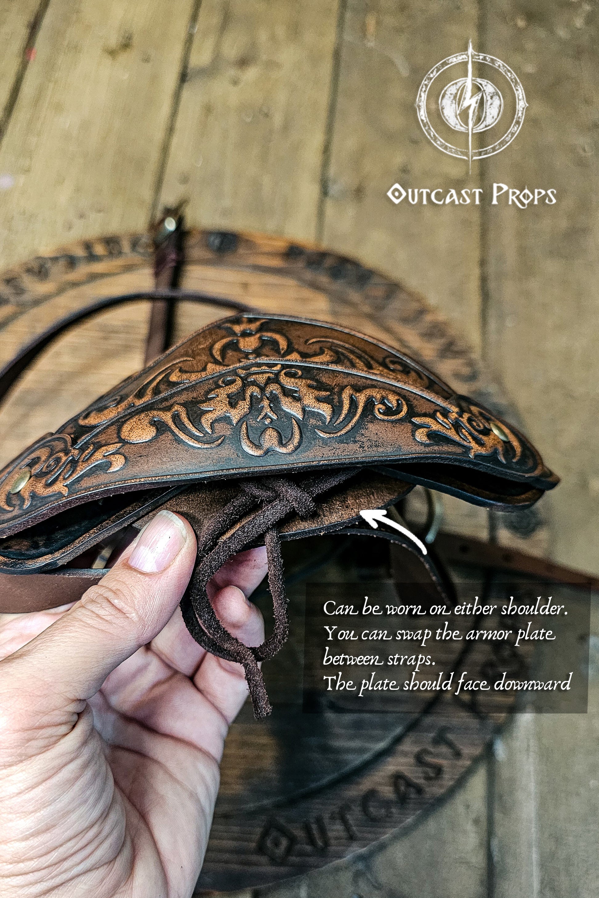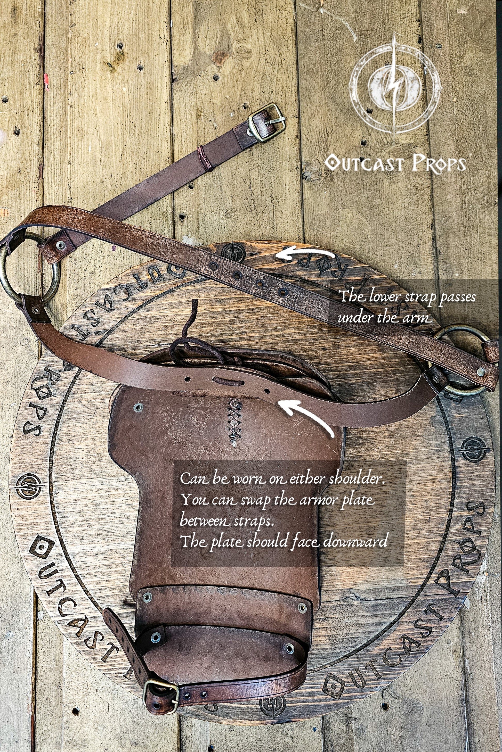 1. The upper strap is the one that supports the embossed armor plate. Use the leather cord to tie the plate securely to this strap through the holes. Make sure the embossed plate is facing downward, not upside down, and attached to the correct strap.