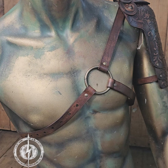 This piece can be worn on either shoulder. There are two leather straps with holes that hold a metal ring — refer to the images for clarity.