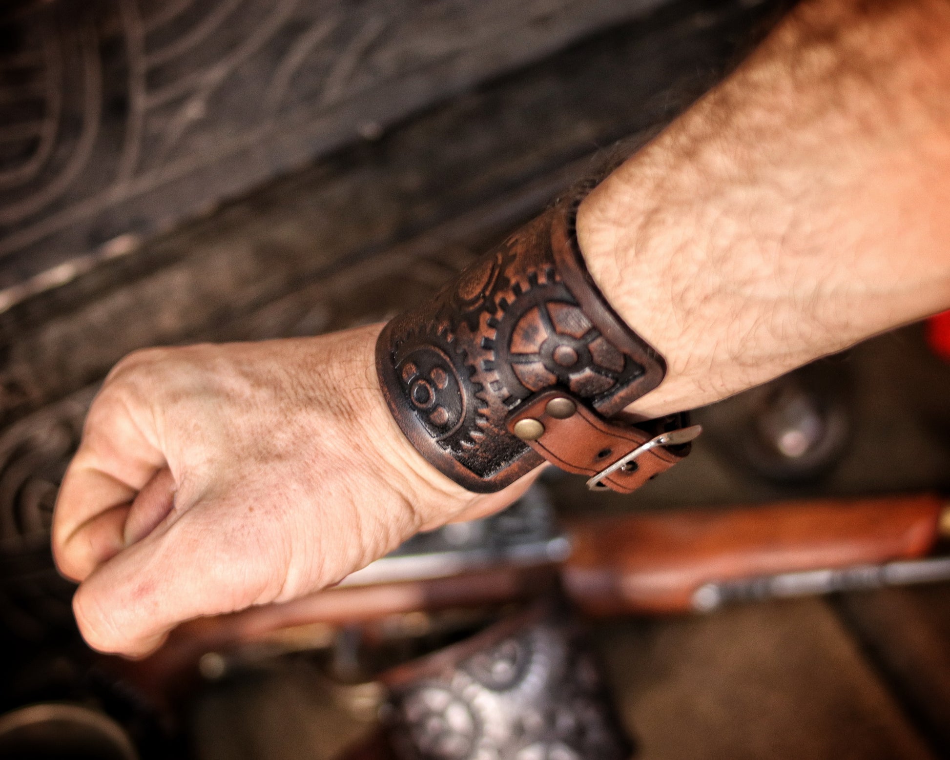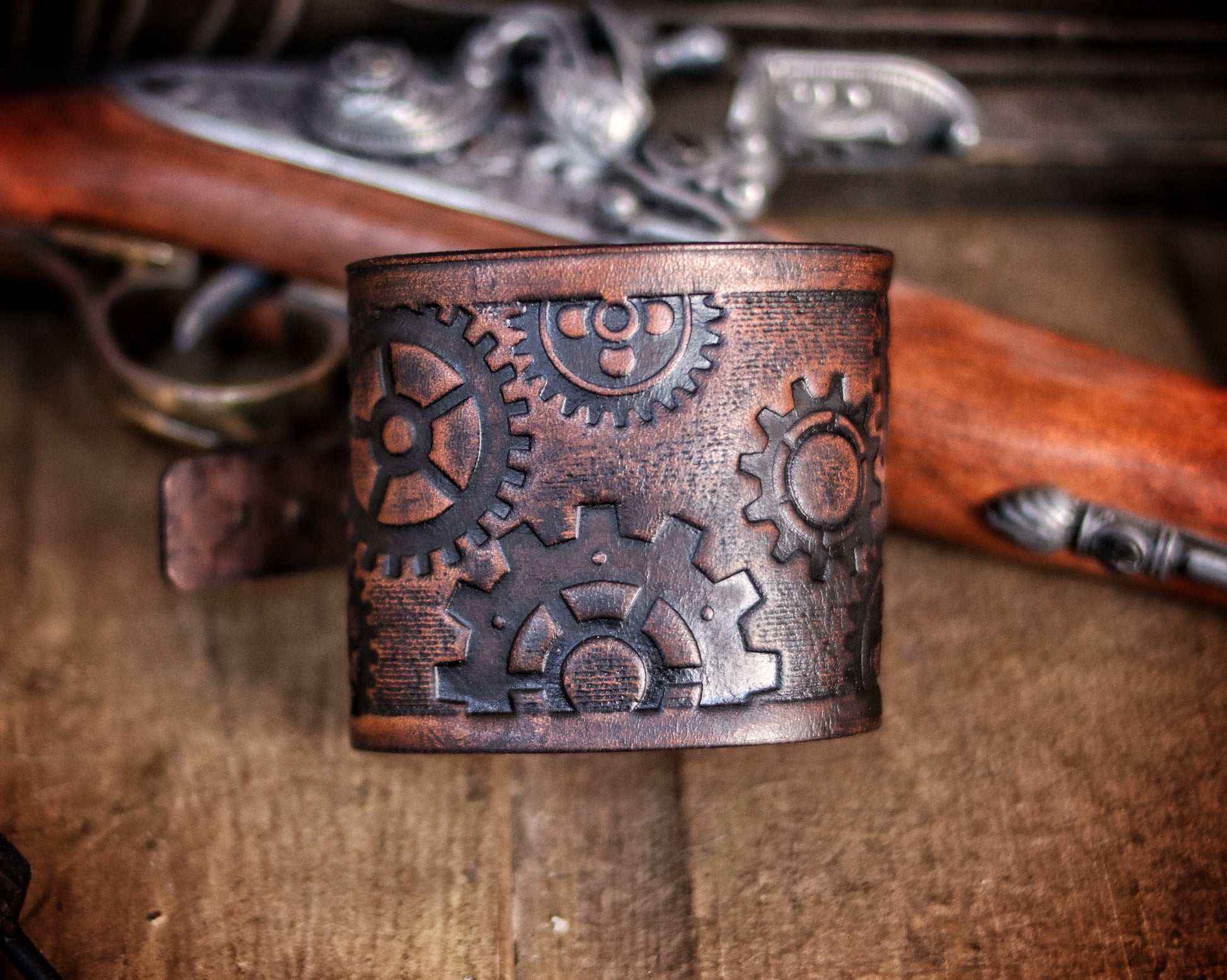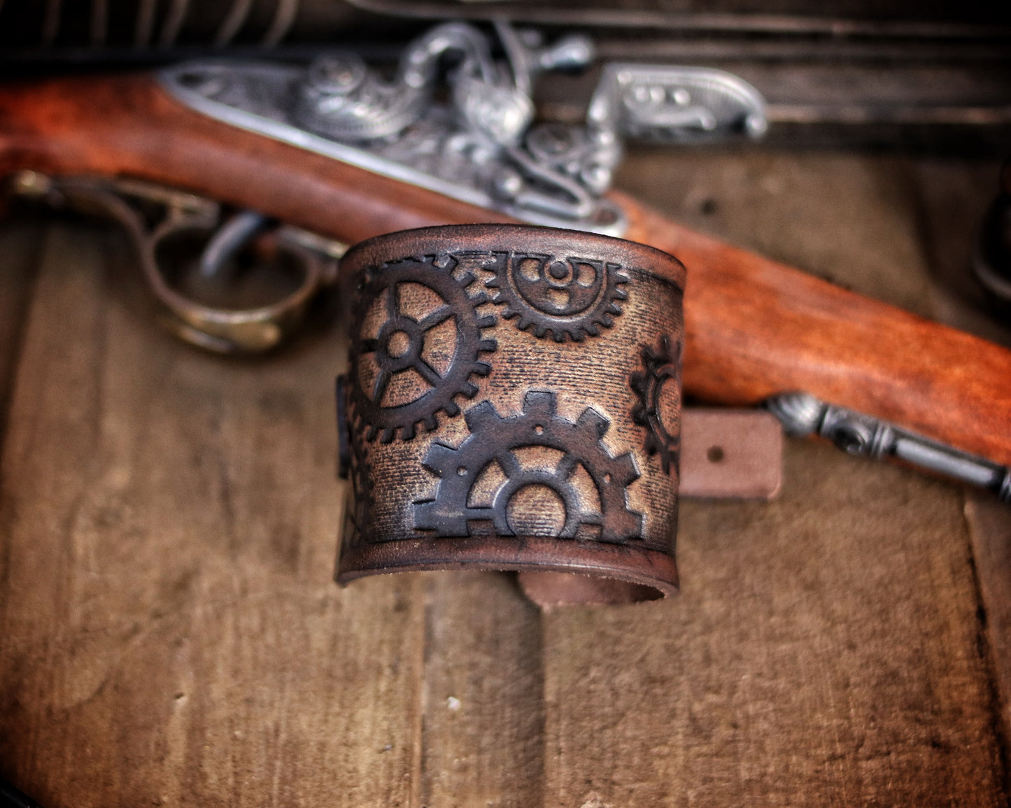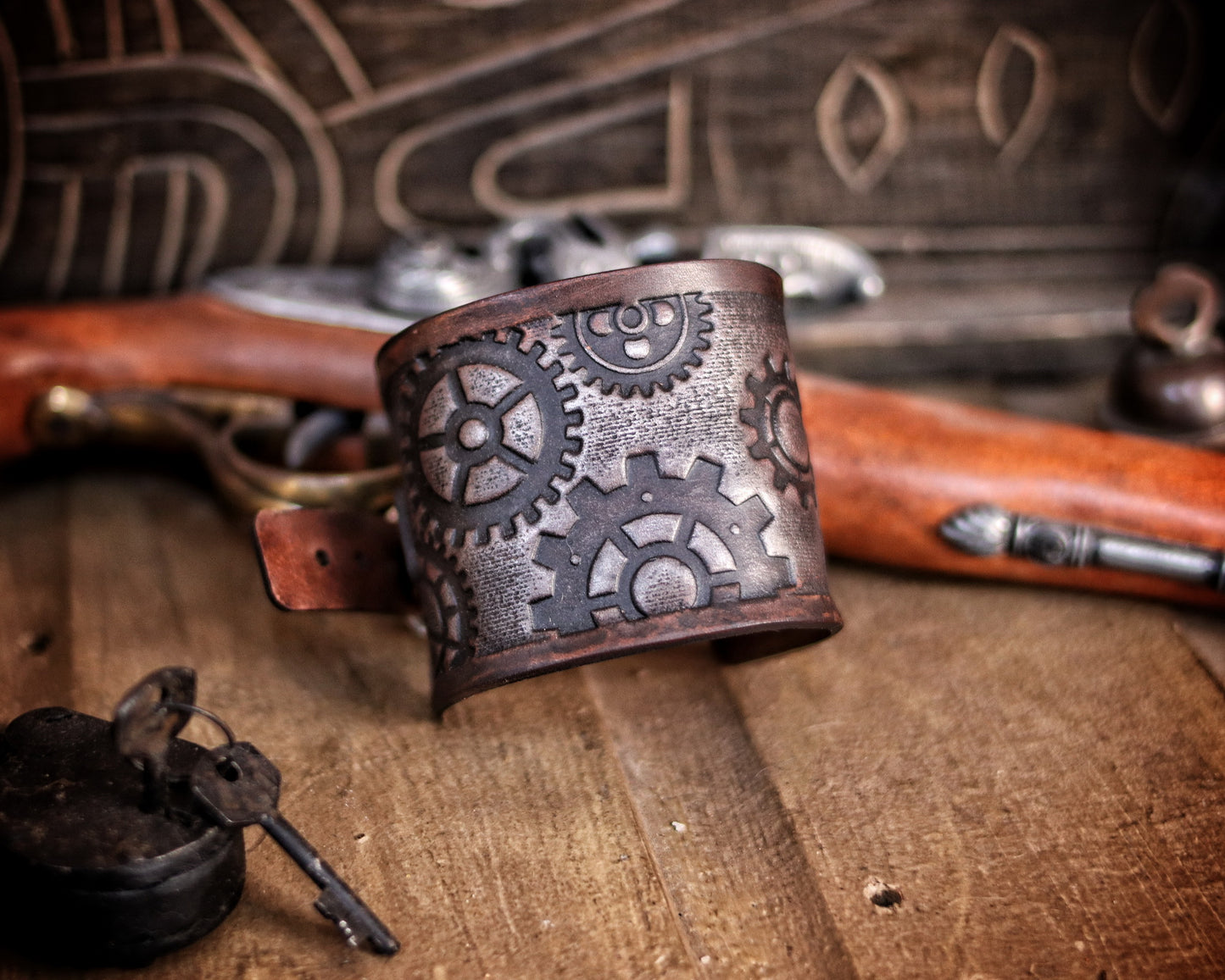 Steampunk Leather cuff bracelet with engine gears motifs, made of full-grain premium leather. The original design of the engine gears is carefully embossed on the piece, which has been subjected to a handmade aging process identical to those used in Hollywood movies, so that the piece seems directly drawn from an epic fantasy story.