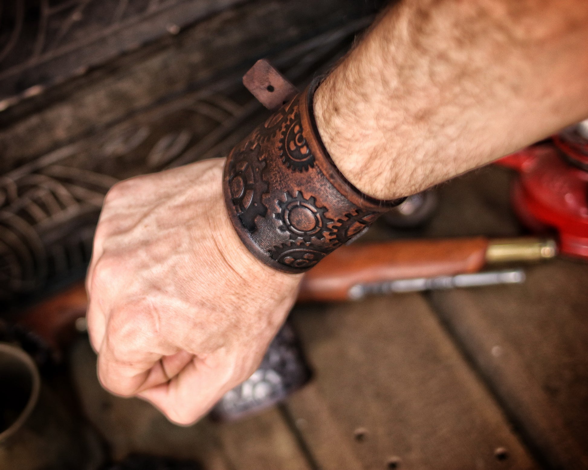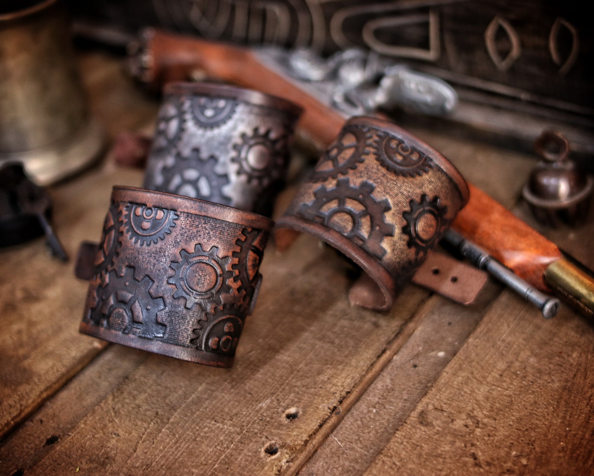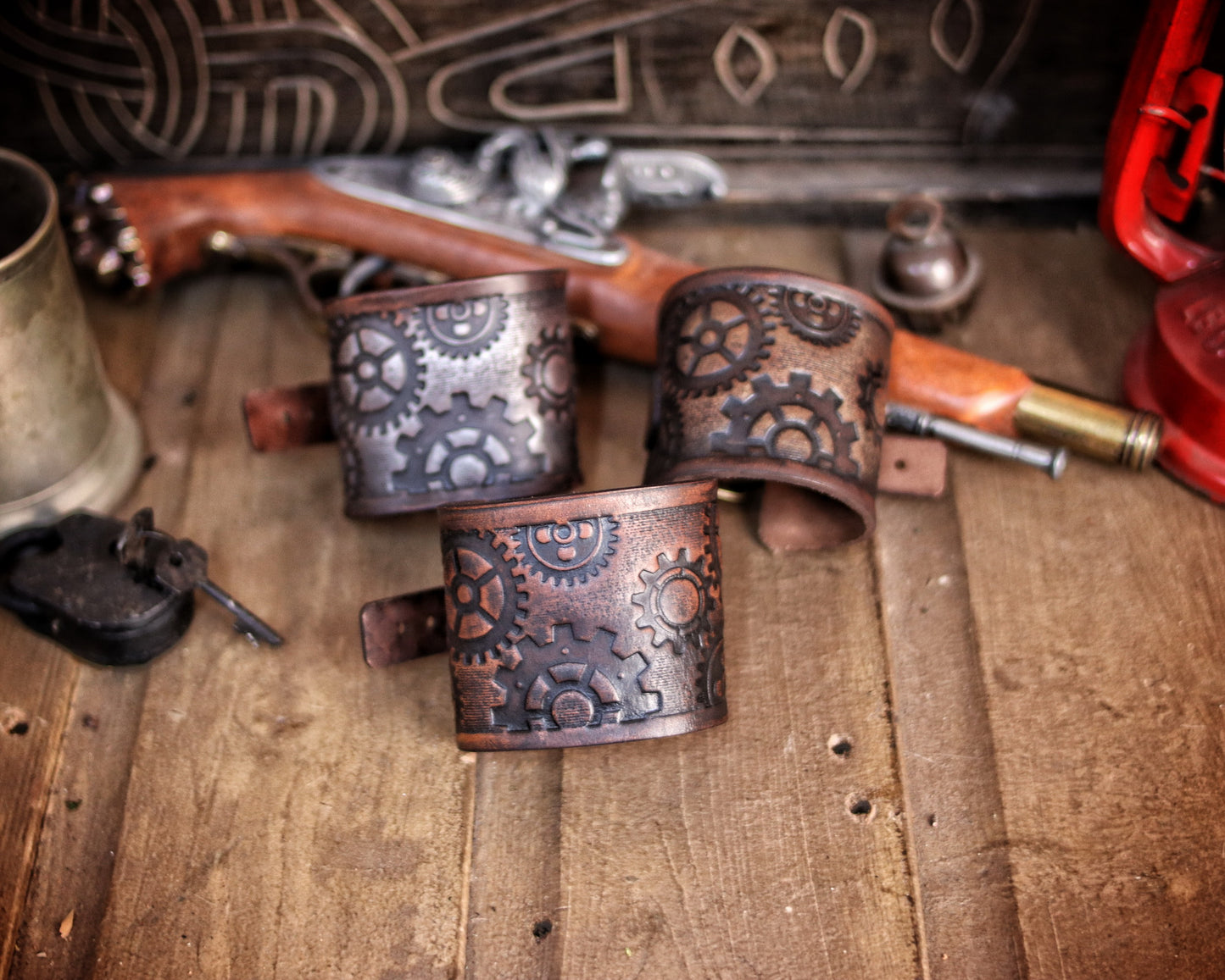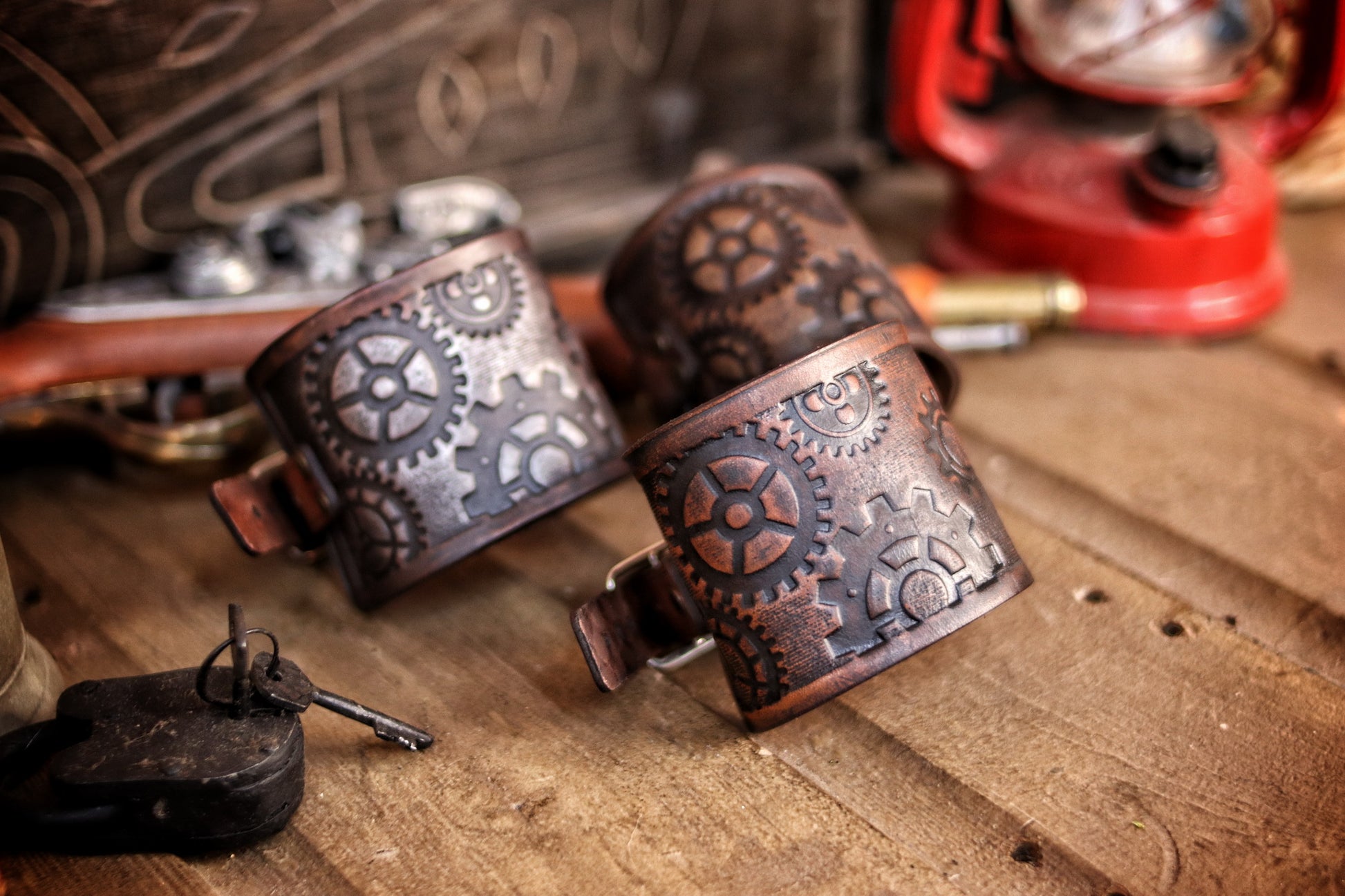 Steampunk Leather cuff bracelet with engine gears motifs, made of full-grain premium leather. The original design of the engine gears is carefully embossed on the piece, which has been subjected to a handmade aging process identical to those used in Hollywood movies, so that the piece seems directly drawn from an epic fantasy story.