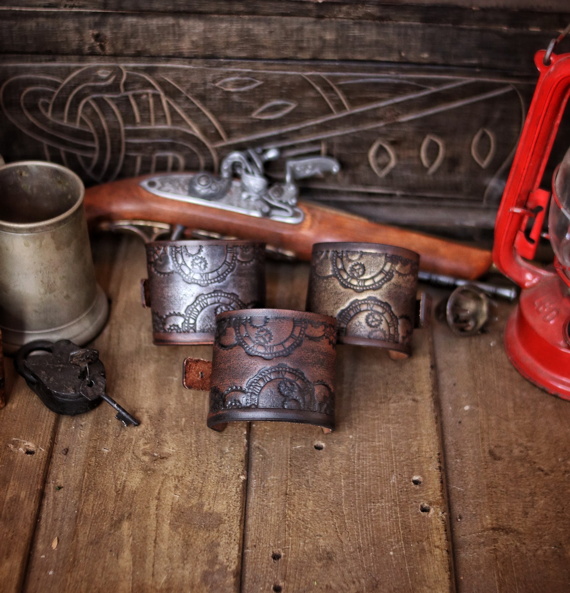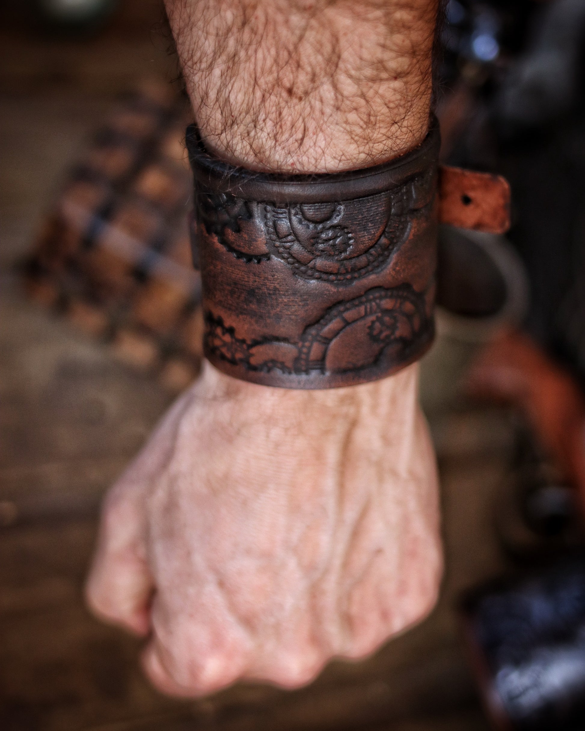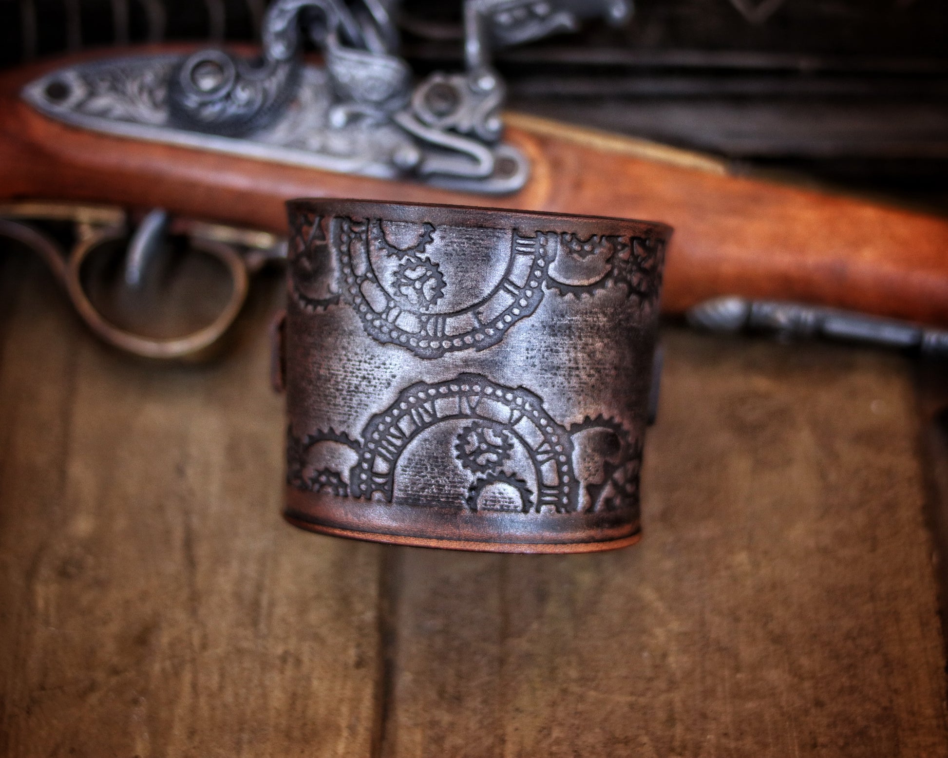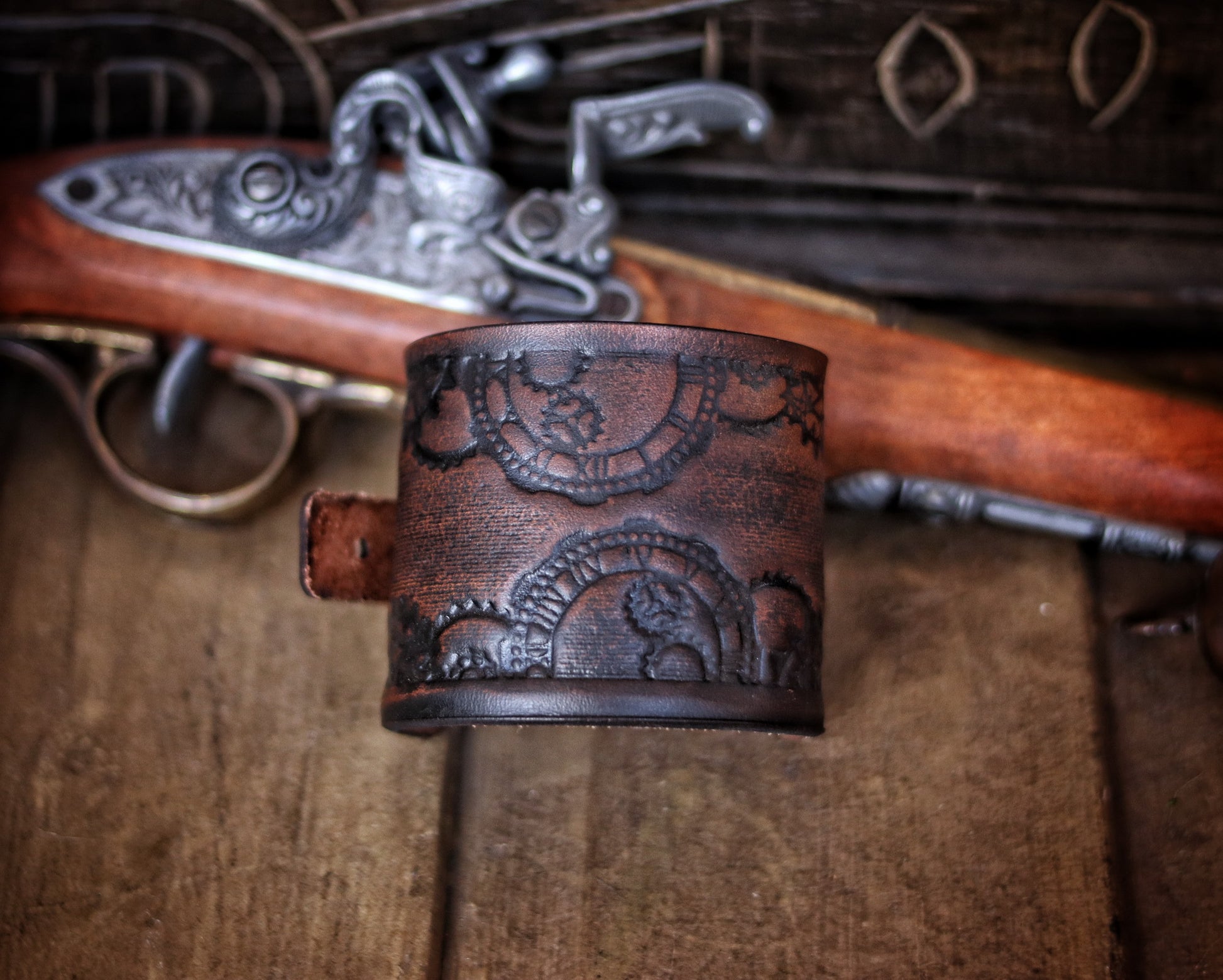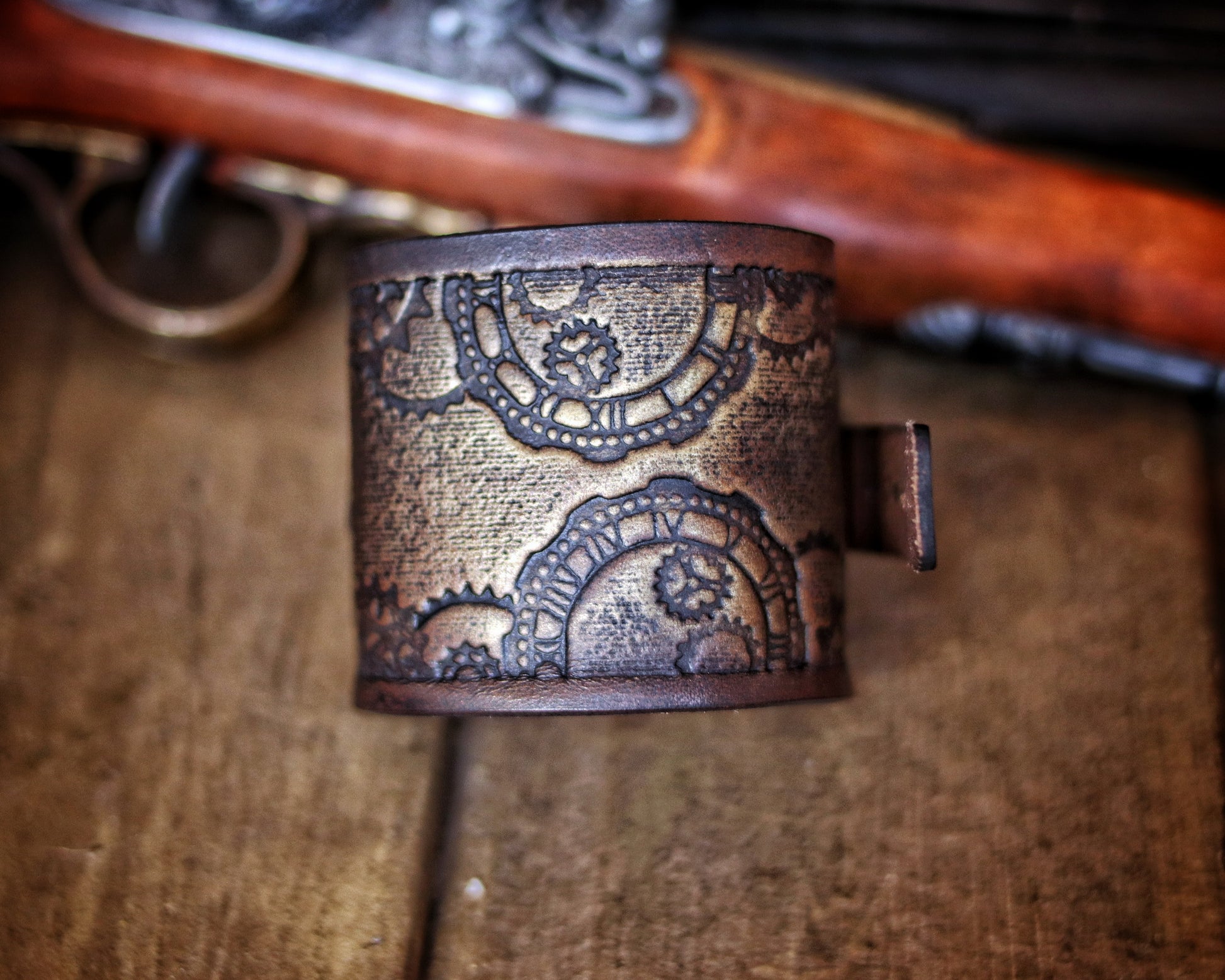 Handmade with meticulous care, each bracelet is crafted from full-grain premium leather, ensuring durability and a luxurious feel. The clock gears motif is carefully embossed on the leather, bringing the intricate design to life. This piece undergoes a specialized aging process, identical to those used in Hollywood movies, to give it an authentic, time-worn appearance that feels as if it's been pulled directly from an epic fantasy tale. The aging process is authentic, adding both character and durability to the leather, making each bracelet truly unique.
