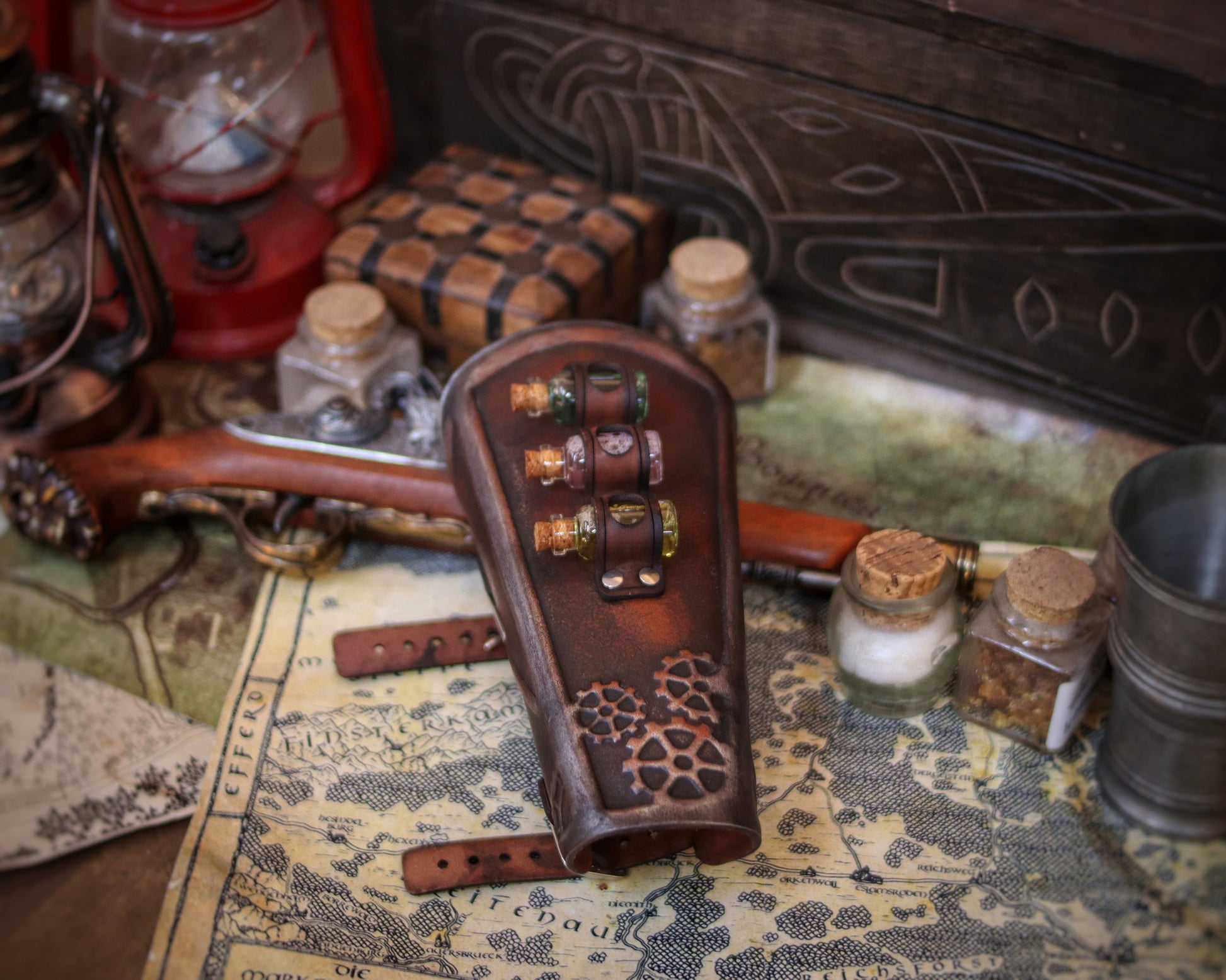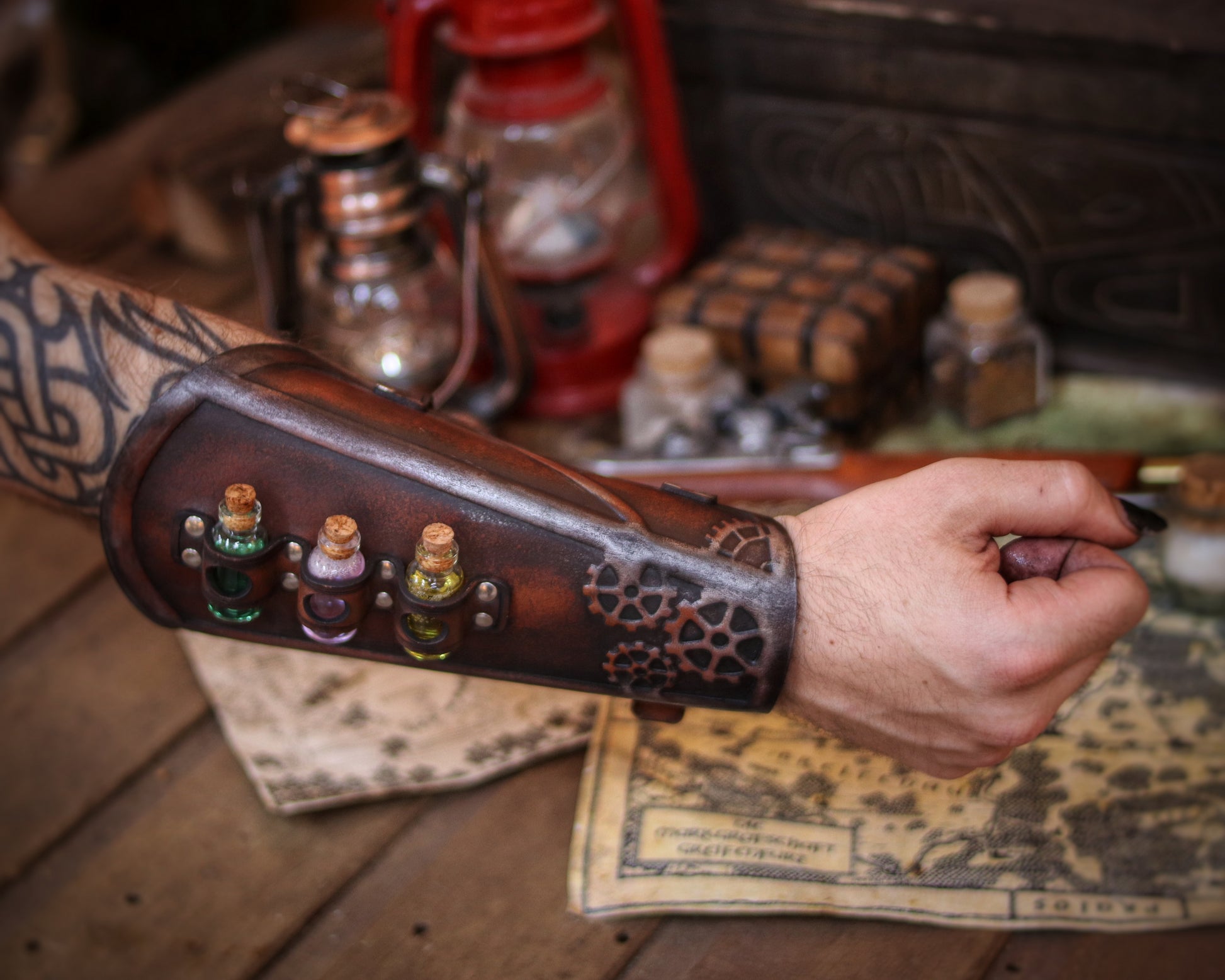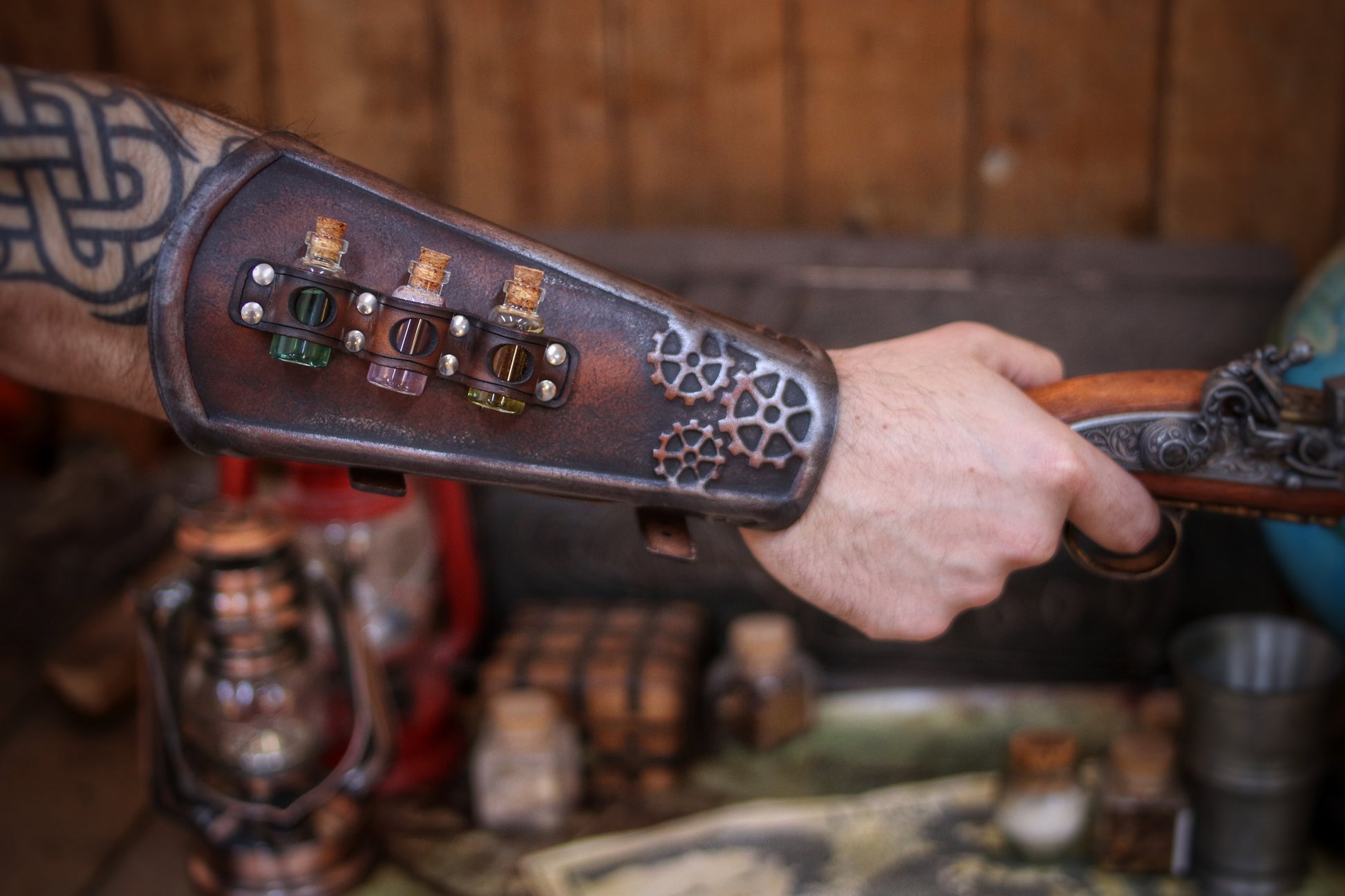 Looking to add a touch of steampunk flair to your character? Our handmade Steampunk-style armband is just what you need. With its adjustable buckle fastening, it can be worn over bare skin or on top of a jacket or trench coat, making it a versatile accessory for any outfit.