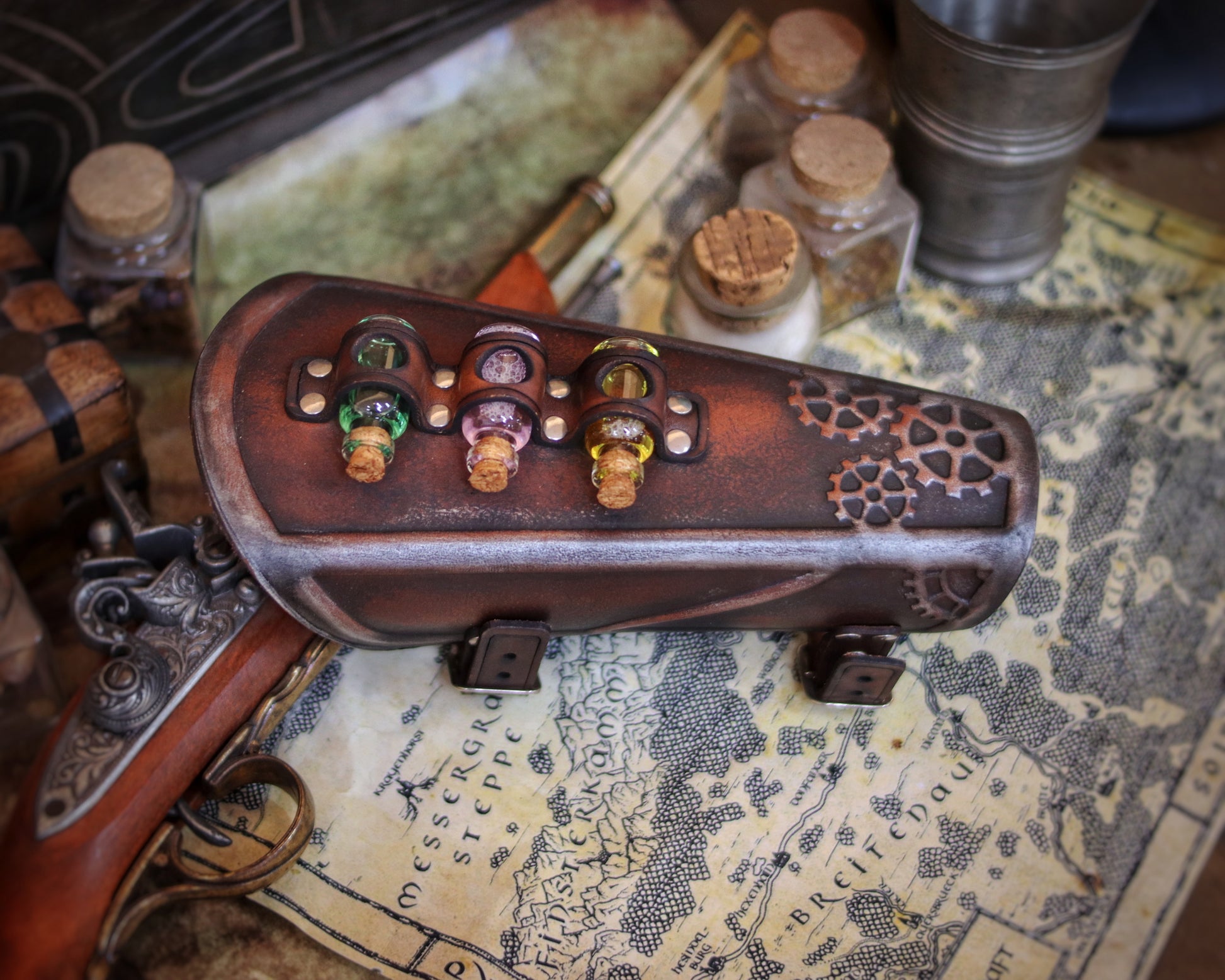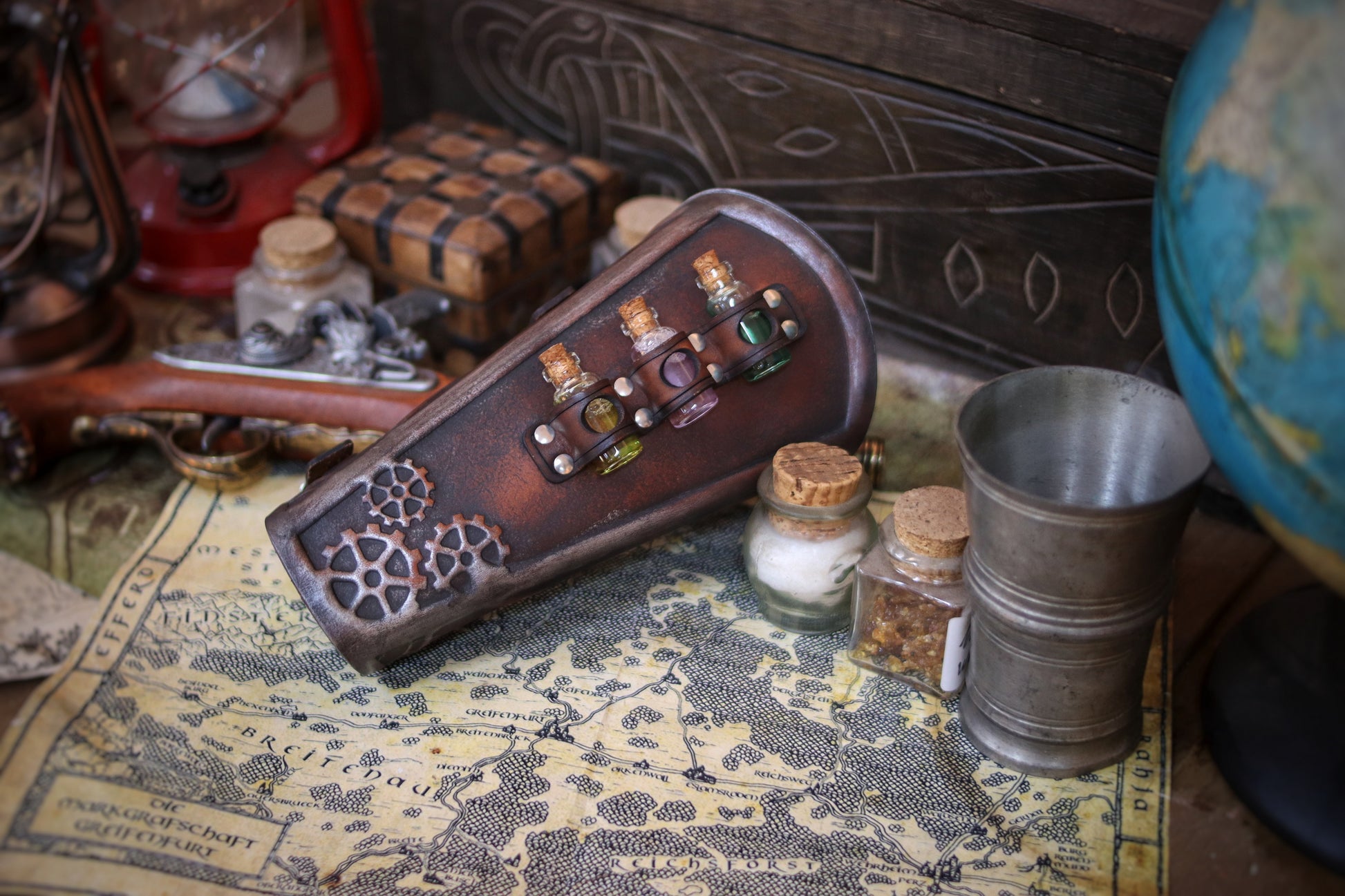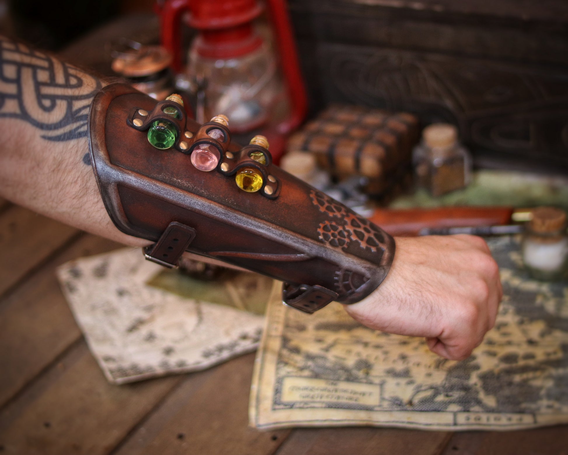 Looking to add a touch of steampunk flair to your character? Our handmade Steampunk-style armband is just what you need. With its adjustable buckle fastening, it can be worn over bare skin or on top of a jacket or trench coat, making it a versatile accessory for any outfit.