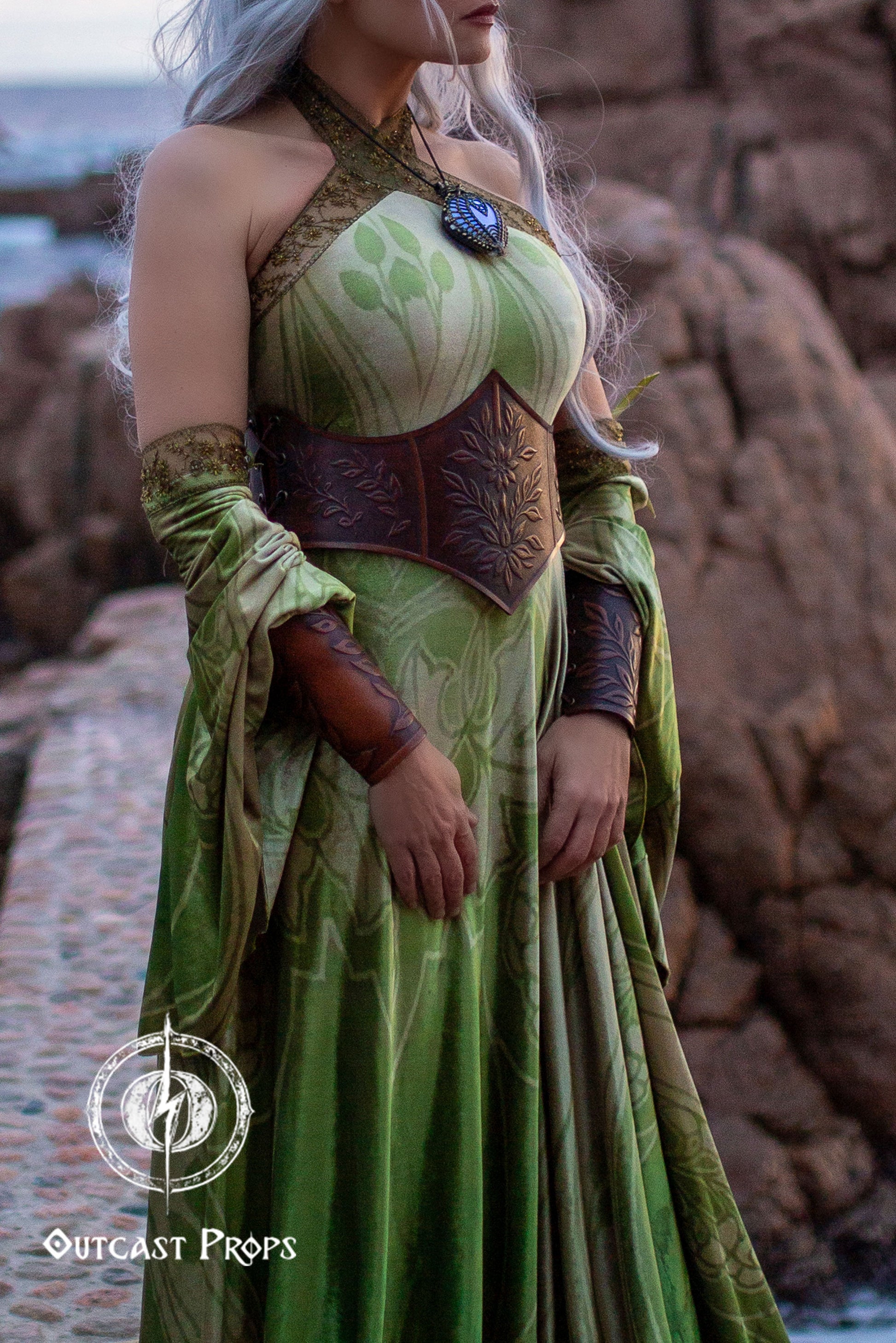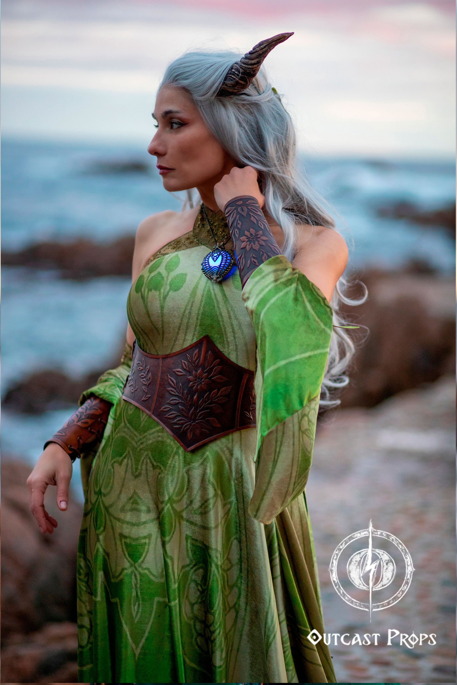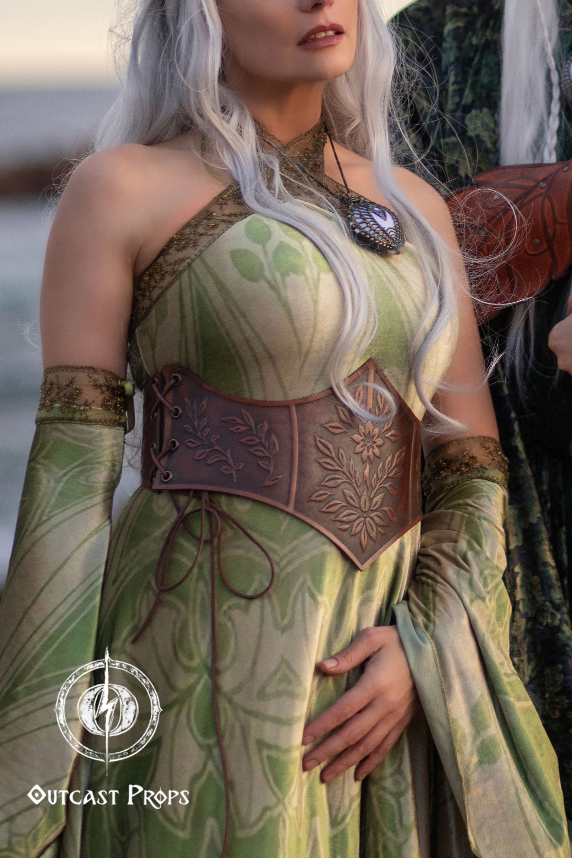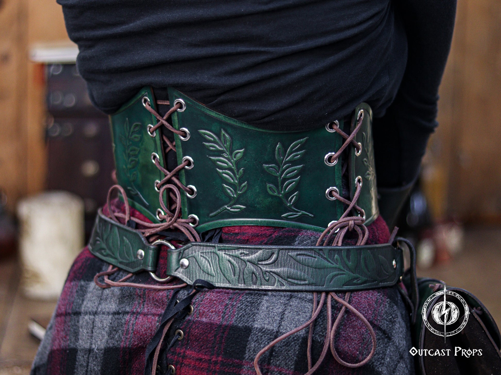 A beautifully shaped underbust corset belt designed to flatter the figure, refine the waistline, and enhance the bust with effortless elegance. Inspired by elven grace, herbalist attire, wandering witches, noblewomen of the court, and characters who blend beauty with strength, this piece adapts seamlessly to skirts, dresses, trousers or layered fantasy outfits. Made from premium vegetable-tanned leather and sculpted with hand-tooled floral motifs, it creates a silhouette that feels both powerful and enchanting. Treated with Outcast Props’ unique aging techniques and epic painting, every corset achieves a cinematic finish worthy of Renaissance faires, LARP adventures, historical reenactment and fantasy cosplay.