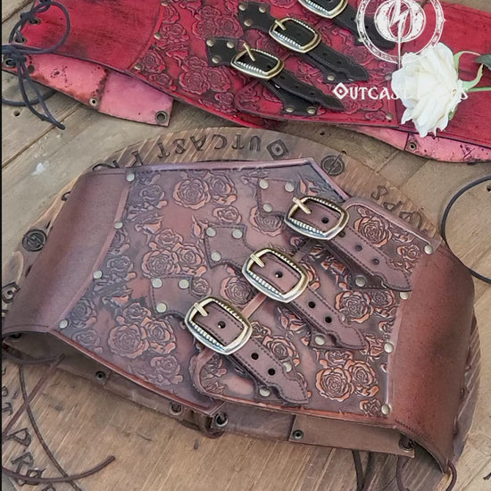 An underbust corset belt that embodies elegance and strength, crafted from premium vegetable-tanned leather and embossed with blooming roses. Every detail of the floral relief is highlighted by hand-applied pigments, giving the design depth and refinement. Treated with Outcast Props’ unique techniques and epic painting, it achieves a cinematic finish that feels noble and timeless. Whether in deep crimson for dramatic roles, or in black, brown, or green for refined nobles and characters inspired by roses and flowers, this corset elevates any LARP, Renaissance Faire, or fantasy costume with grace and presence.